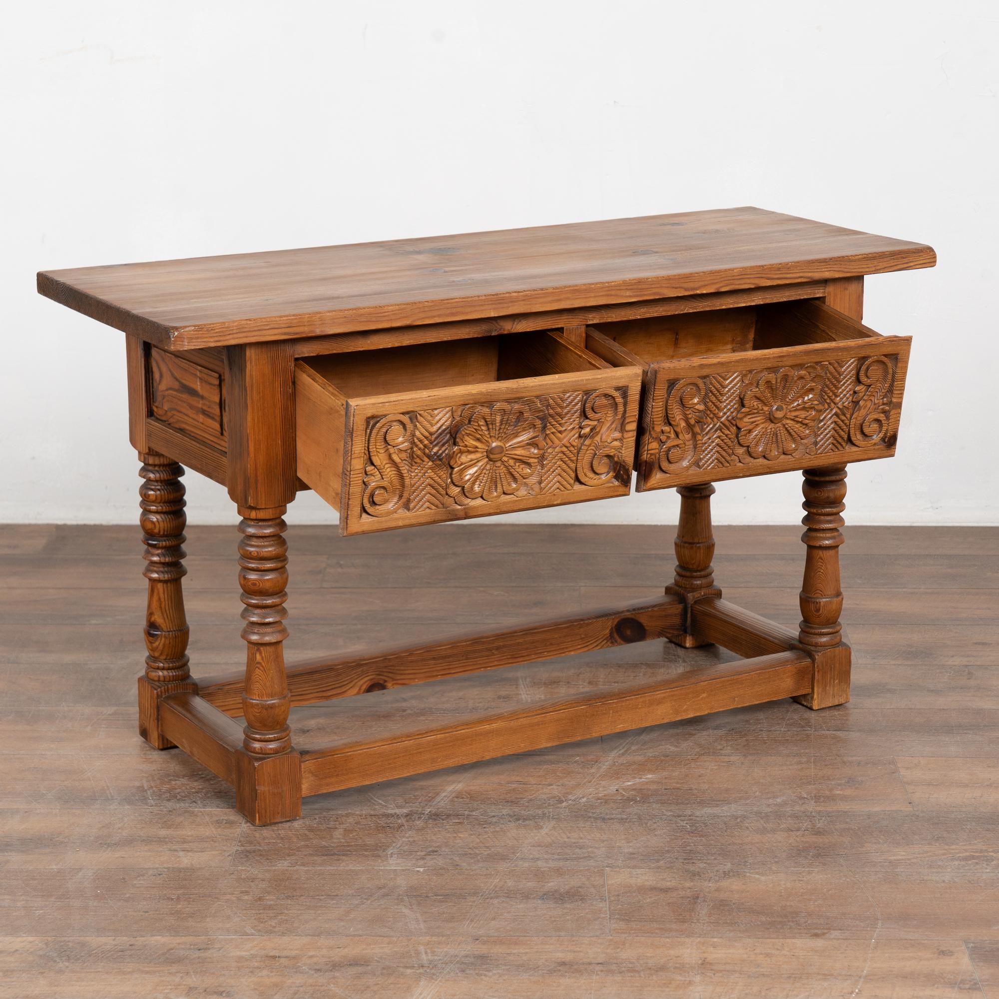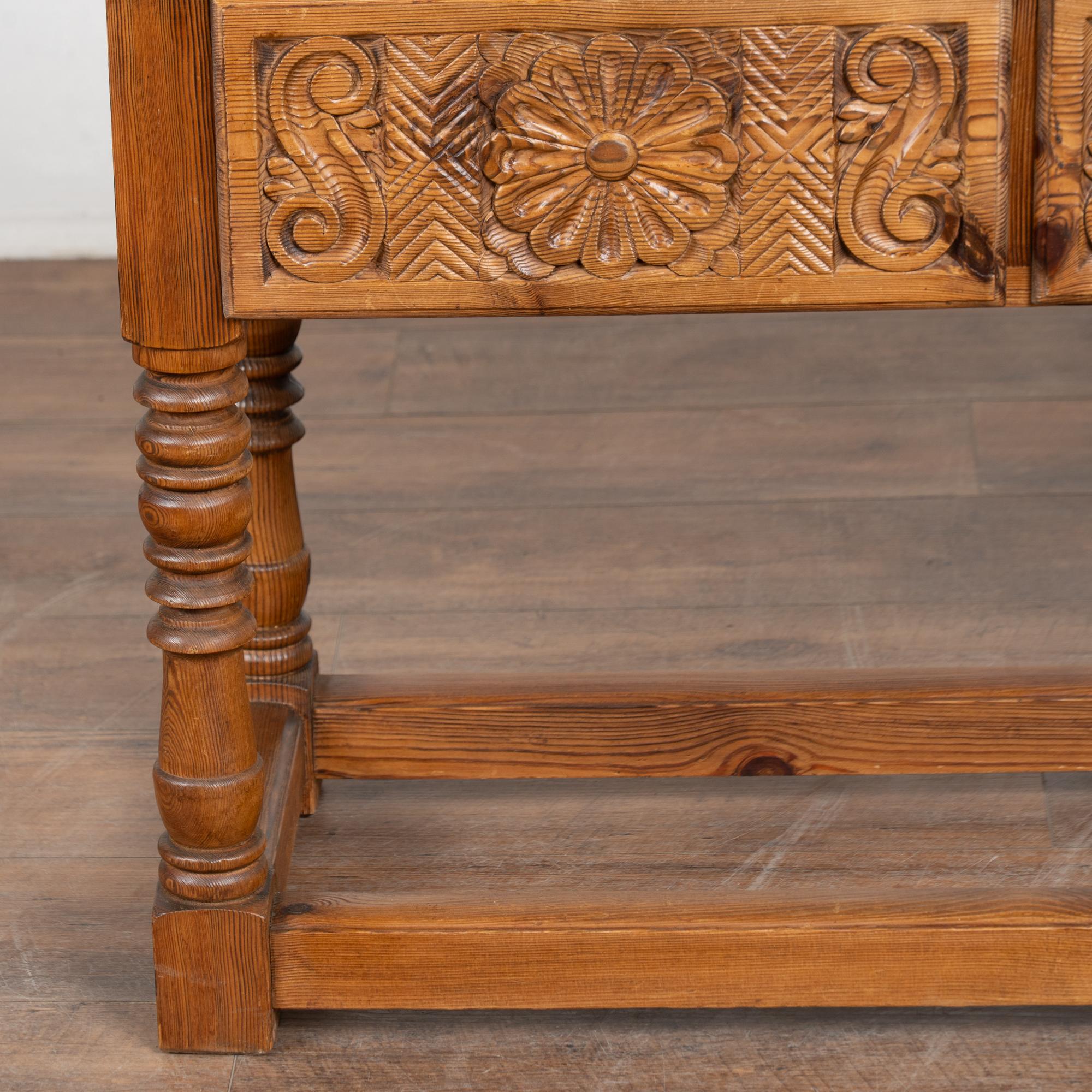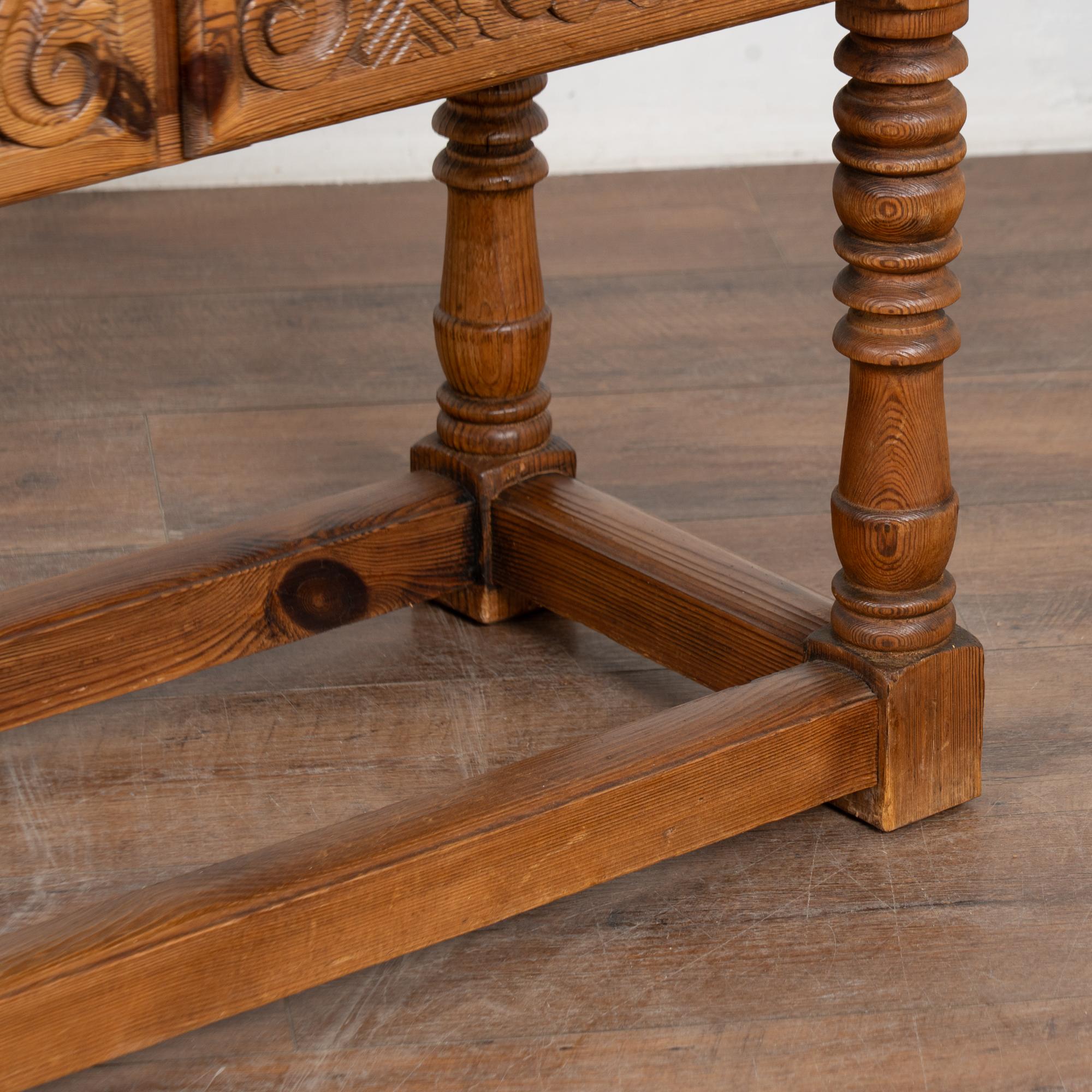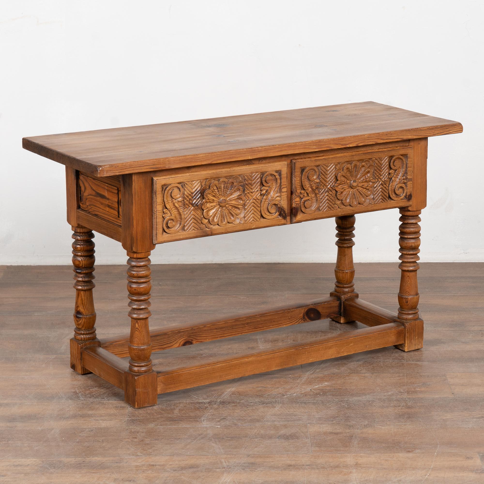 20th century Swedish small console side table constructed of mixed woods, including pine and oak. The table features two highly carved drawers (without pulls) and rests on distinctive turned legs joined by a rectangular stretcher base. Decorative carving on the drawer fronts and the attractive legs provide visual interest despite the compact scale. The top shows surface wear consistent with age and use, including scratches, stains, dark knots in the wood, and cracks. The piece has been restored, is structurally strong, stable, and ready for use.
