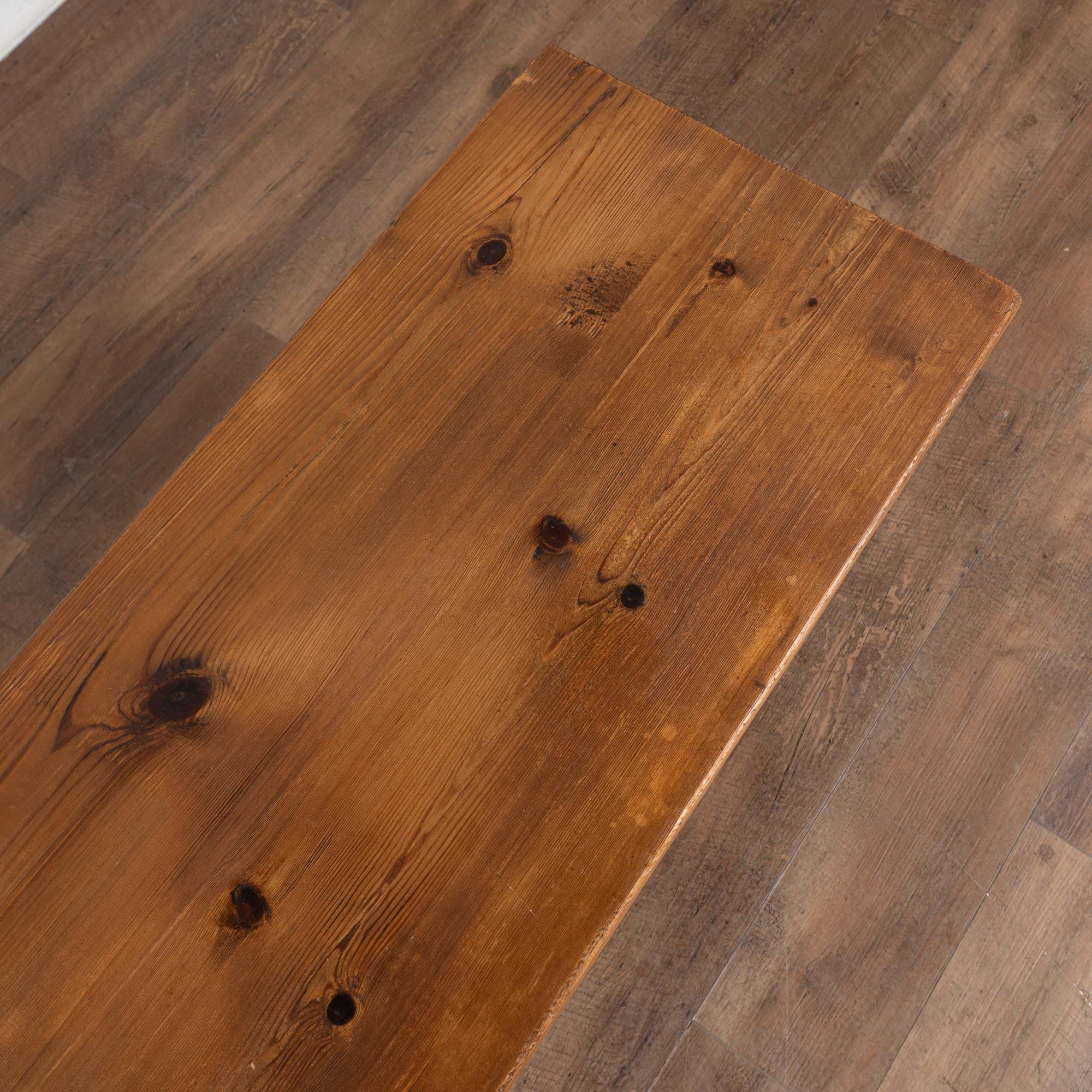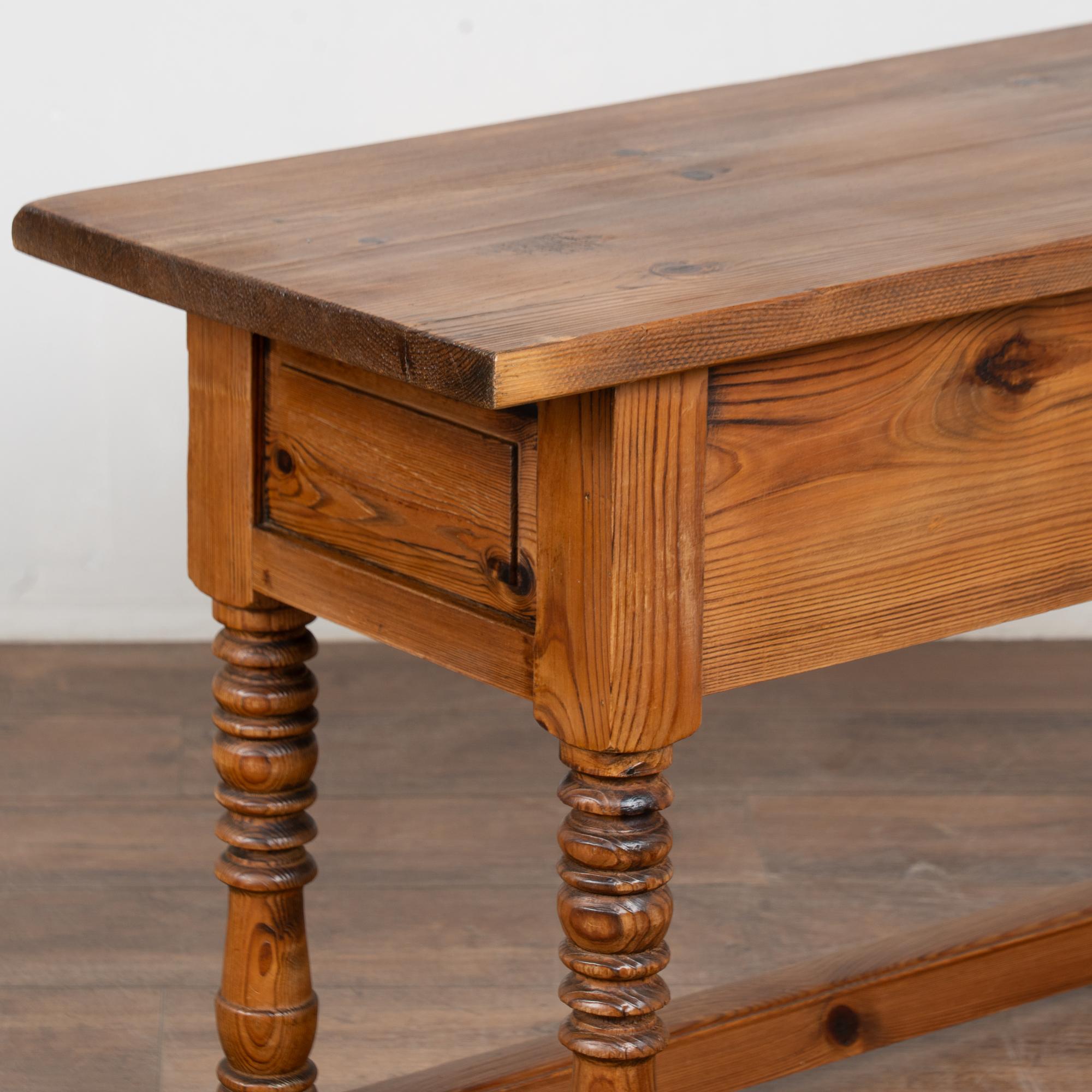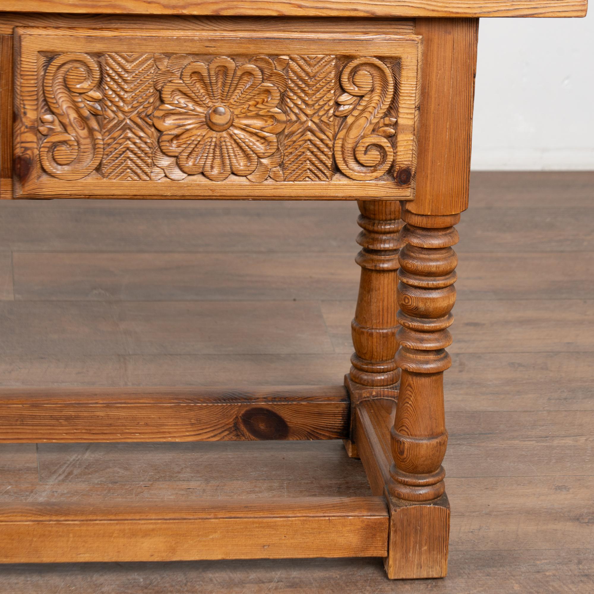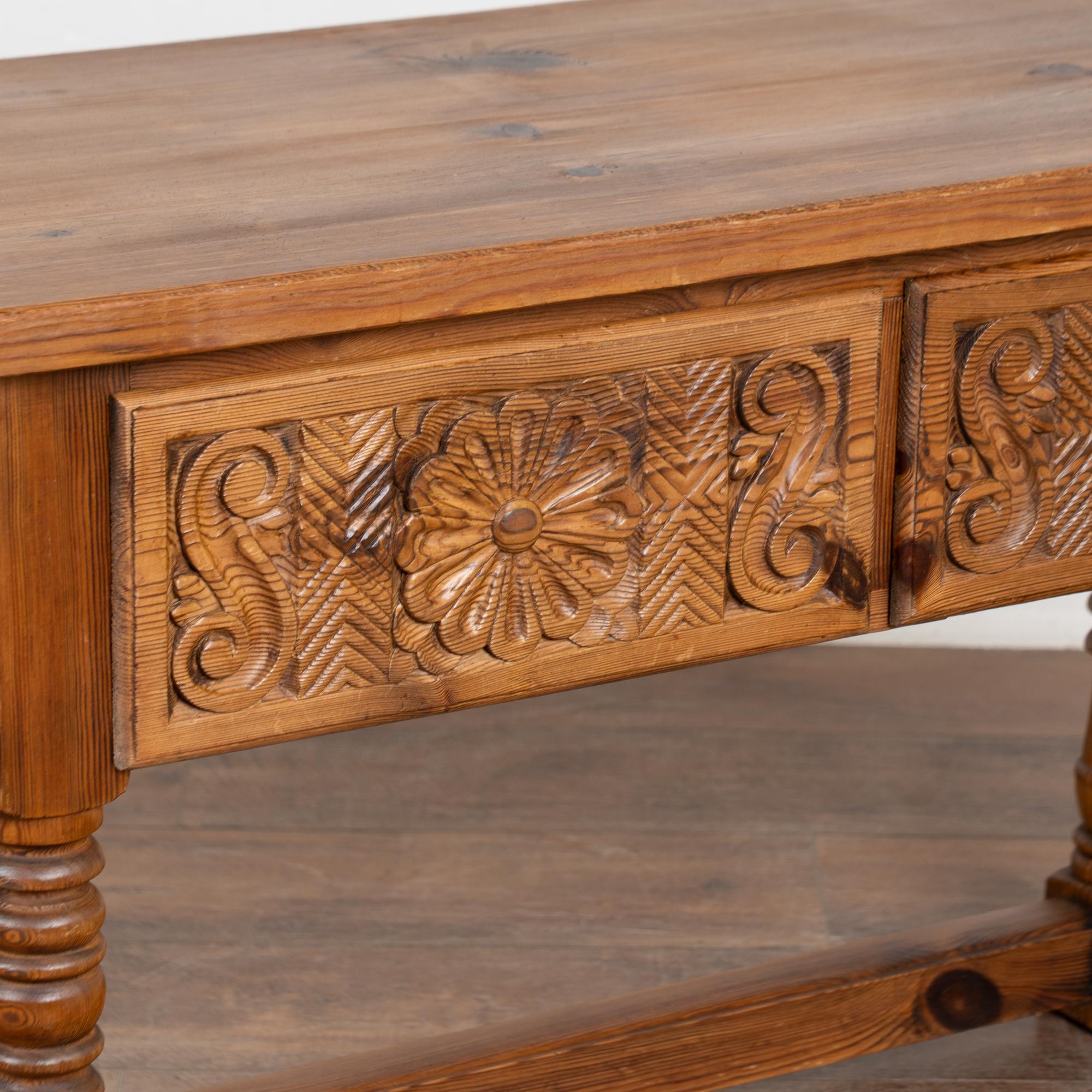 20th century Swedish small console side table constructed of mixed woods, including pine and oak. The table features two highly carved drawers (without pulls) and rests on distinctive turned legs joined by a rectangular stretcher base. Decorative carving on the drawer fronts and the attractive legs provide visual interest despite the compact scale. The top shows surface wear consistent with age and use, including scratches, stains, dark knots in the wood, and cracks. The piece has been restored, is structurally strong, stable, and ready for use.