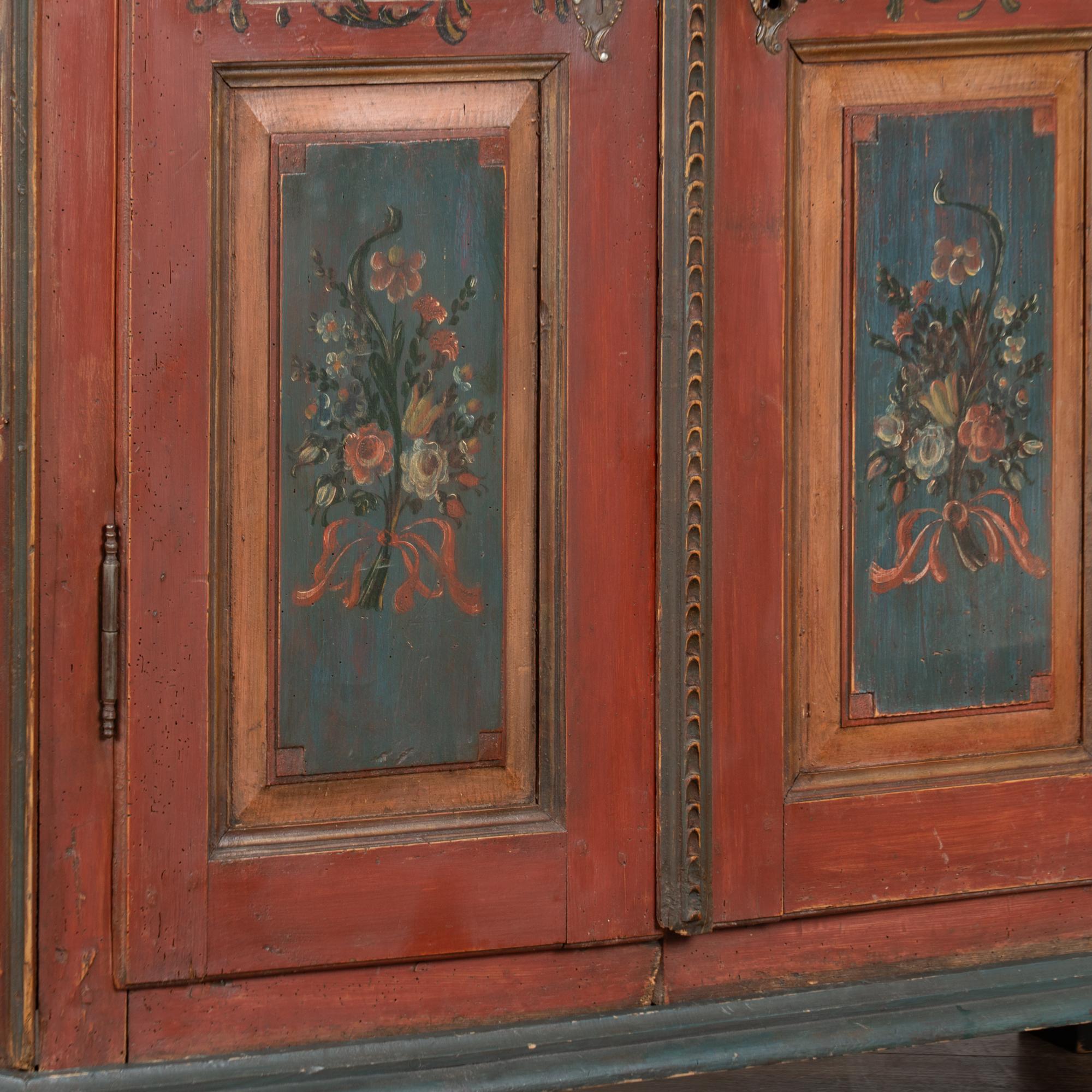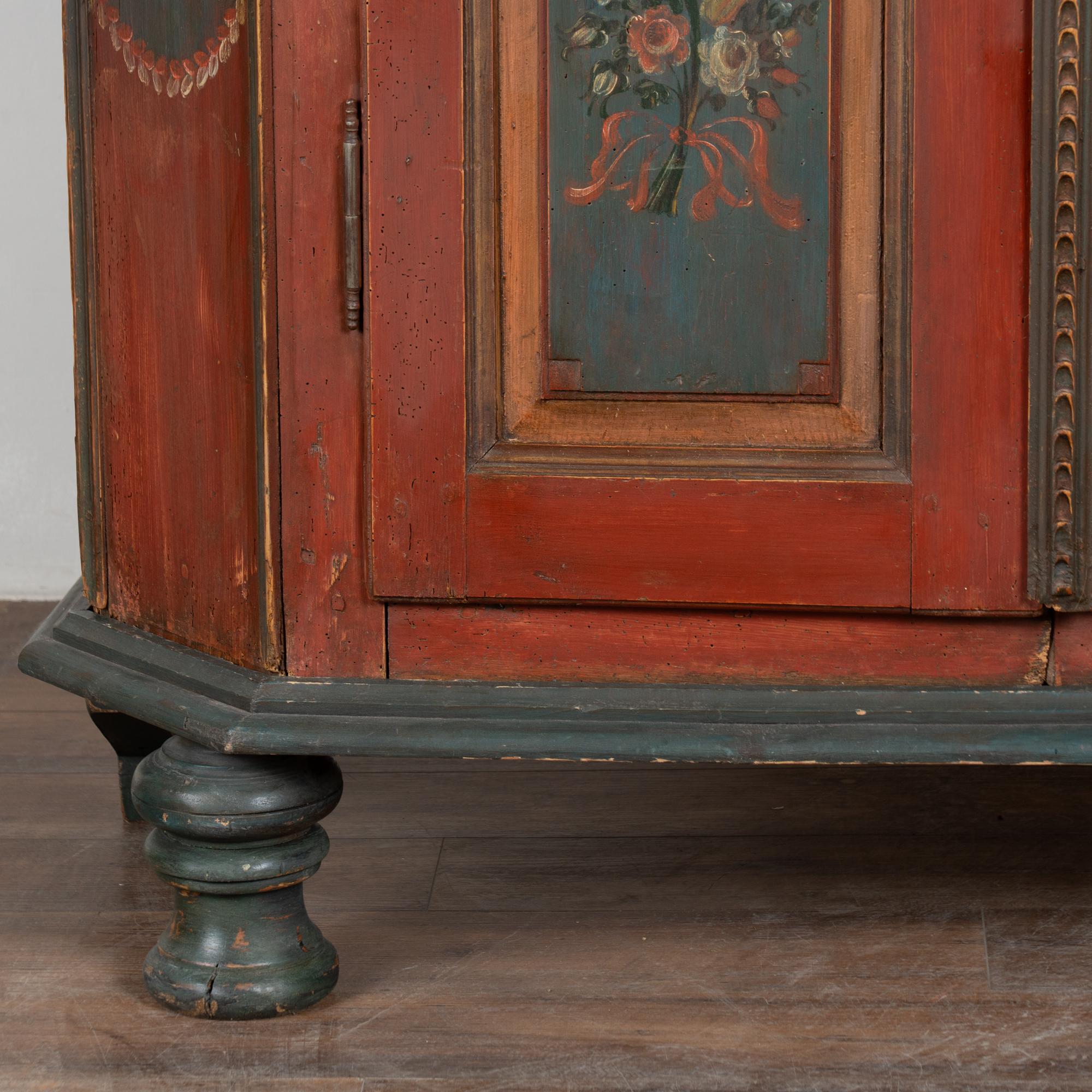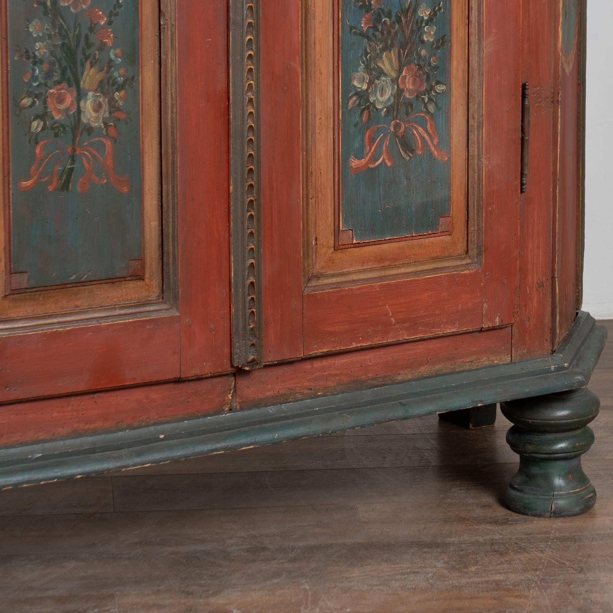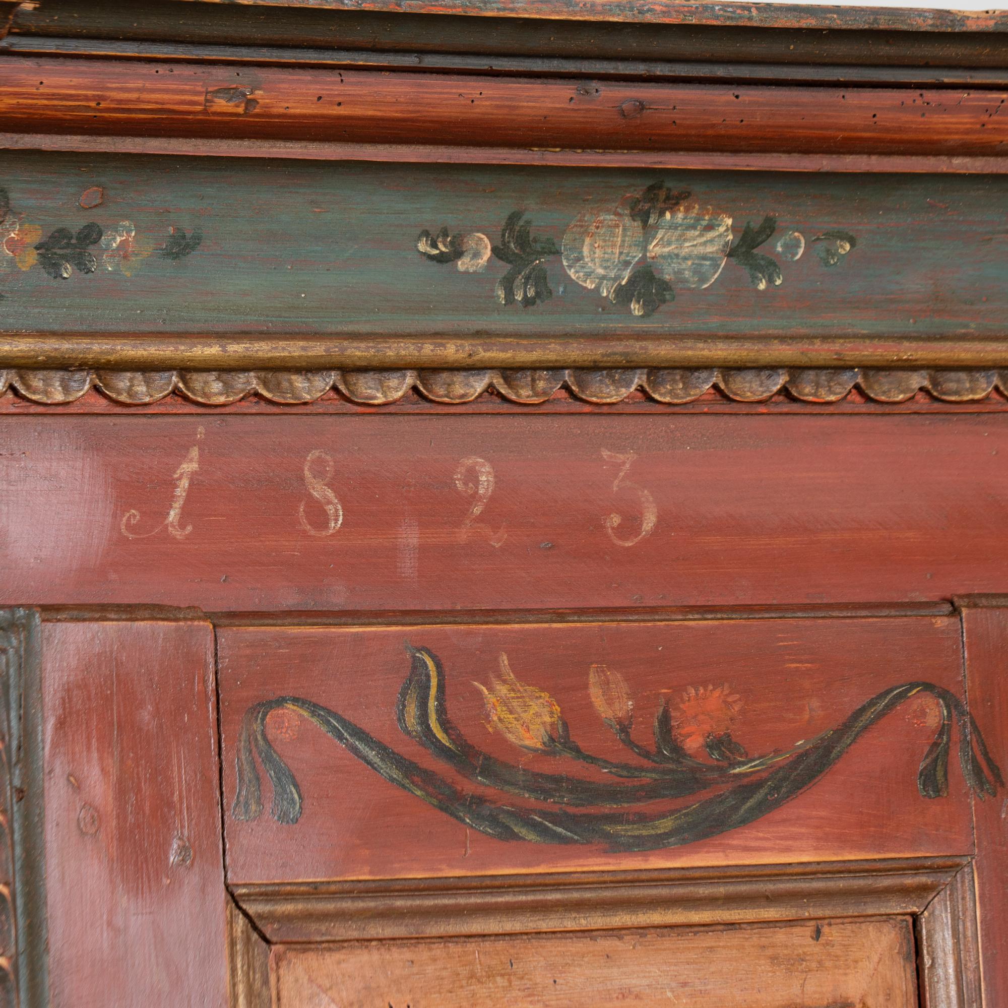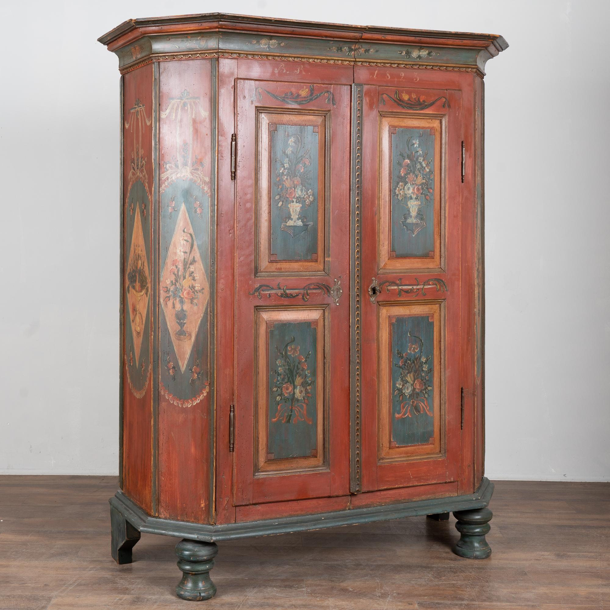 Early 19th century Swedish armoire constructed of pine and dated 1823, featuring its original hand-painted finish. The cabinet displays a deep red to burgundy background with four richly painted front panels and additional decoration along the canted sides, each adorned with floral motifs incorporating vases, bouquets, ribbons, and garlands. Above the doors, a painted monogram “B.R.” and the date 1823 suggest this armoire may have originally served as a wedding or dowry piece. Subtle carved detailing frames the crown and front doors, adding refinement to the overall form. Raised on turned front feet, the armoire was originally built in sections, with a visible seam along the back reflecting traditional construction methods ("break-down armoire"). The interior retains original hand-carved hooks in the upper section and two interior shelves along with two small lower drawers. The original lock and key remain present and function with some resistance; may be best to use key as a pull only. Old dried wormhole activity, along with surface wear, scratches, cracks, and finish wear, reflect the cabinet’s age and history without impacting stability or function. The skirt and feet show a complementary later paint application that harmonizes with the original decoration. This armoire has been restored, is strong and stable, and ready for use, offering a rare and highly decorative example of Swedish folk art craftsmanship.