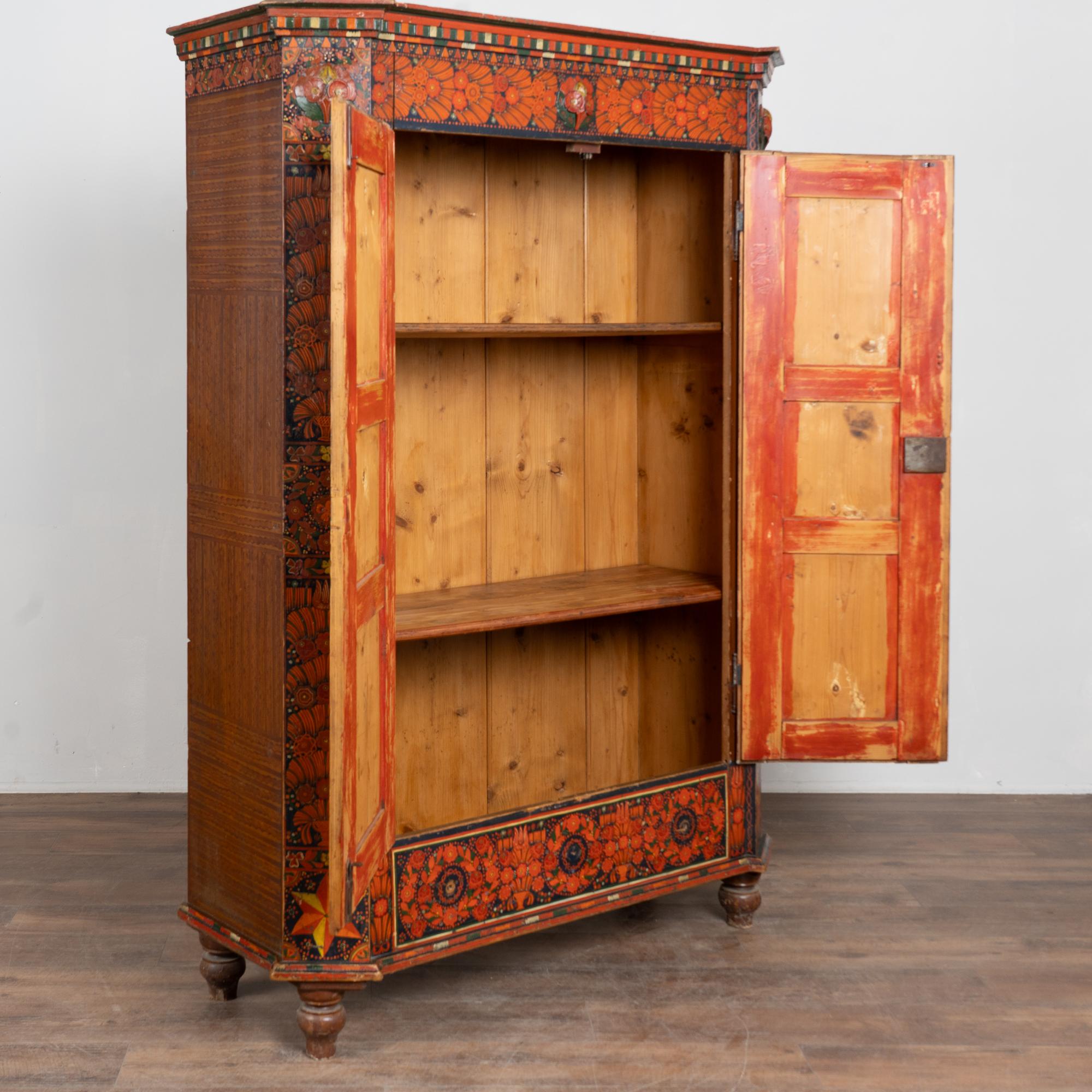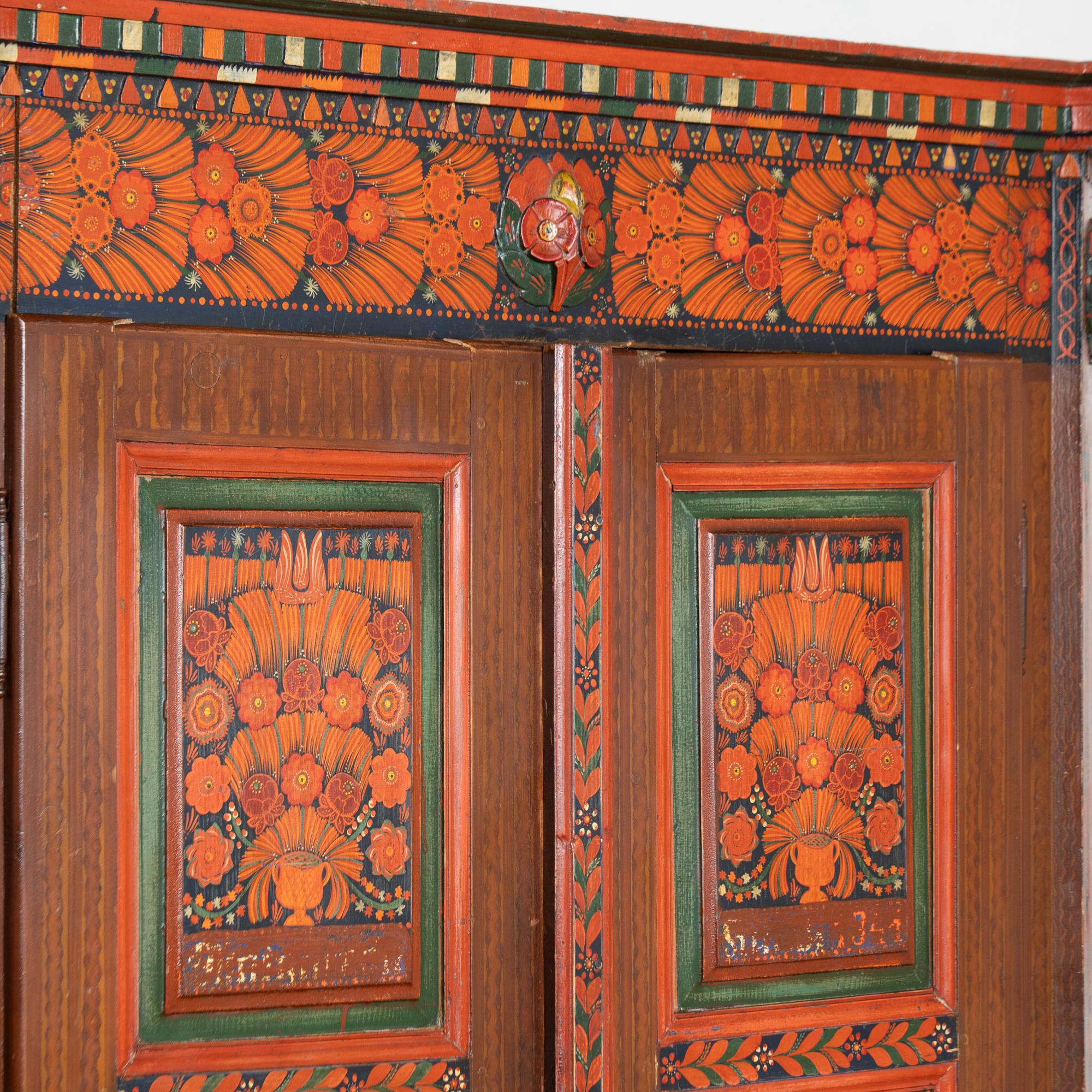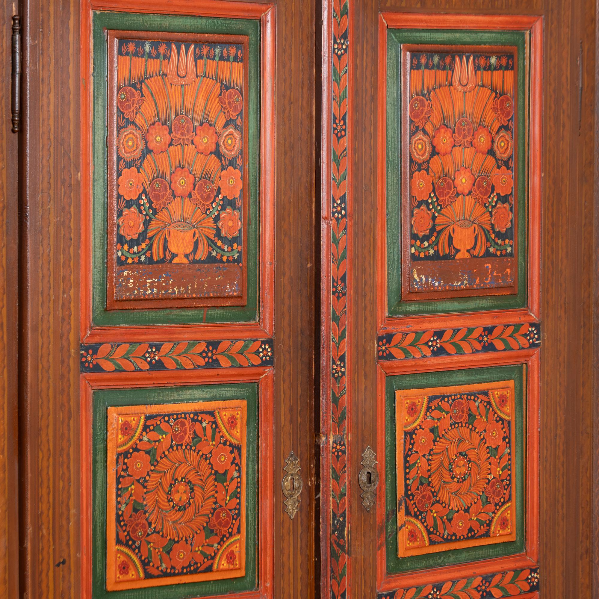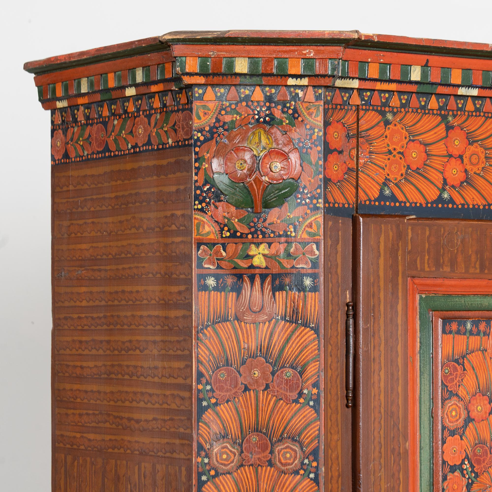19th-century Hungarian pine armoire featuring its original hand-painted finish in vibrant tones of red, dark blue, yellow, and green throughout. Painted dental molding accents the crown, while carved and painted floral medallions decorate the upper section. The canted sides are fully painted, and the two front doors feature six painted panels in traditional Eastern European folk art style.