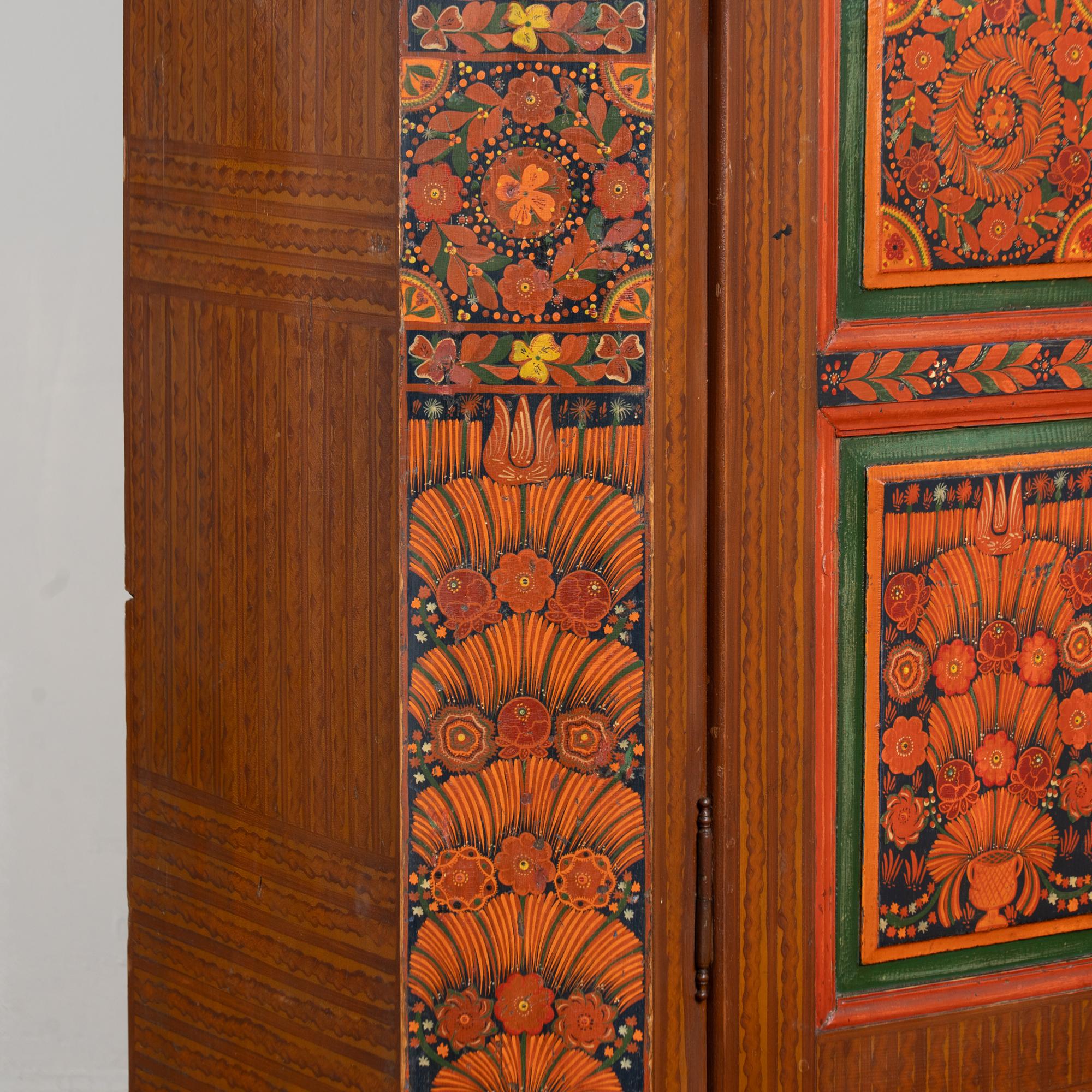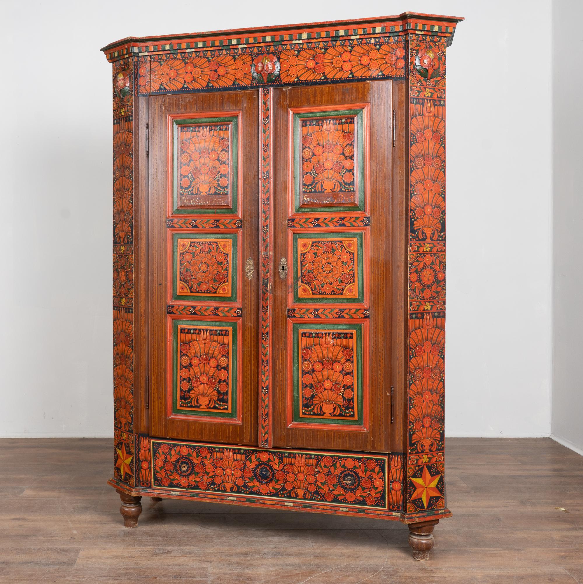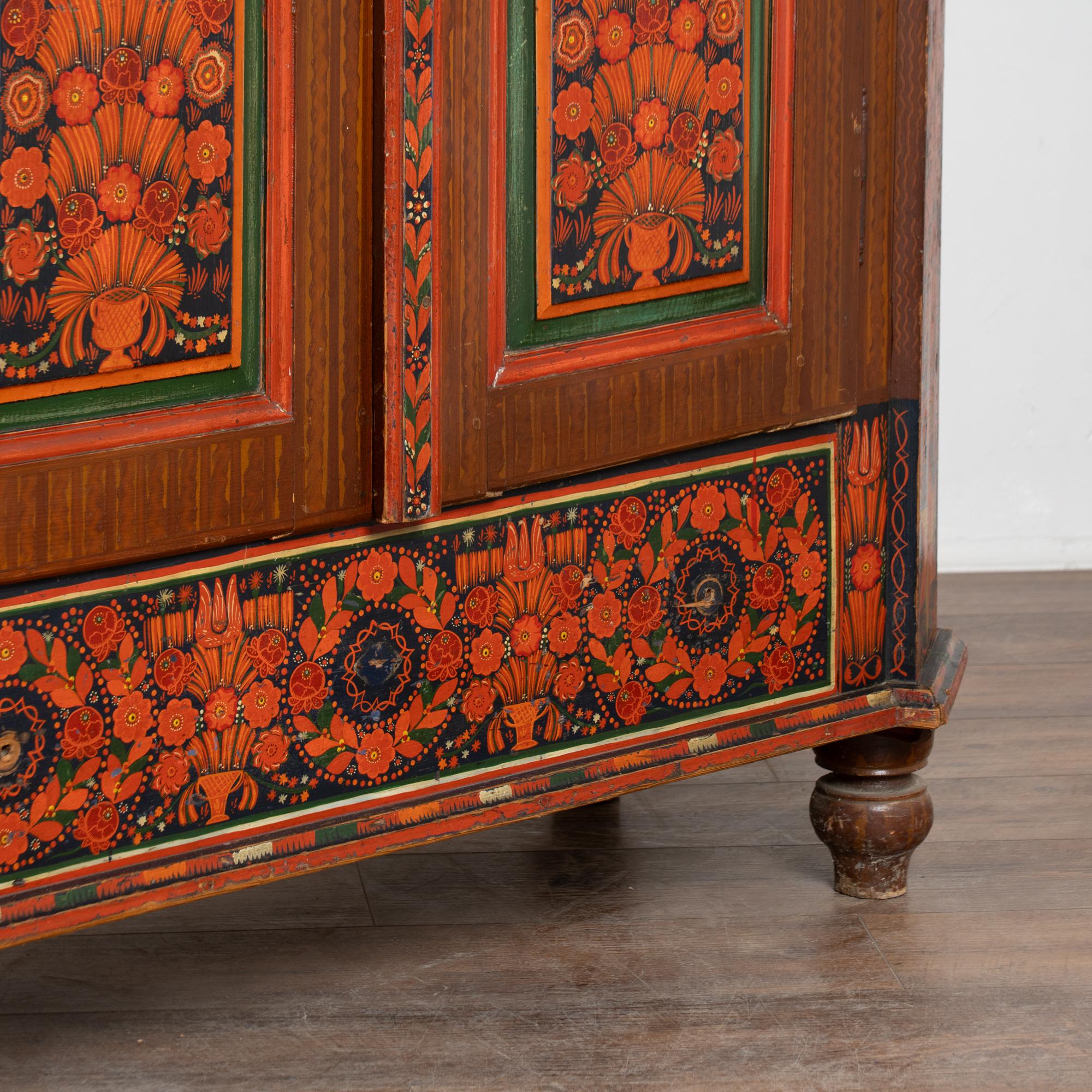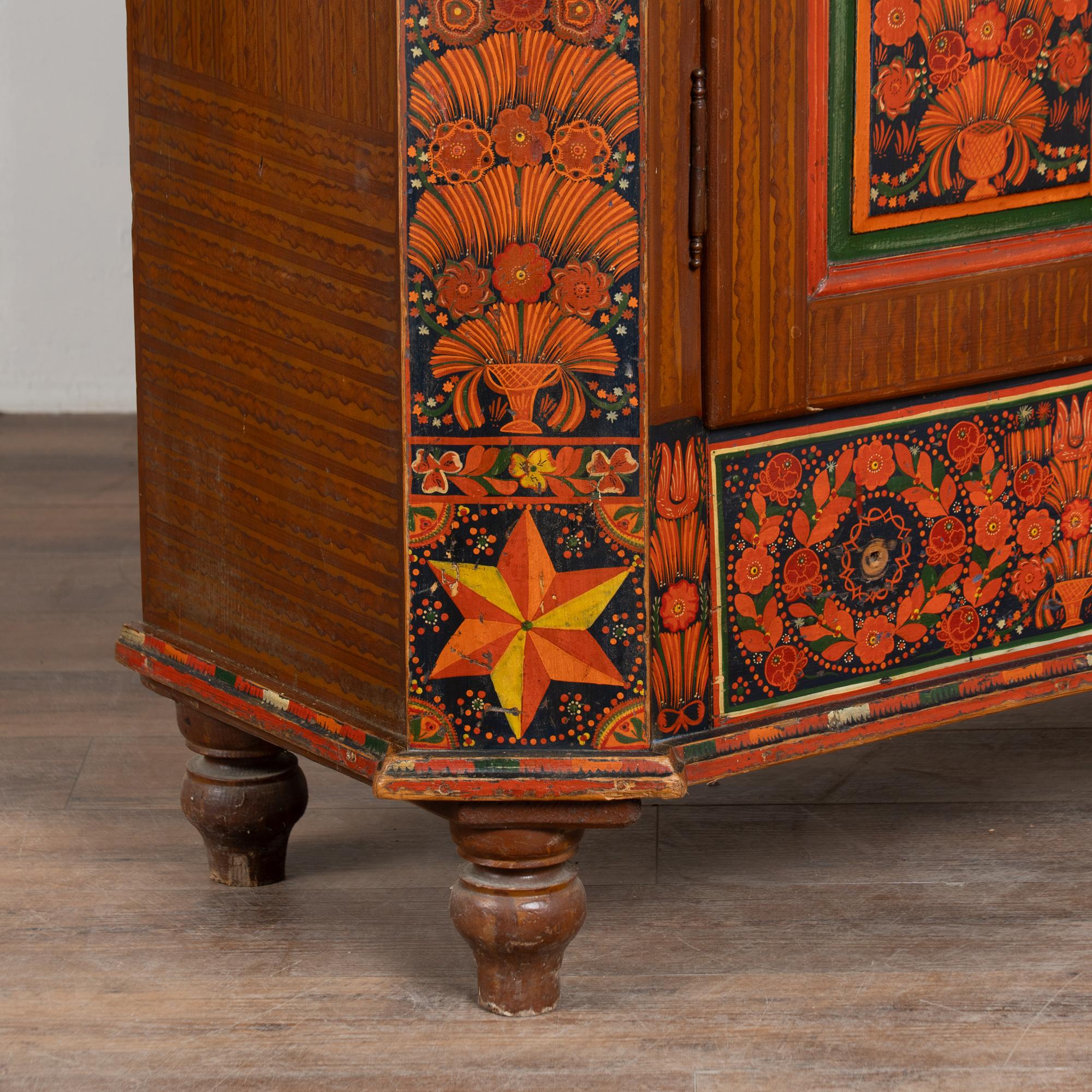 19th-century Hungarian pine armoire featuring its original hand-painted finish in vibrant tones of red, dark blue, yellow, and green throughout. Painted dental molding accents the crown, while carved and painted floral medallions decorate the upper section. The canted sides are fully painted, and the two front doors feature six painted panels in traditional Eastern European folk art style.