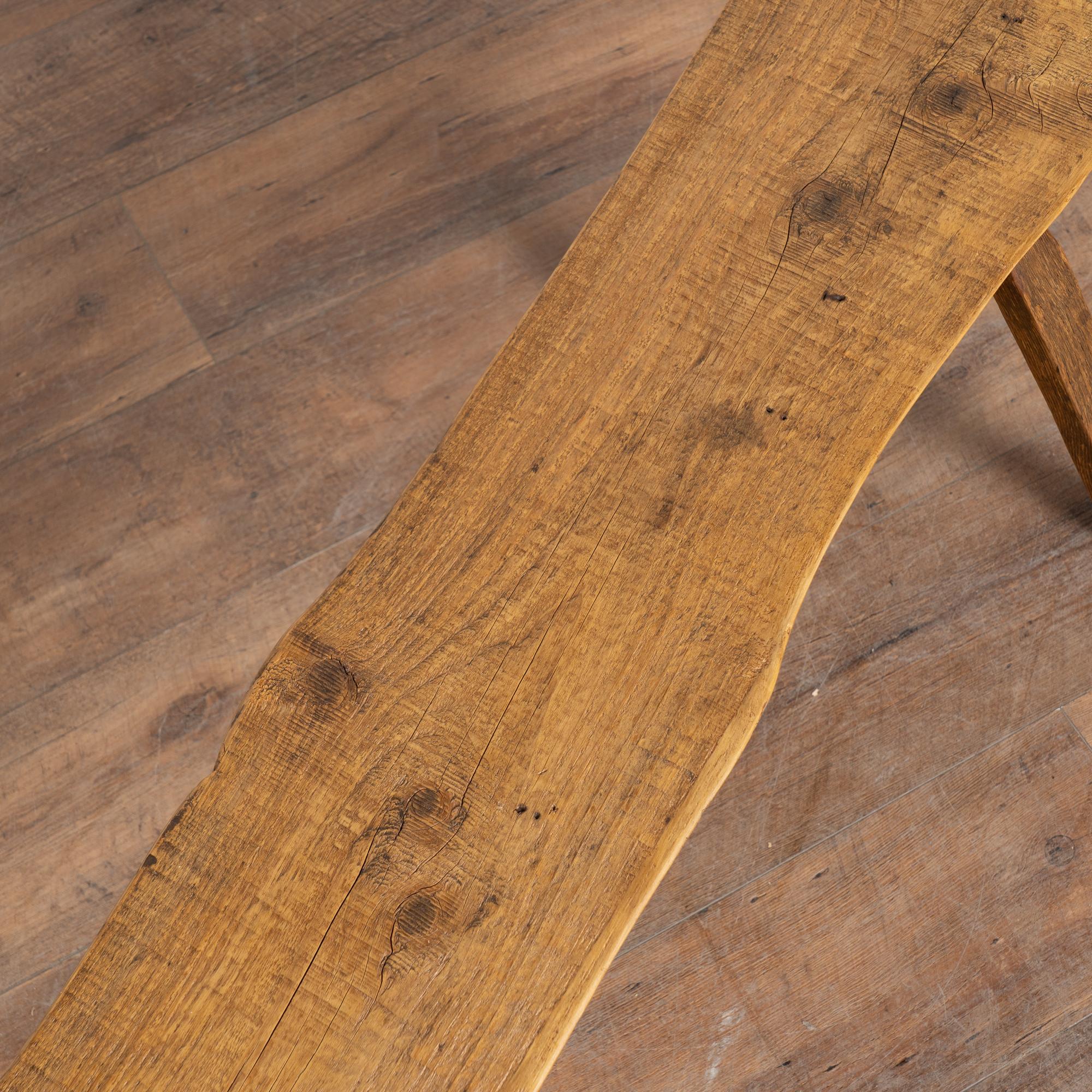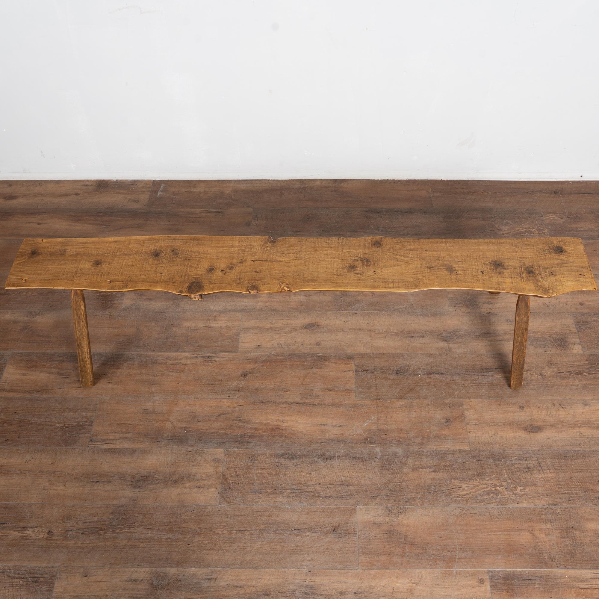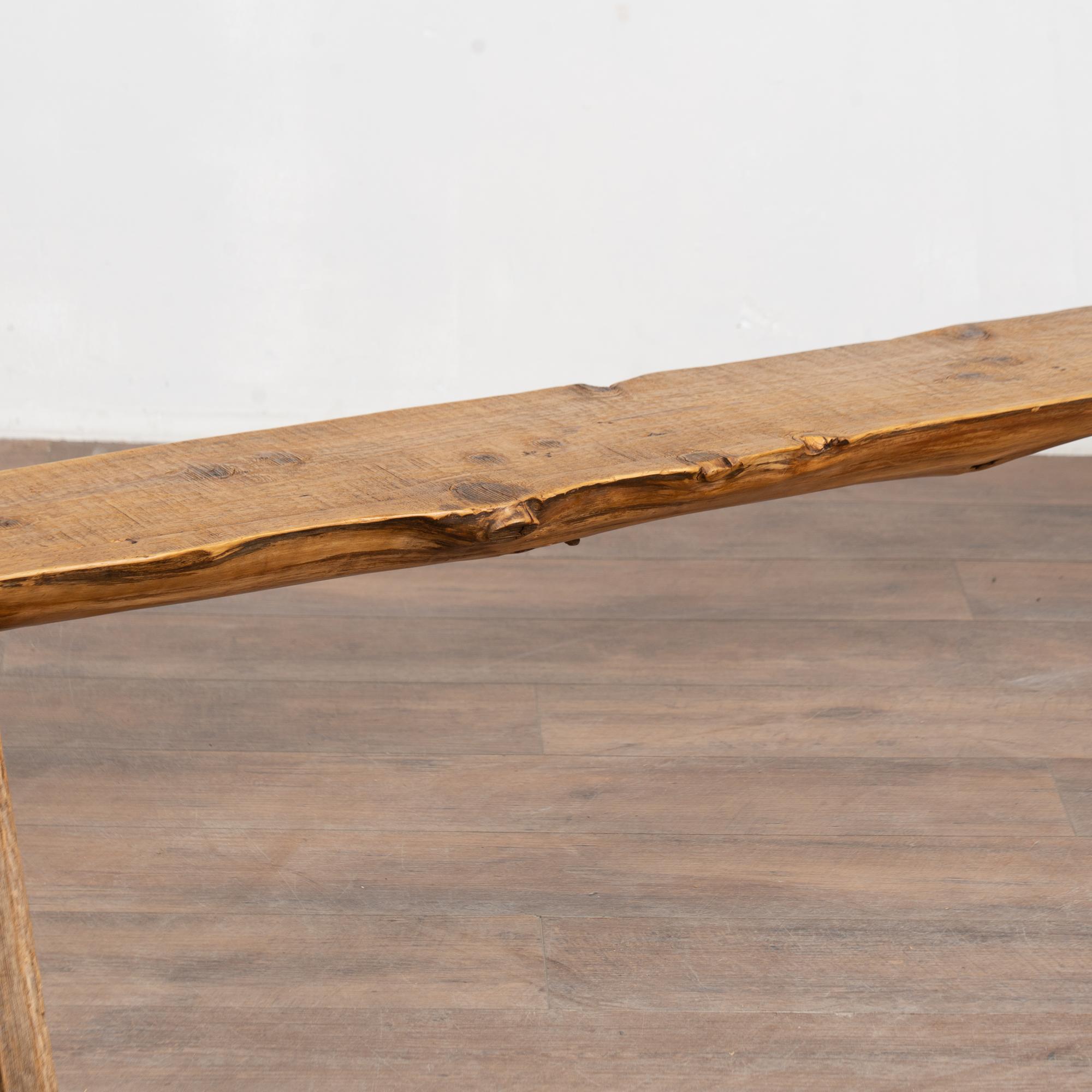 The top reveals old knots and surface cracks typical of aged pine, while the uneven edges follow the organic flow of the original wood. The overall appearance is rustic and natural. While the seat averages approximately 9 inches deep, the splayed display legs extend the overall depth to approximately 18 1/2 inches. The bench has been restored, is strong and stable, and suitable for seating or display.