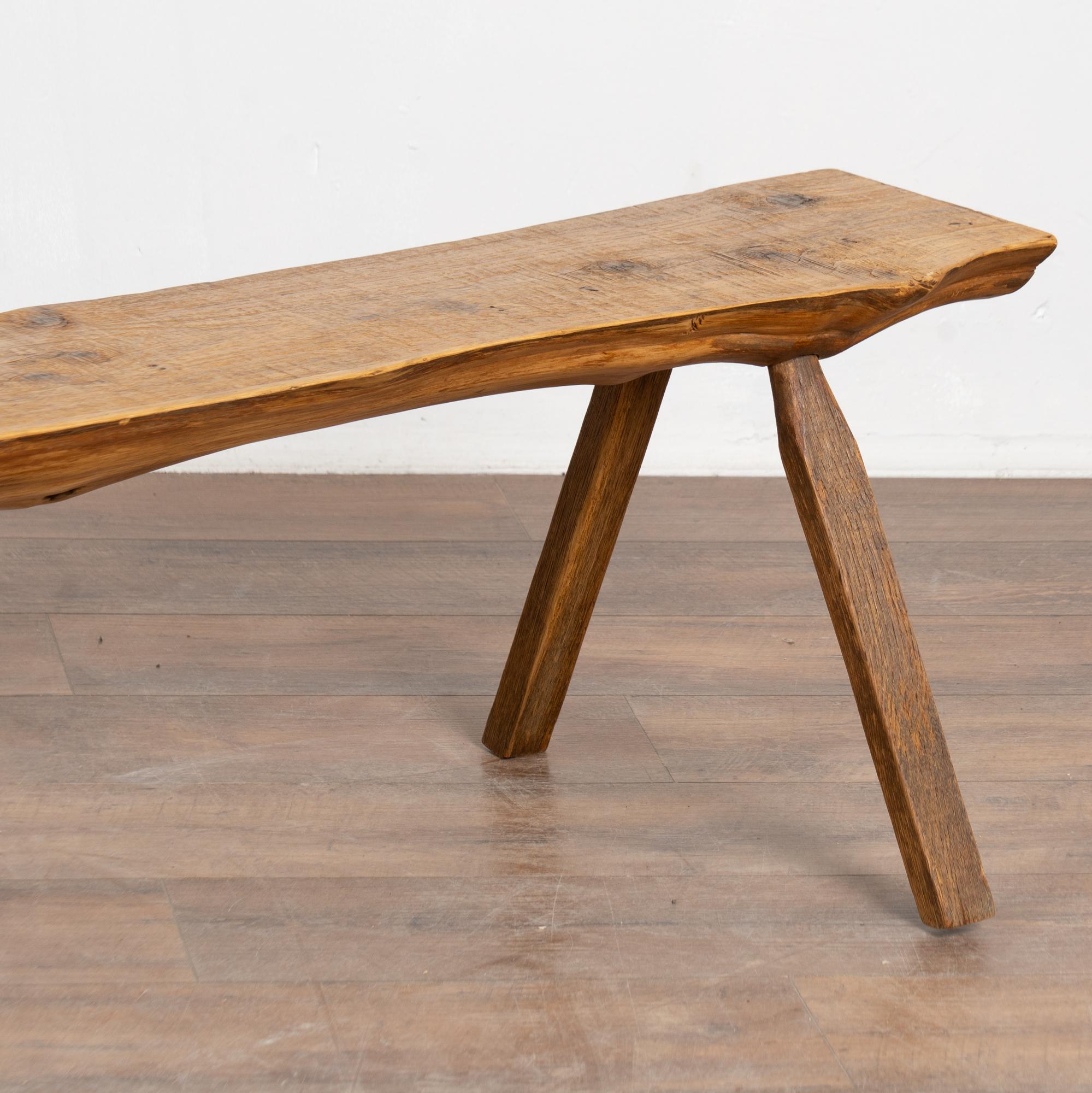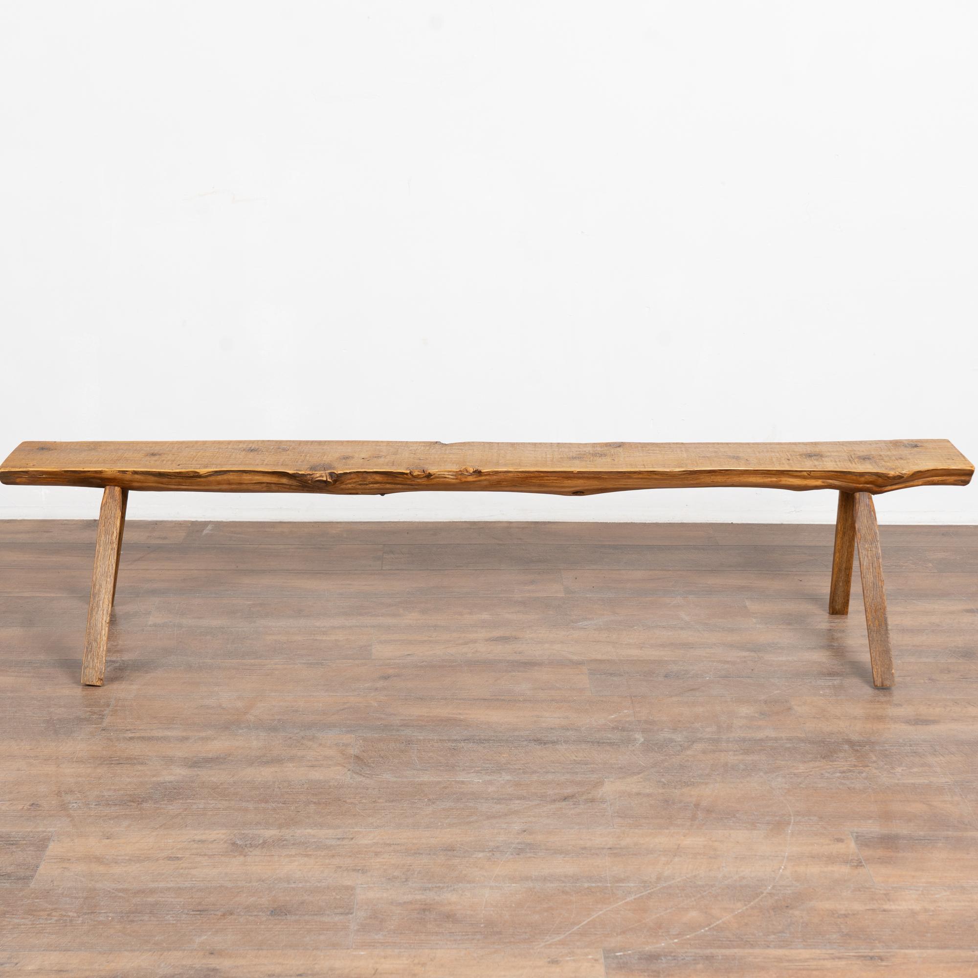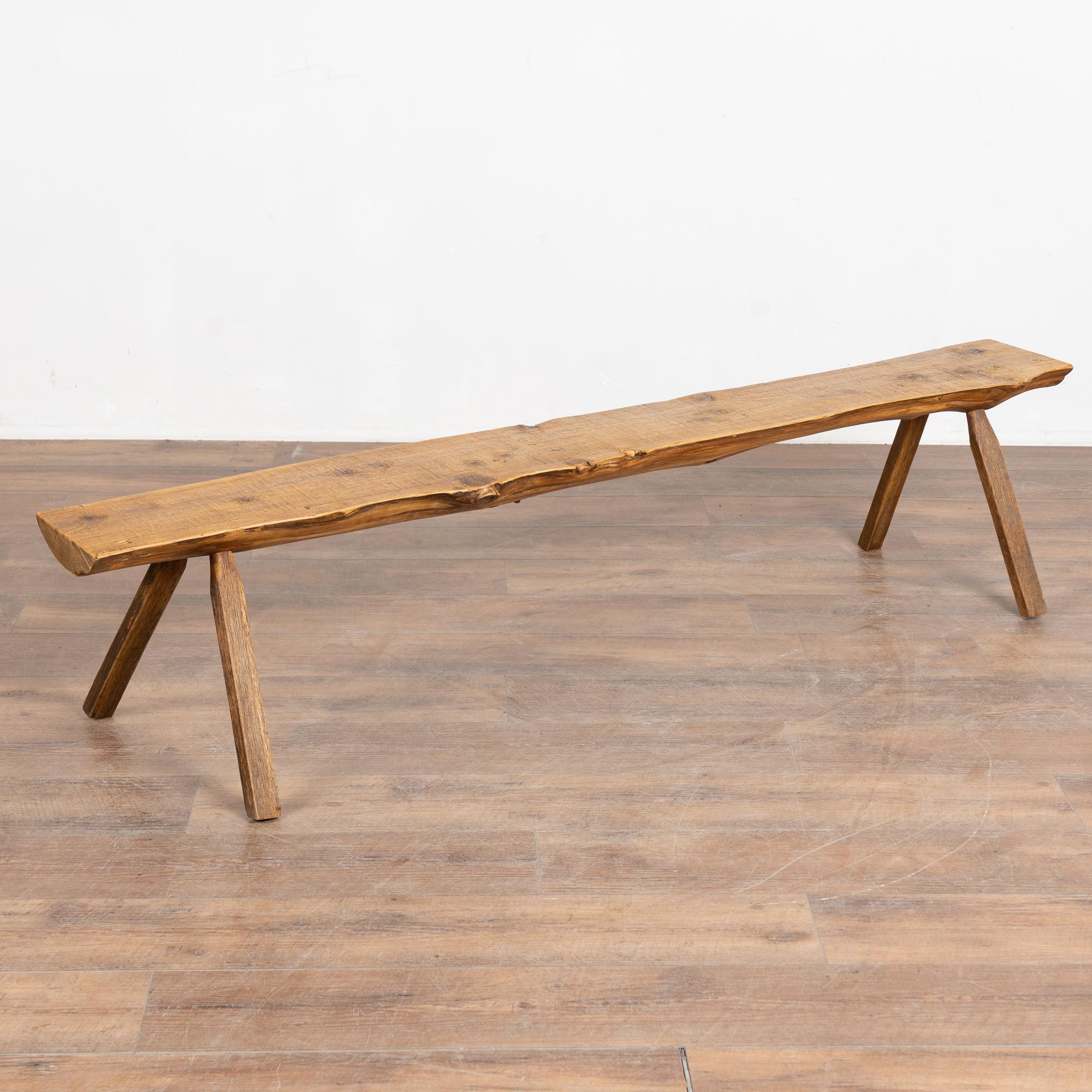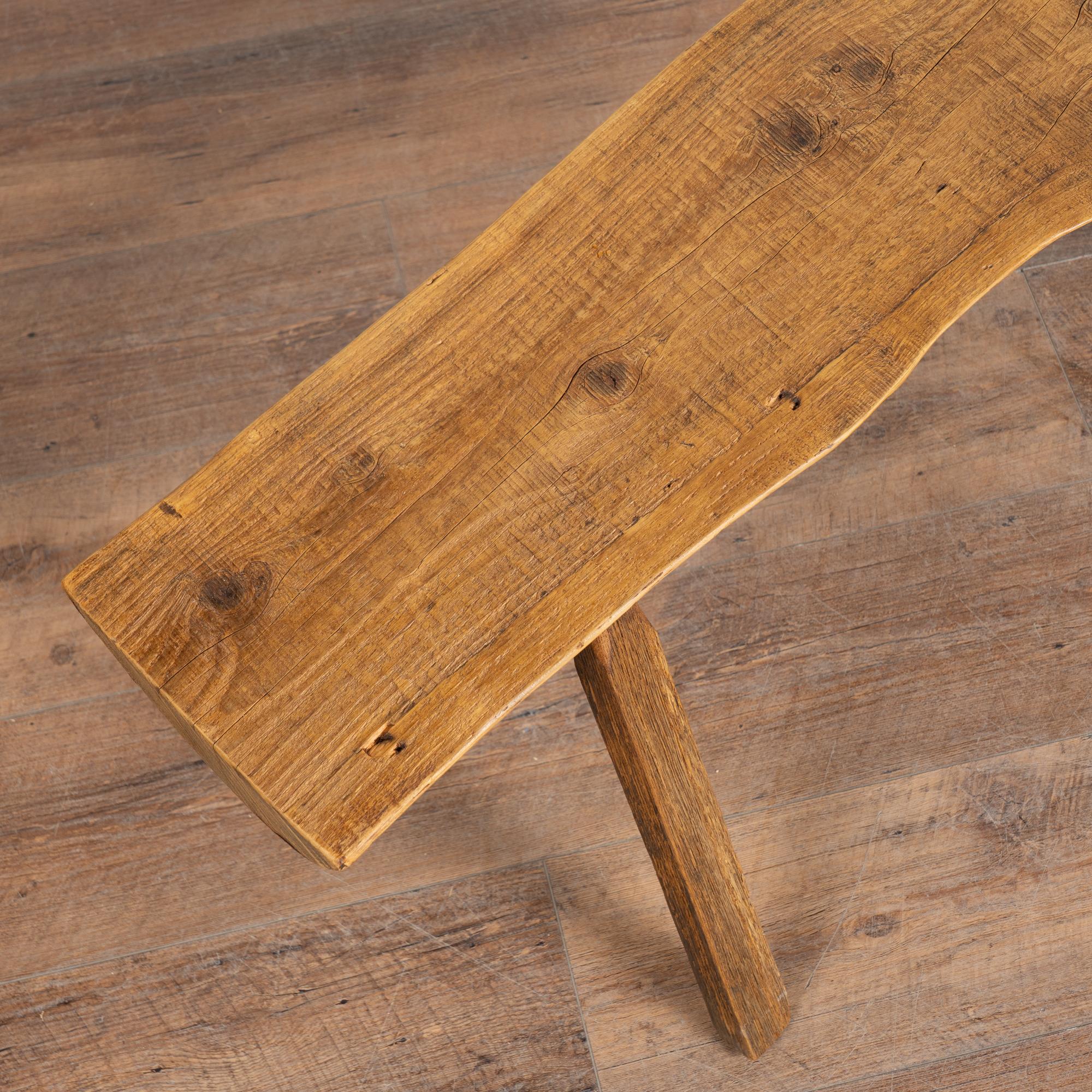 The top reveals old knots and surface cracks typical of aged pine, while the uneven edges follow the organic flow of the original wood. The overall appearance is rustic and natural. While the seat averages approximately 9 inches deep, the splayed display legs extend the overall depth to approximately 18 1/2 inches. The bench has been restored, is strong and stable, and suitable for seating or display.