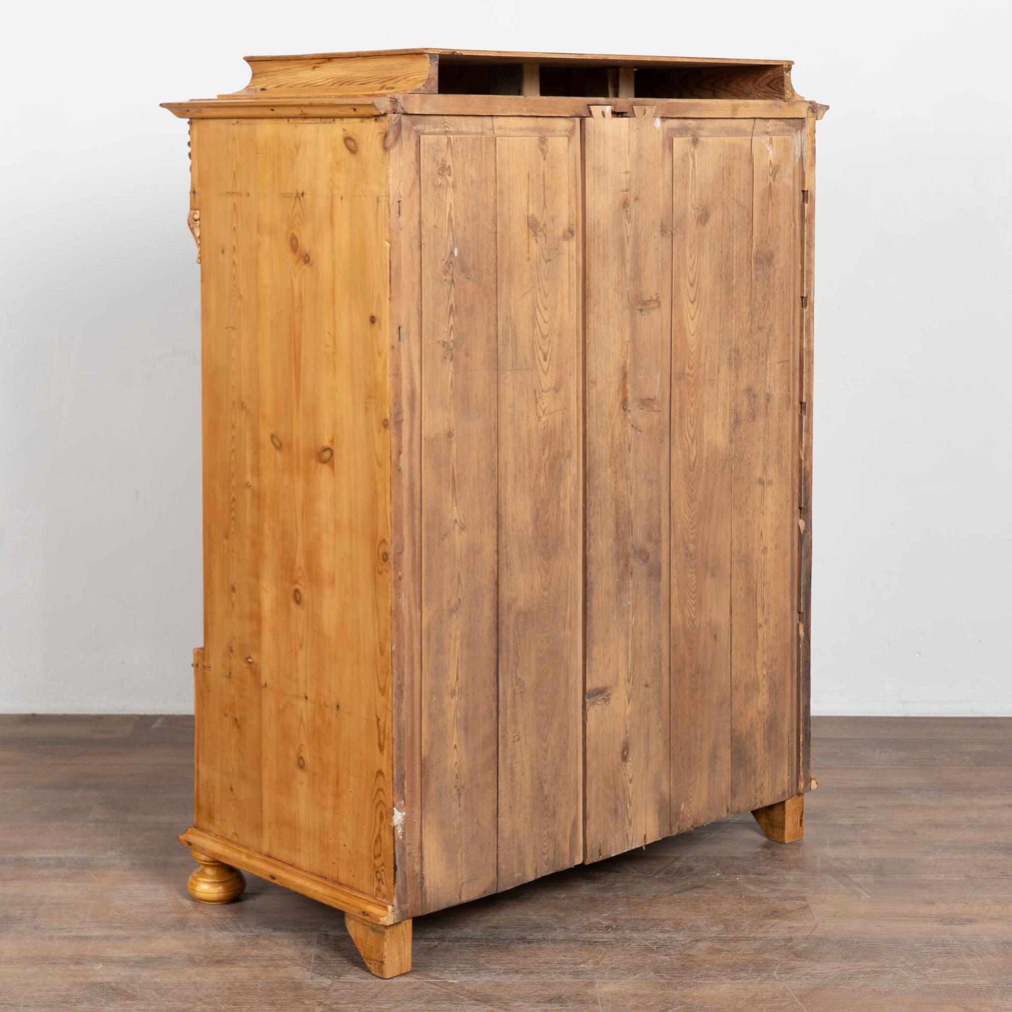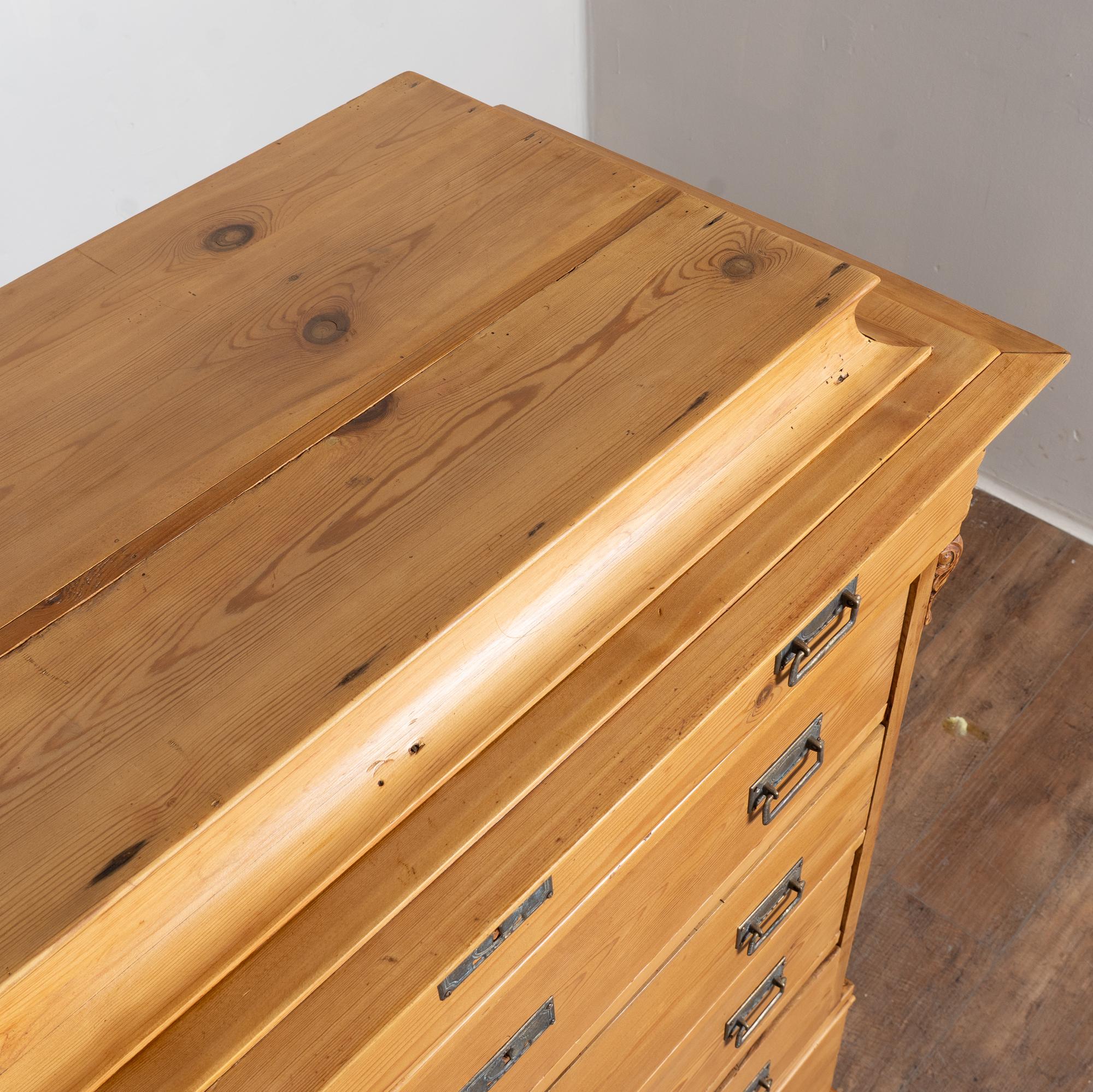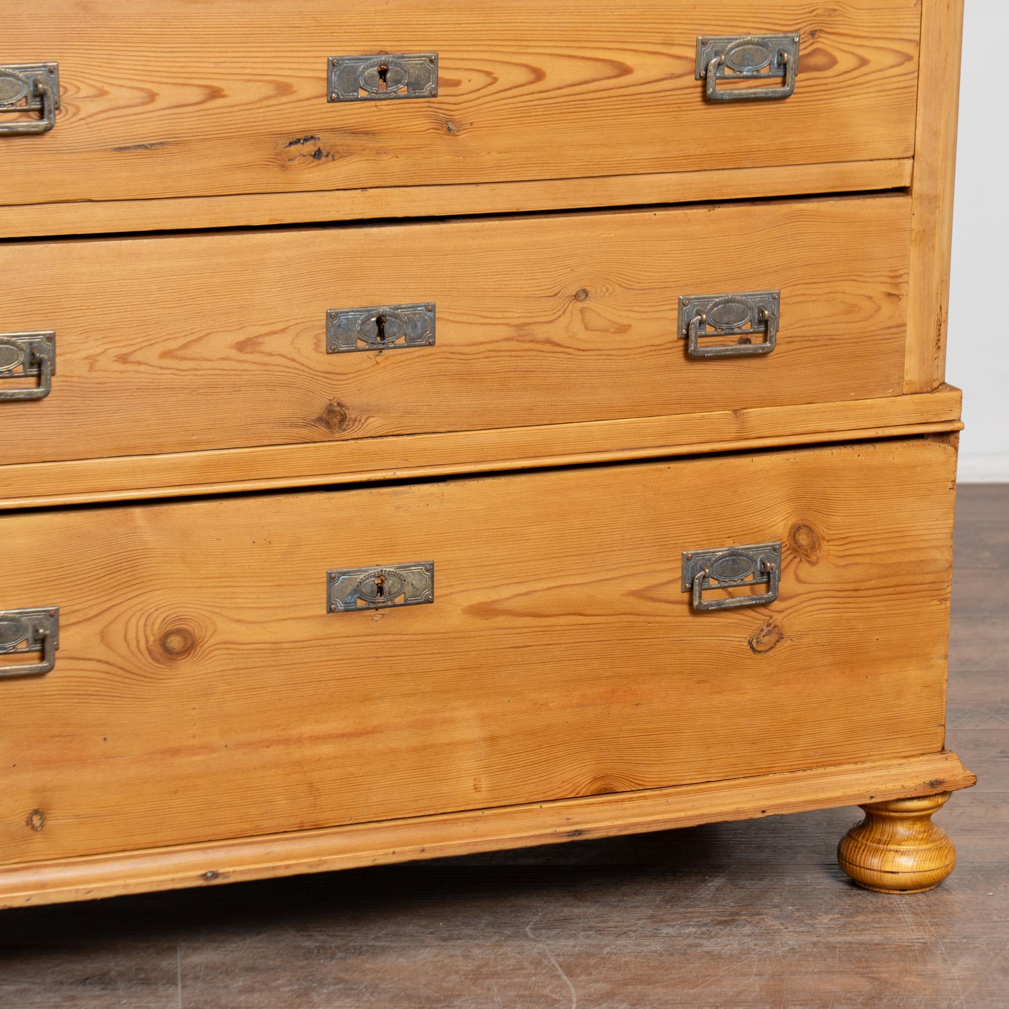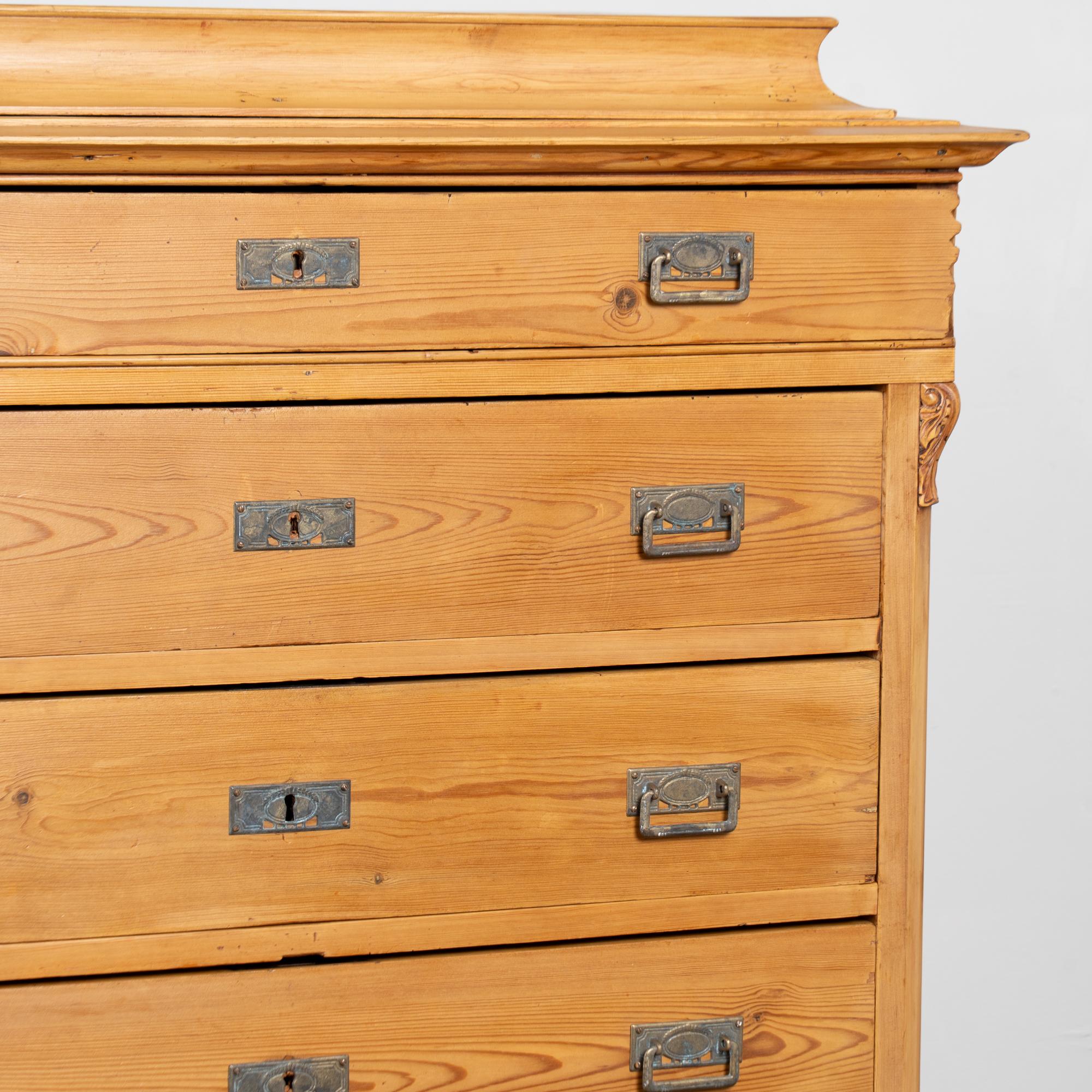 19th-century Swedish pine highboy featuring six drawers, with the bottom drawer deeper than those above for additional storage. The case has lightly canted side trim topped with carved detailing, adding subtle architectural interest. The chest rests on traditional front bun feet and is finished in natural pine enhanced with a wax finish that brings out the warmth and grain of the wood.