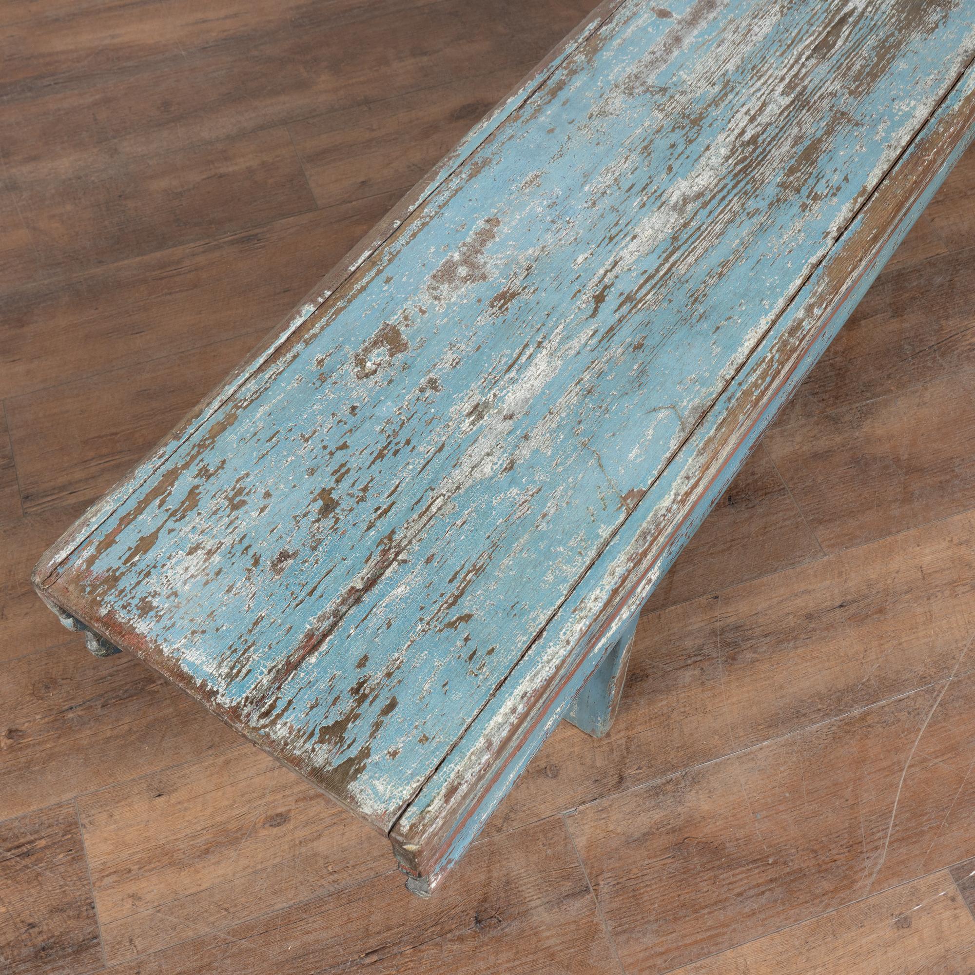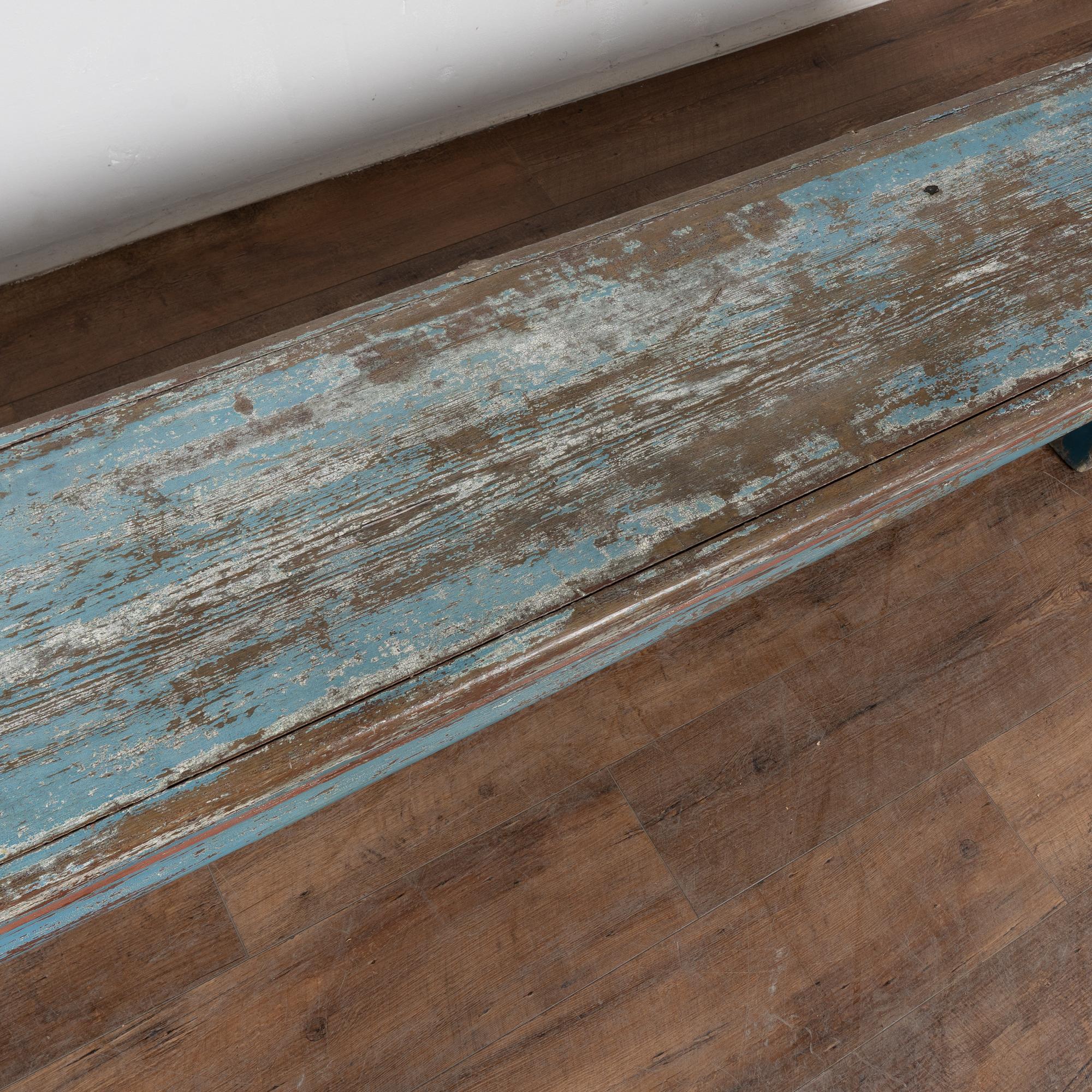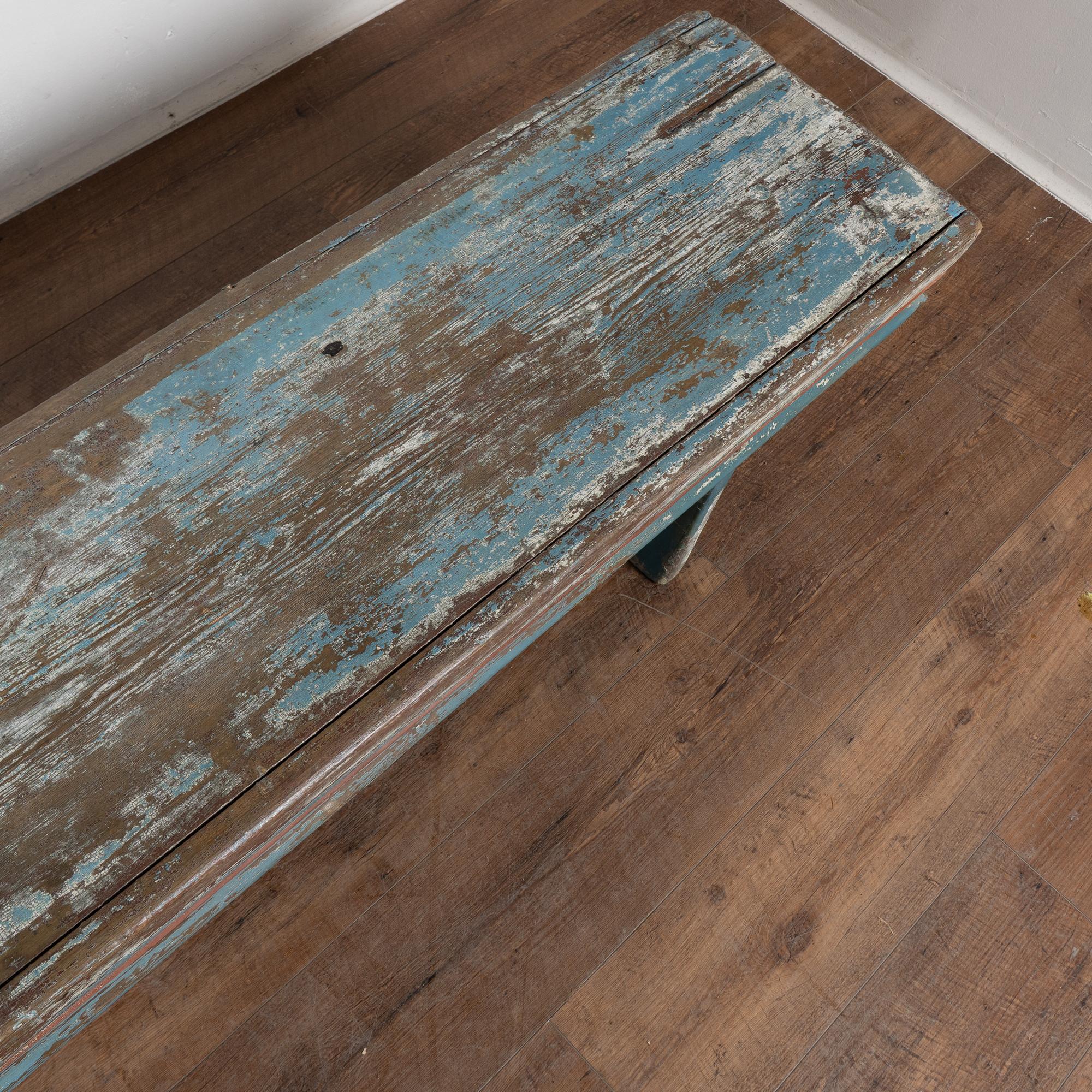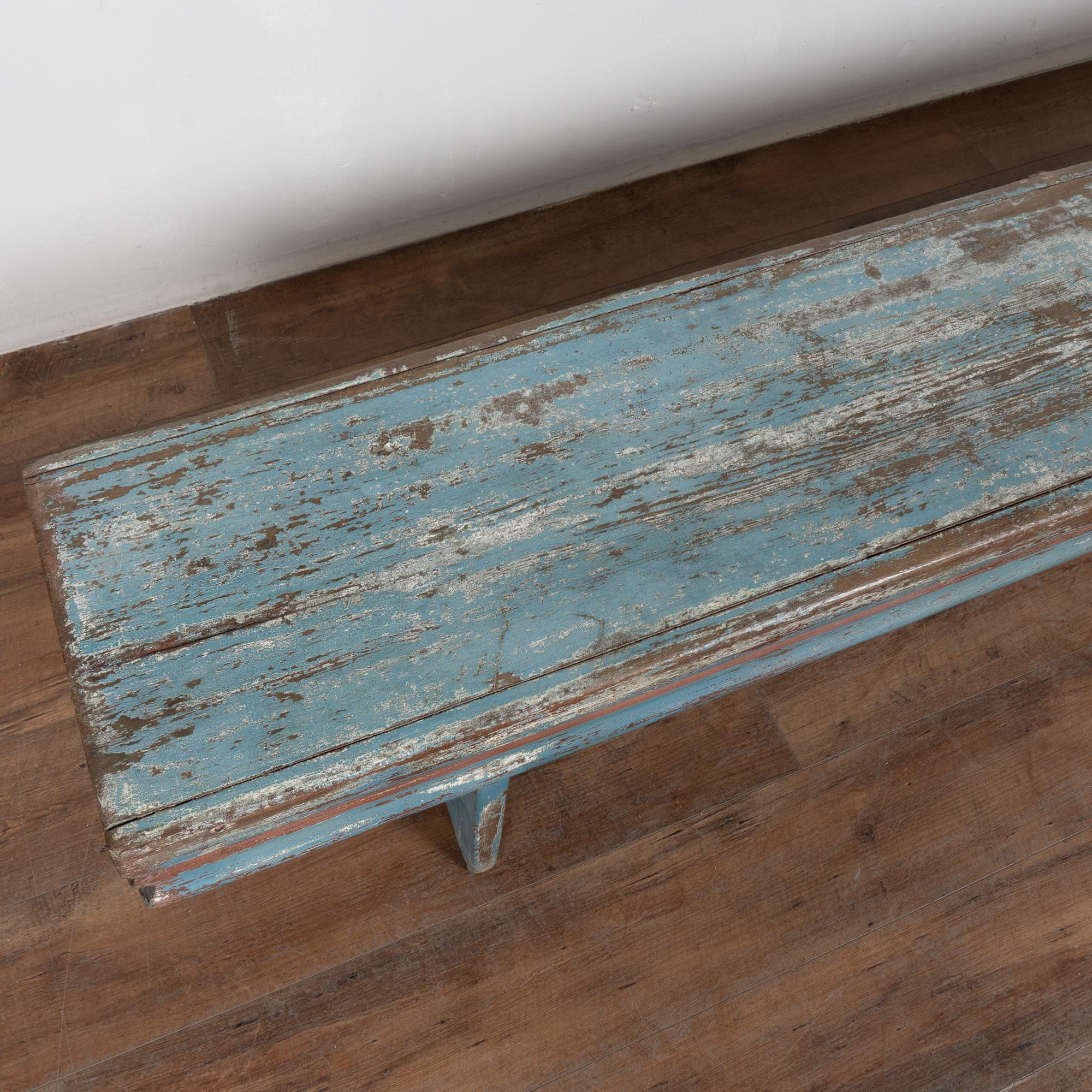 Late 19th-century Swedish oak bench with original blue painted finish. The surface shows extensive authentic distress from generations of use, revealing natural oak below along with remnants of earlier white paint and traces of burgundy and red. The top plank shows age-related separation consistent with antique oak construction. Additional cracks, gouges, scratches, and surface wear are visible throughout, all reflective of its age and history. The bench has been restored, remains strong and stable, and is ready for daily use. It is the layered paint, worn edges, and exposed wood that give this bench its genuine Swedish country character. A practical and charming example of late 19th-century Scandinavian craftsmanship.