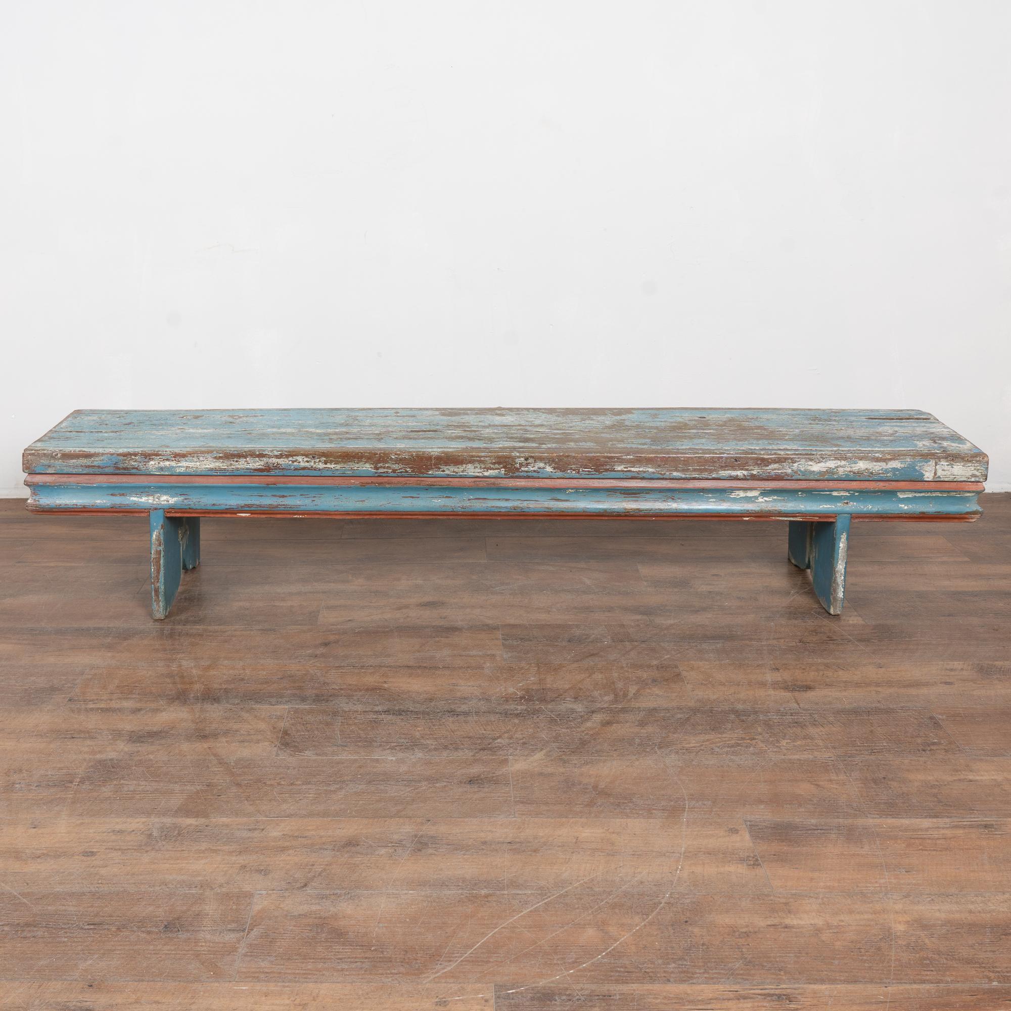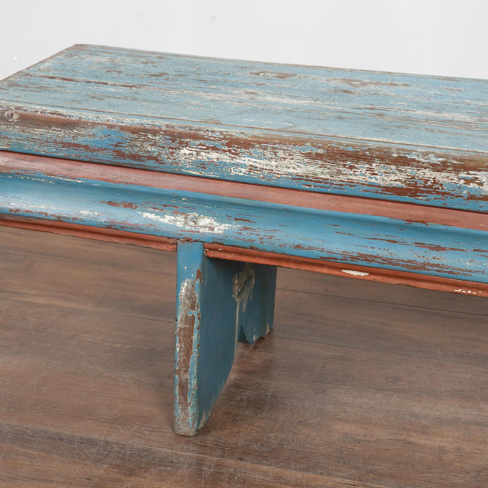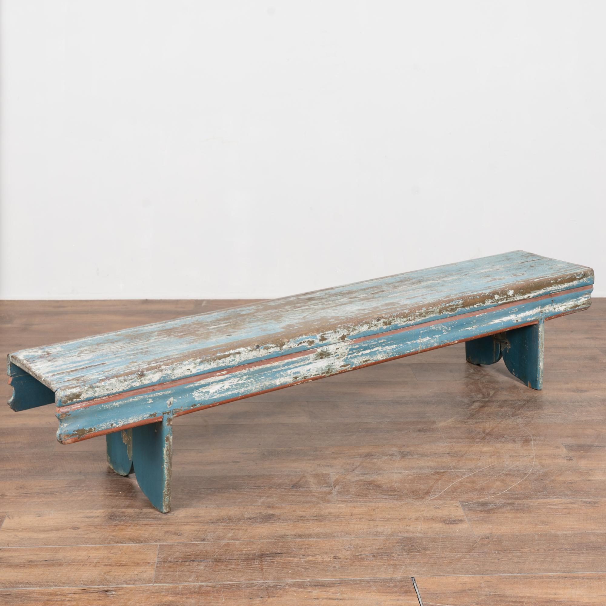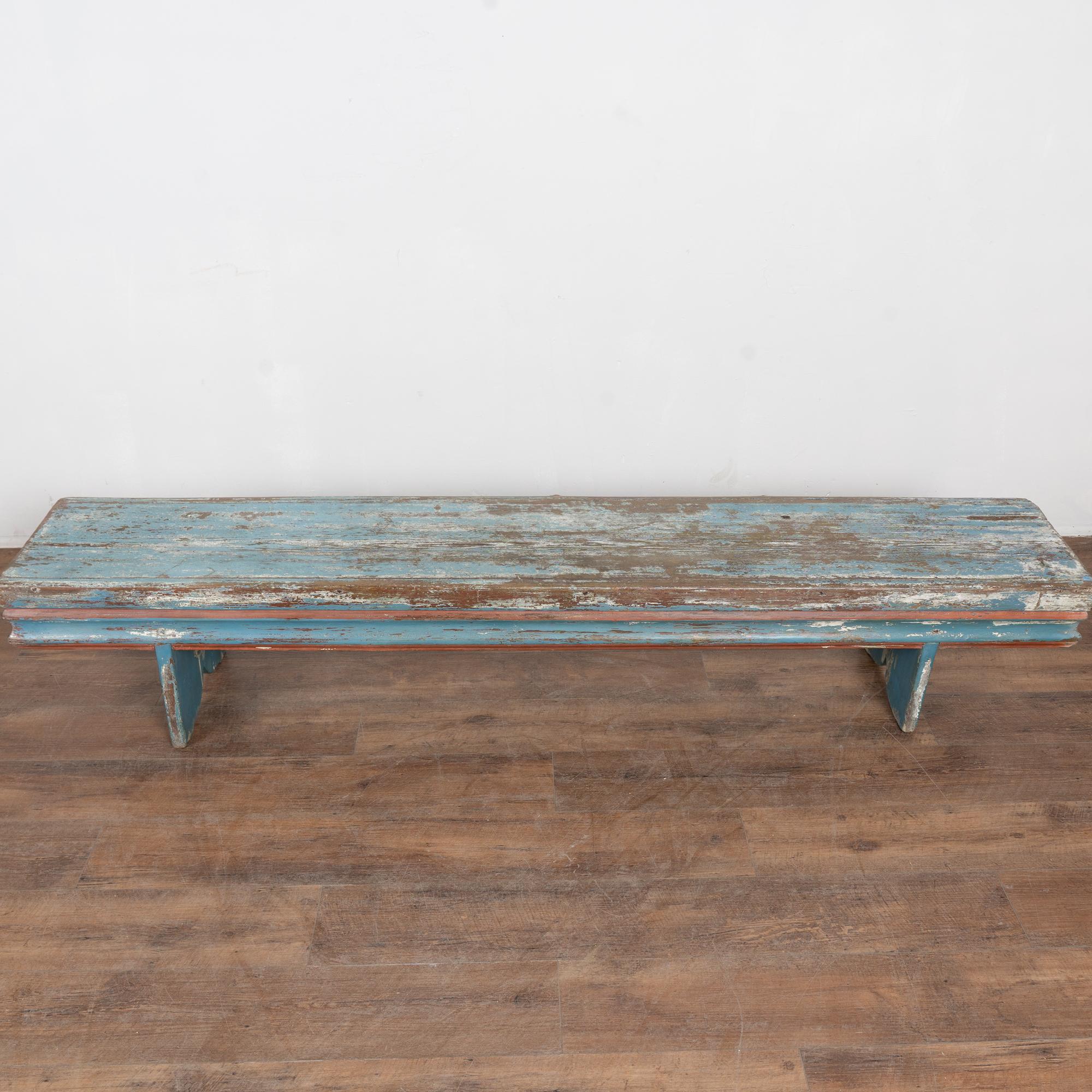Late 19th-century Swedish oak bench with original blue painted finish. The surface shows extensive authentic distress from generations of use, revealing natural oak below along with remnants of earlier white paint and traces of burgundy and red. The top plank shows age-related separation consistent with antique oak construction. Additional cracks, gouges, scratches, and surface wear are visible throughout, all reflective of its age and history. The bench has been restored, remains strong and stable, and is ready for daily use. It is the layered paint, worn edges, and exposed wood that give this bench its genuine Swedish country character. A practical and charming example of late 19th-century Scandinavian craftsmanship.