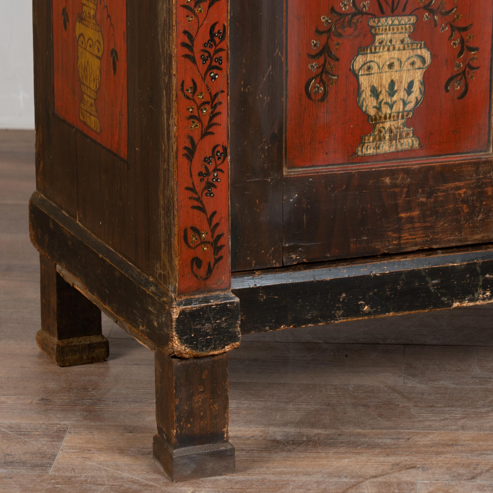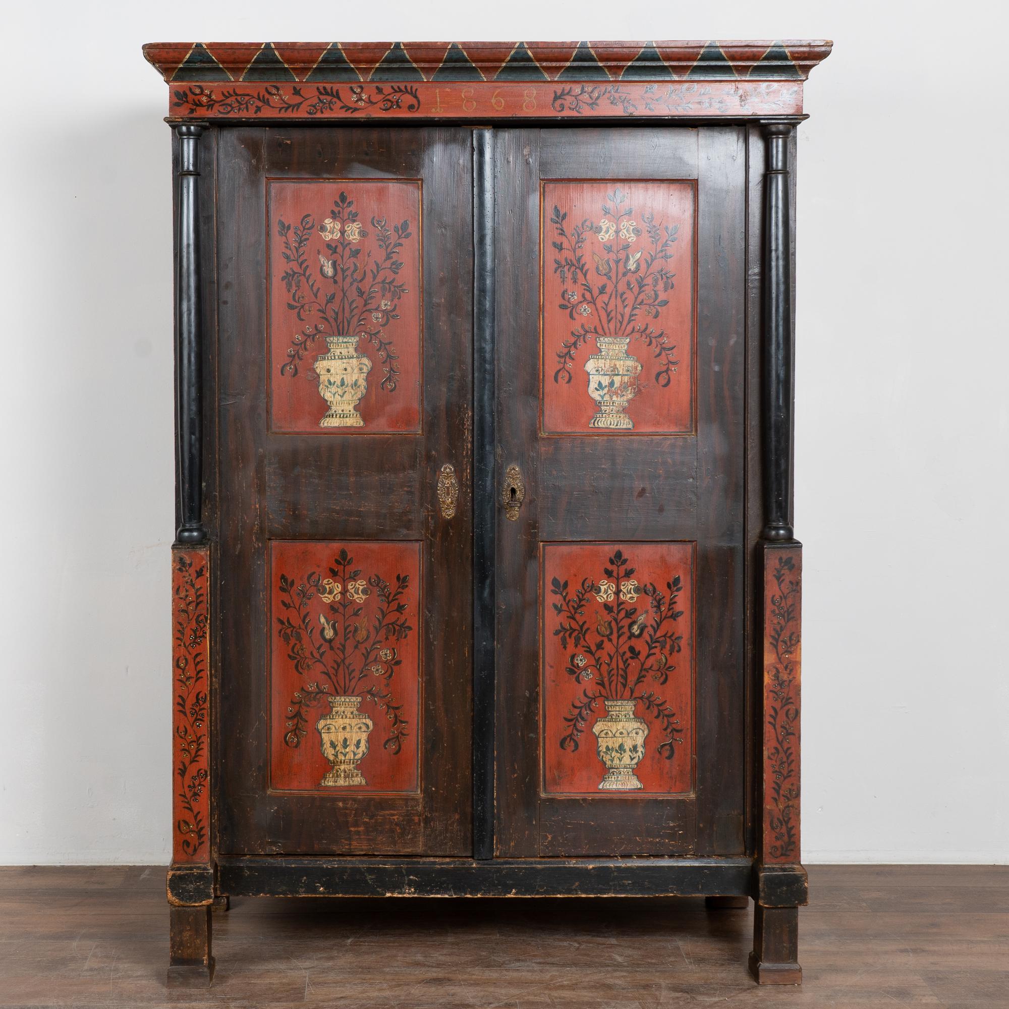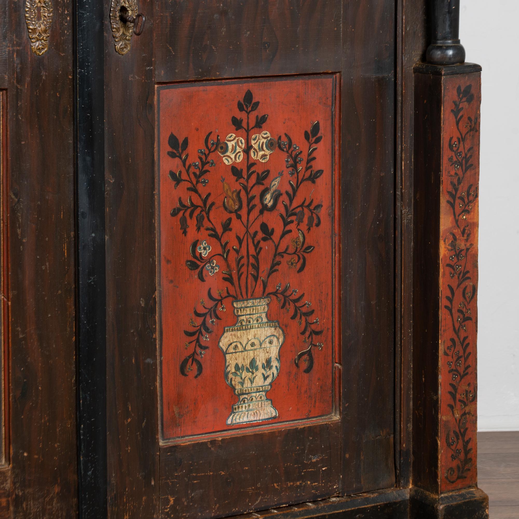 19th-century Hungarian two-door armoire crafted in pine and retaining its original hand-painted finish. The cabinet features turned columns flanking the doors and rests on simple block feet. The background is painted a warm brown tone, while the panels and trim are accented in brick red. Each of the four door panels displays a white painted urn filled with floral arrangements, complemented by vine motifs and decorative red detailing throughout.