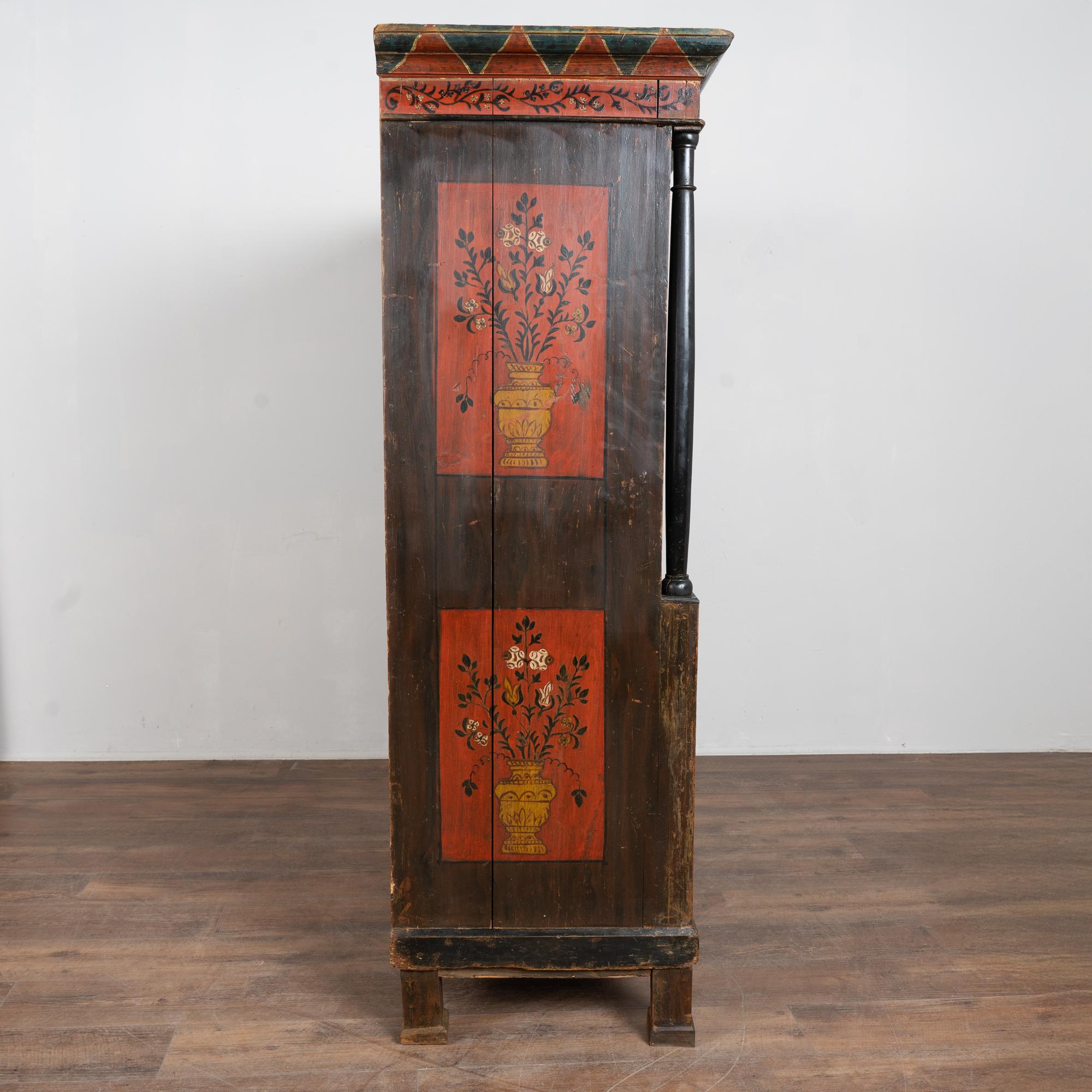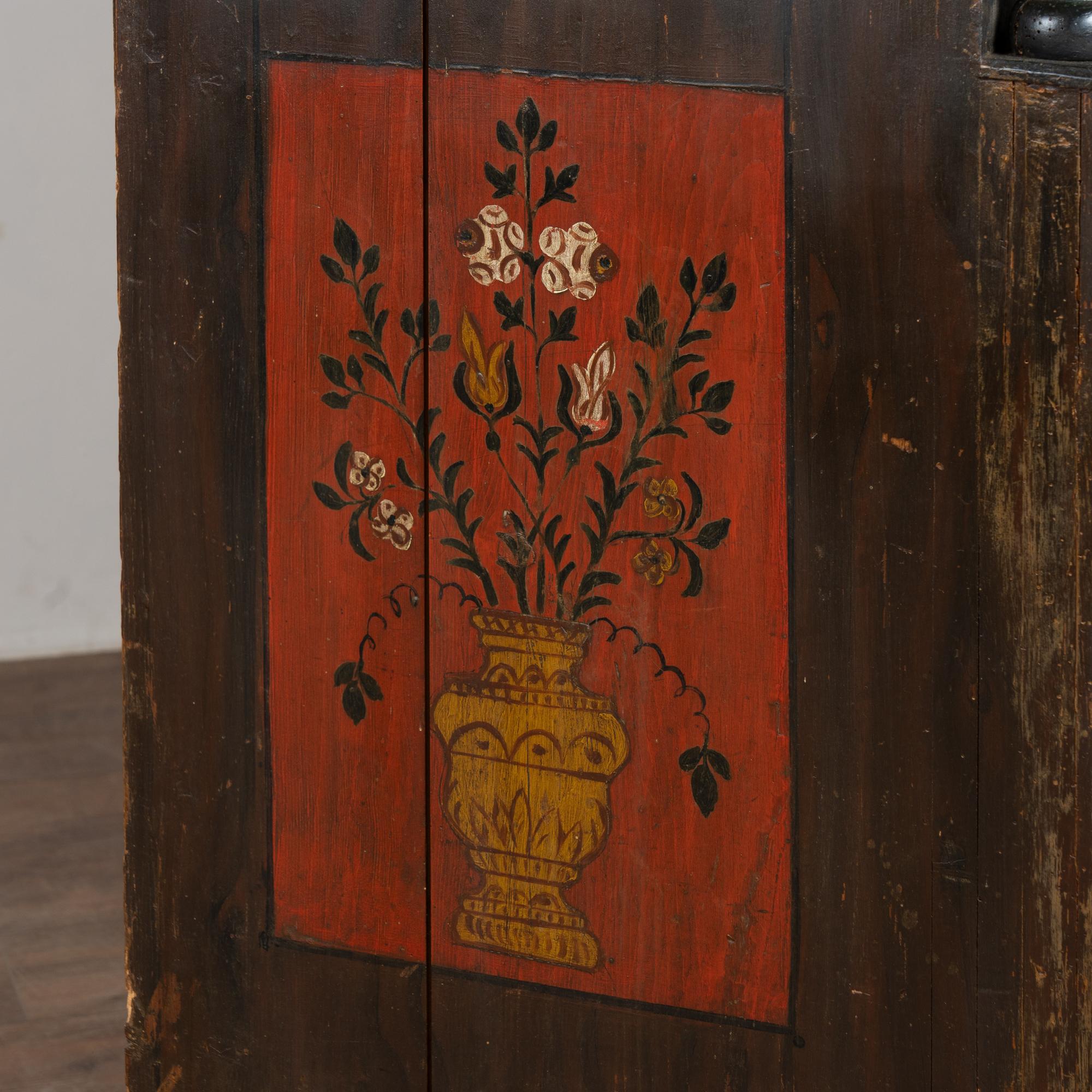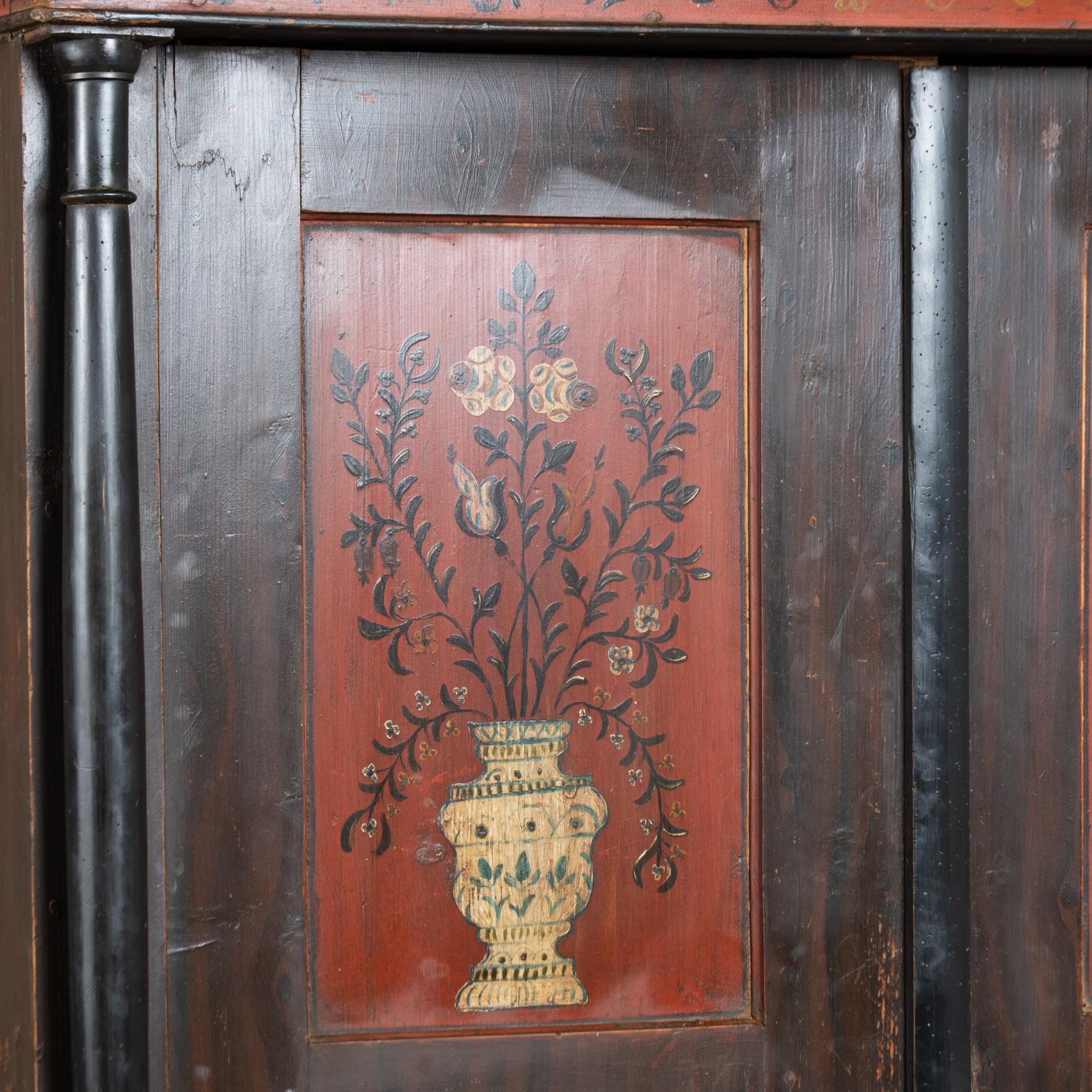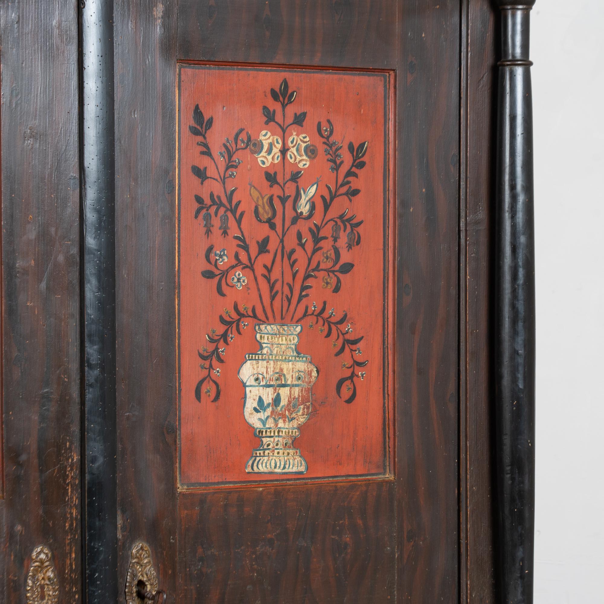 19th-century Hungarian two-door armoire crafted in pine and retaining its original hand-painted finish. The cabinet features turned columns flanking the doors and rests on simple block feet. The background is painted a warm brown tone, while the panels and trim are accented in brick red. Each of the four door panels displays a white painted urn filled with floral arrangements, complemented by vine motifs and decorative red detailing throughout.