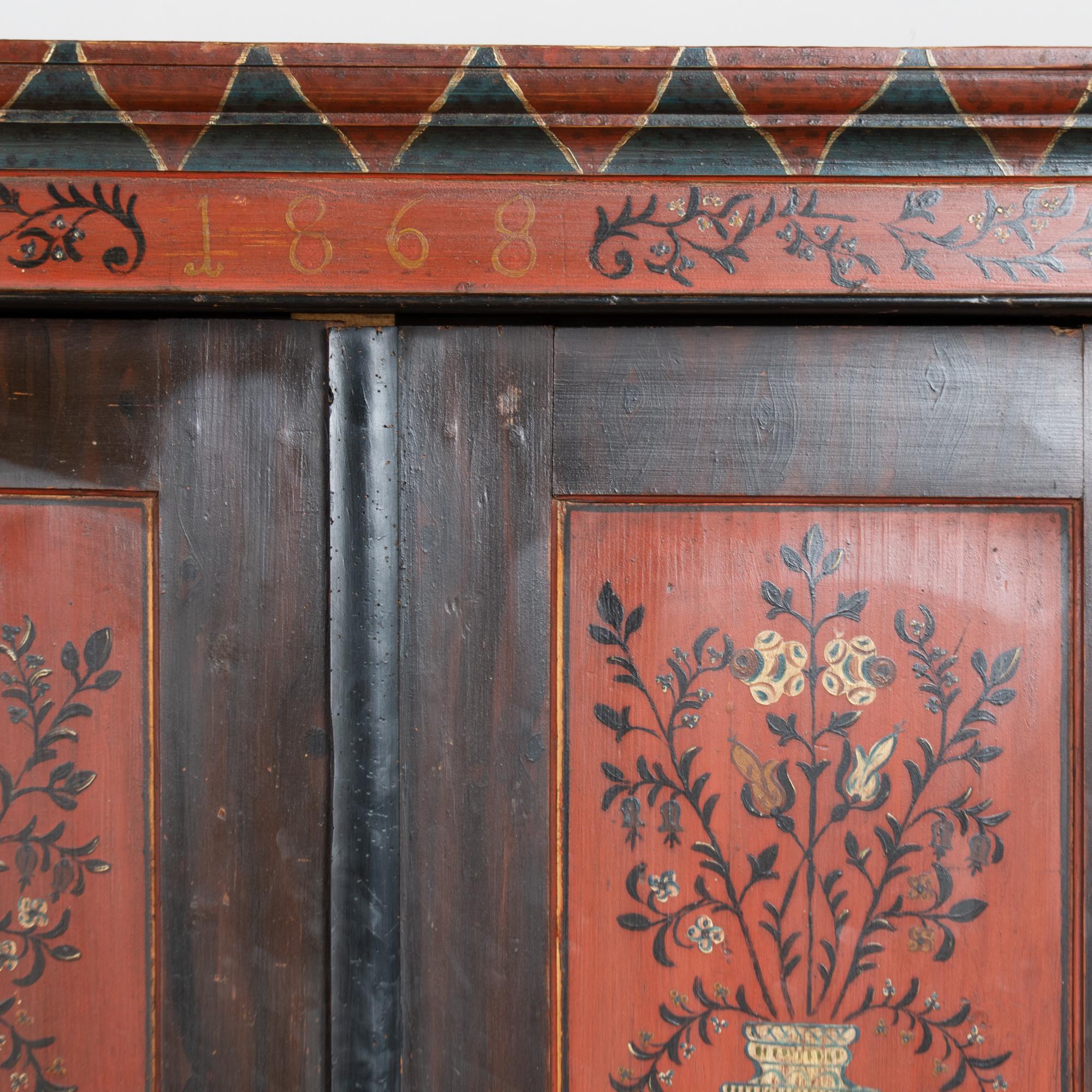 Centered in the upper crown is the painted date 1868, suggesting the armoire may have originally served as a wedding or dowry piece. Some nicks, cracks, and distress to the painted surface are visible, consistent with age. The original lock remains and functions somewhat loosely. The interior opens to reveal two shelves showing age-related separation yet remaining solid and functional. The armoire has been restored, is strong, stable, and ready for use.