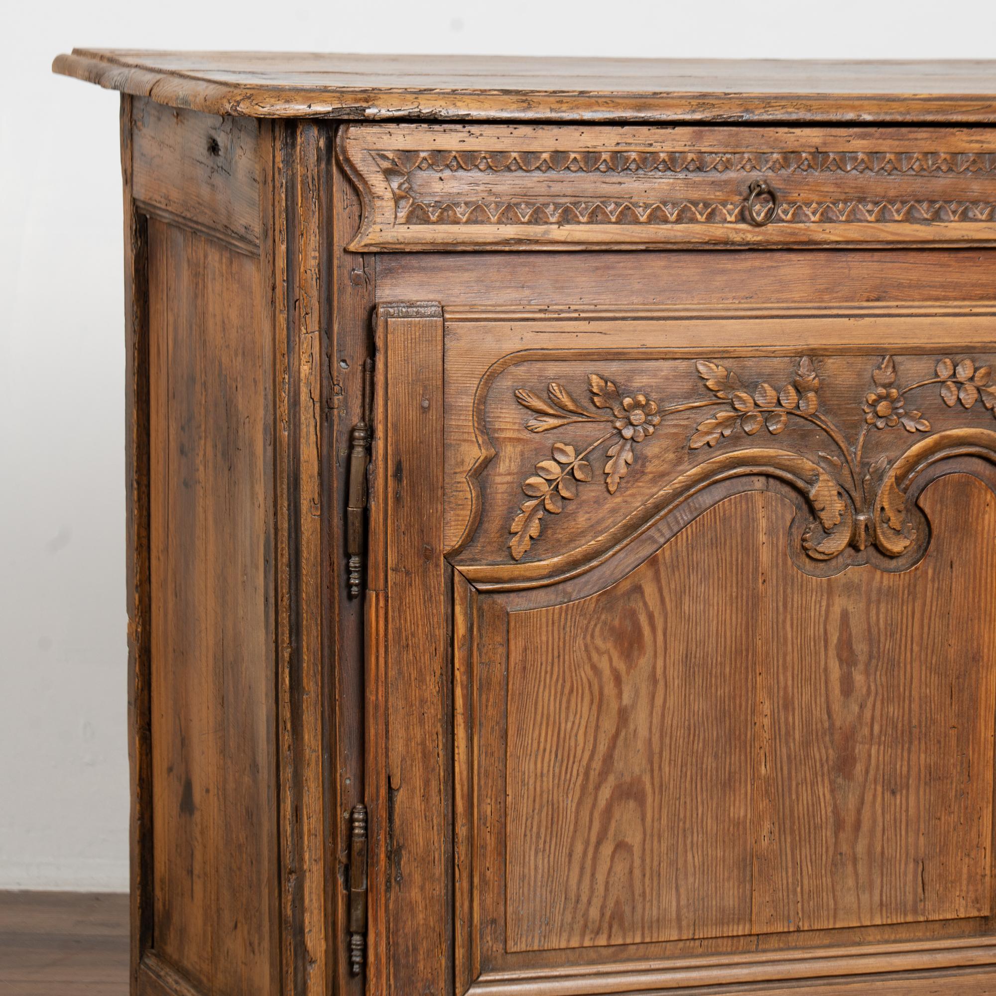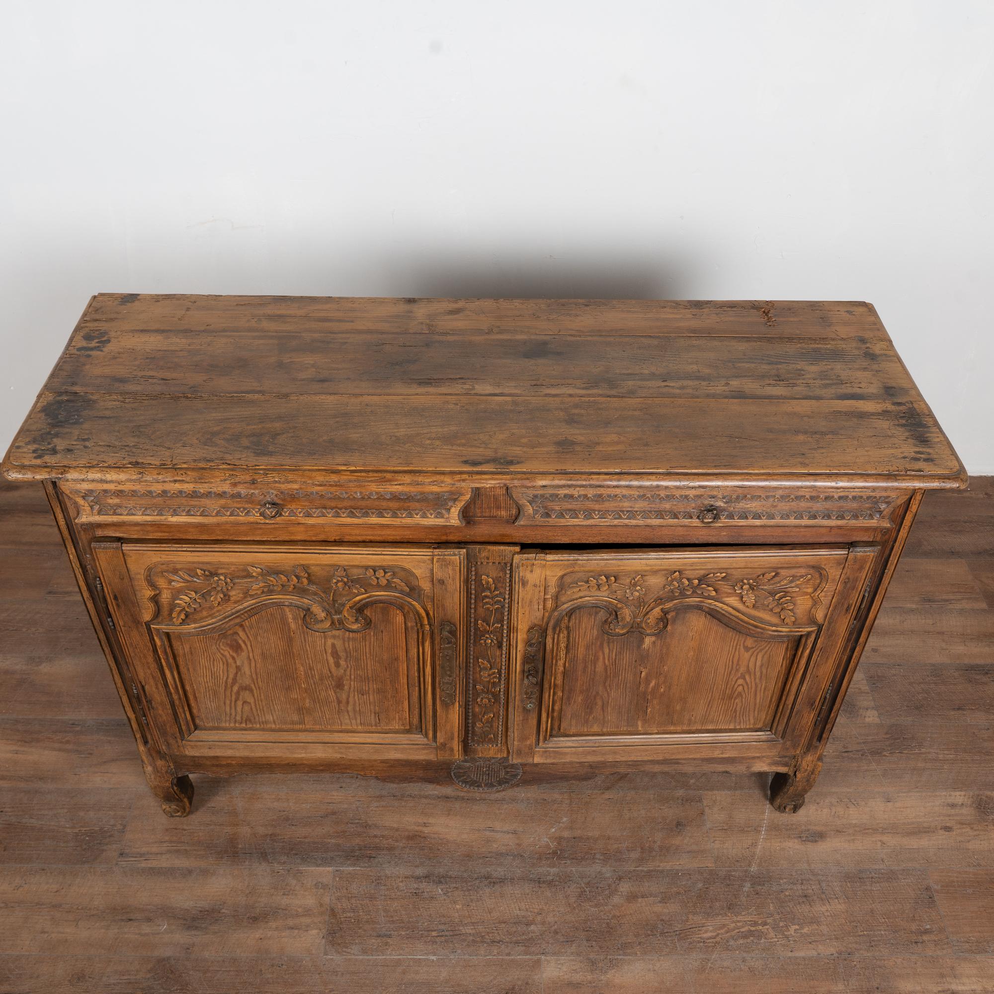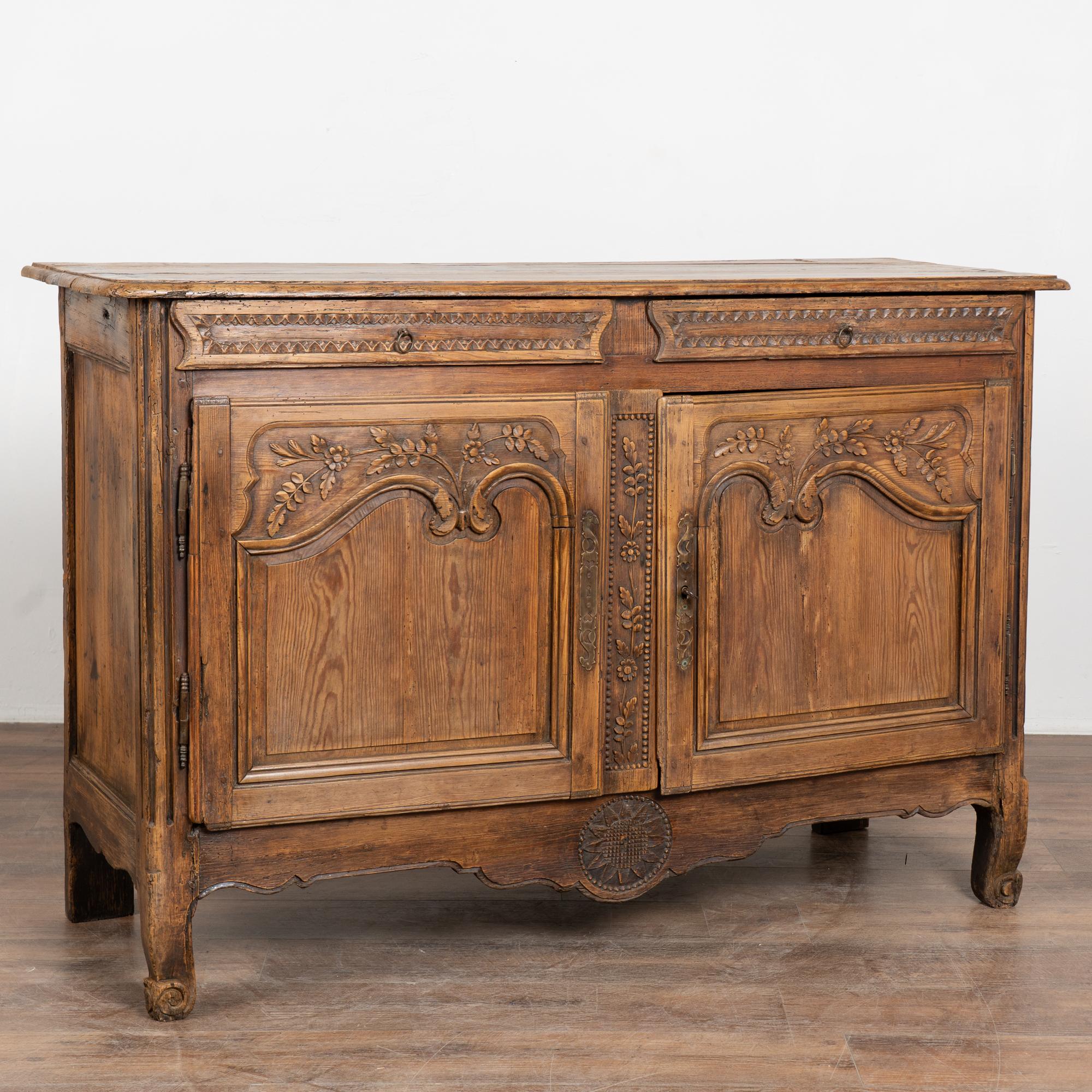 18th-century French oak sideboard featuring traditional provincial carving with floral, vine, and leaf motifs throughout. Two narrow upper drawers sit above two cabinet doors, each detailed with classic French escutcheons. The key remains and functions in the original lock.