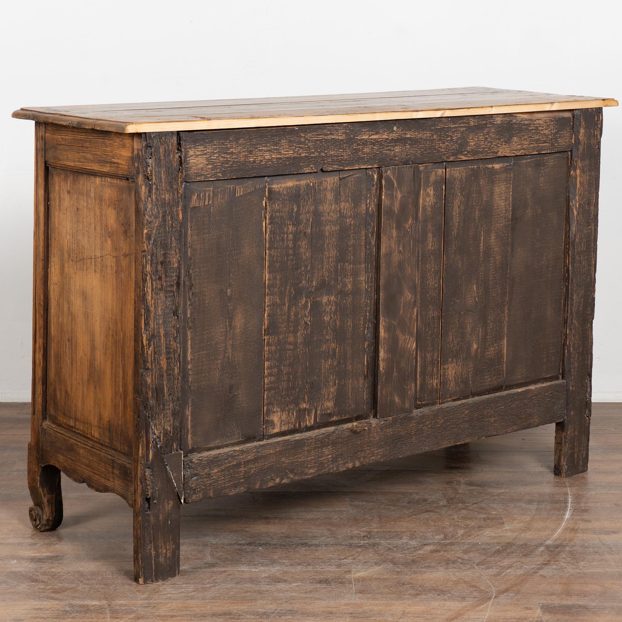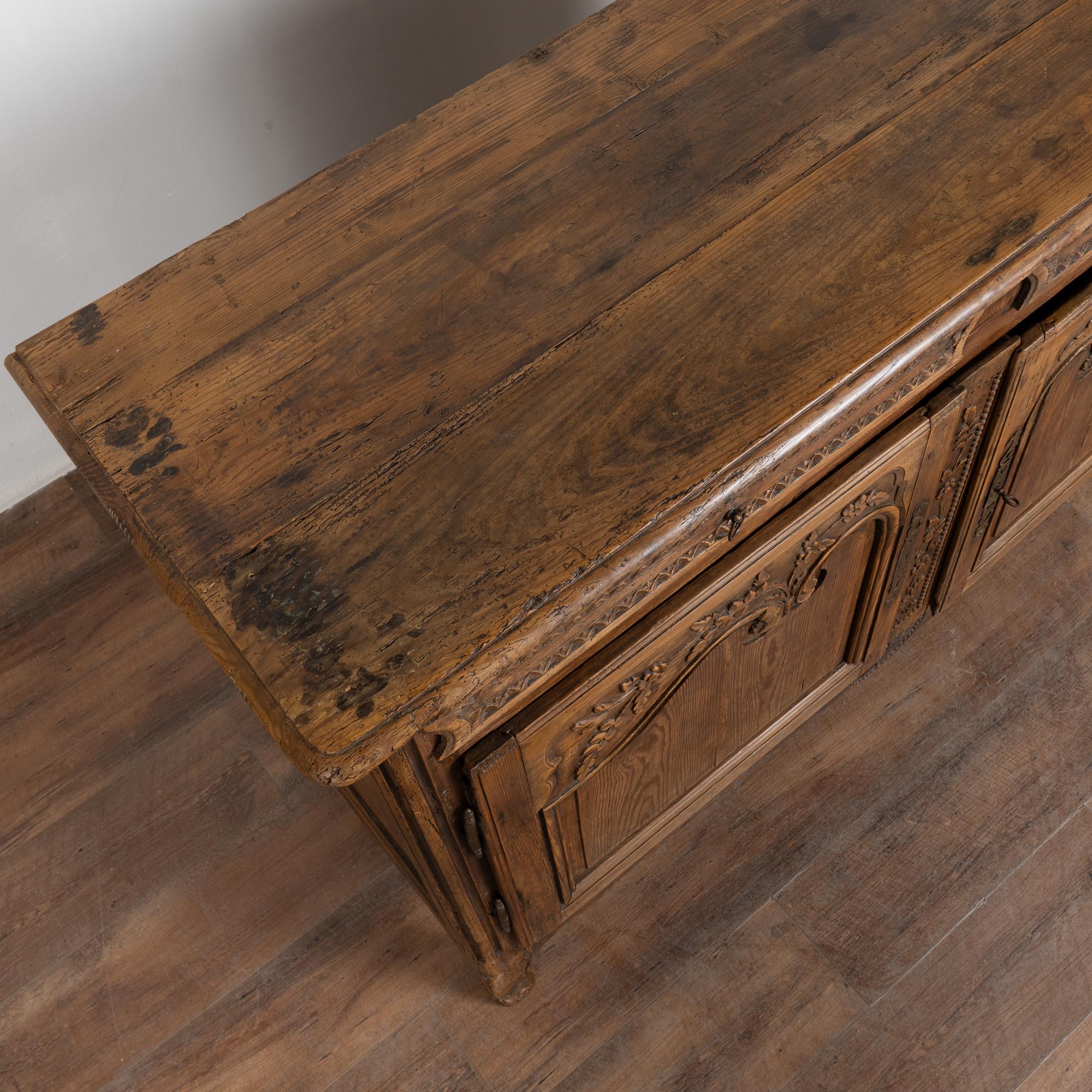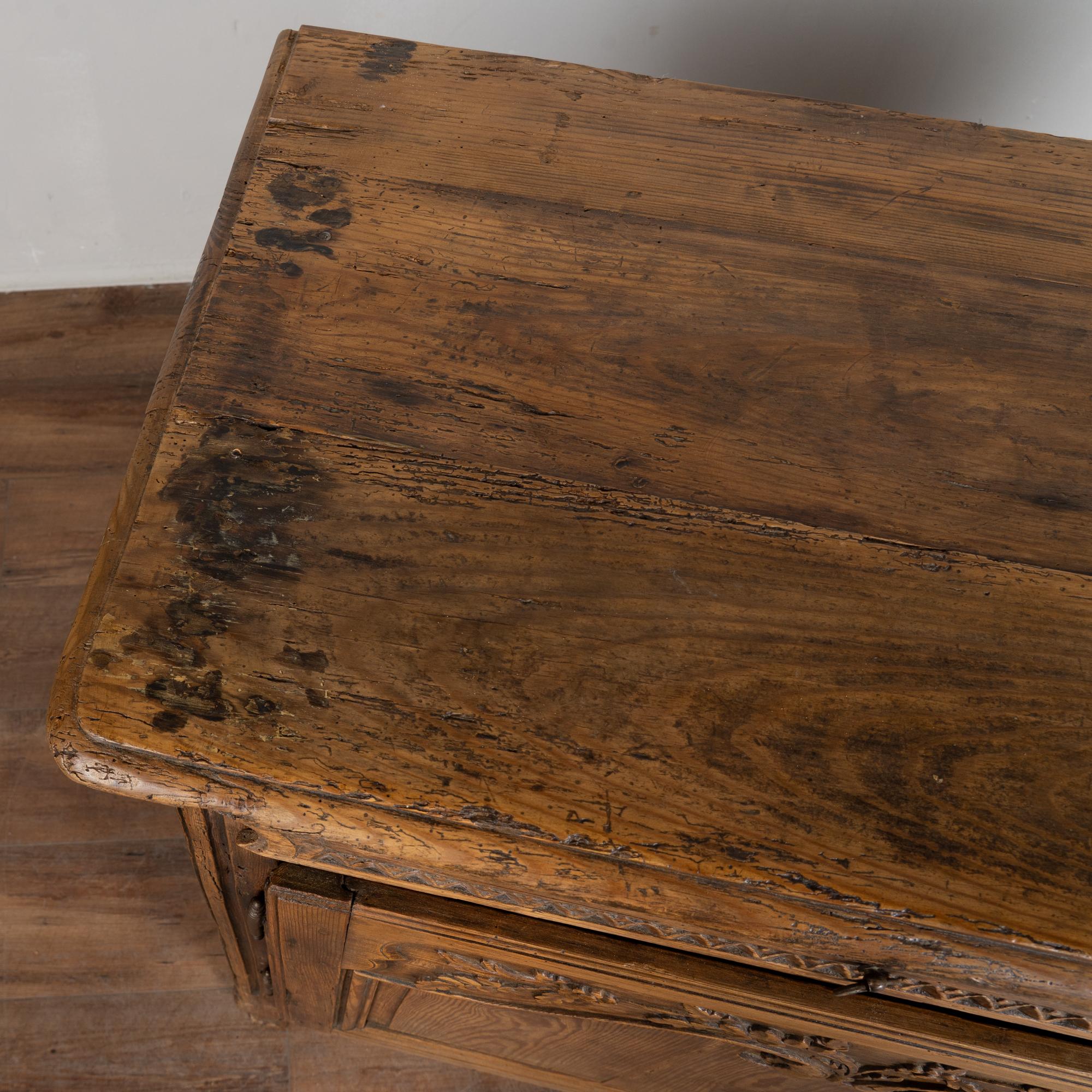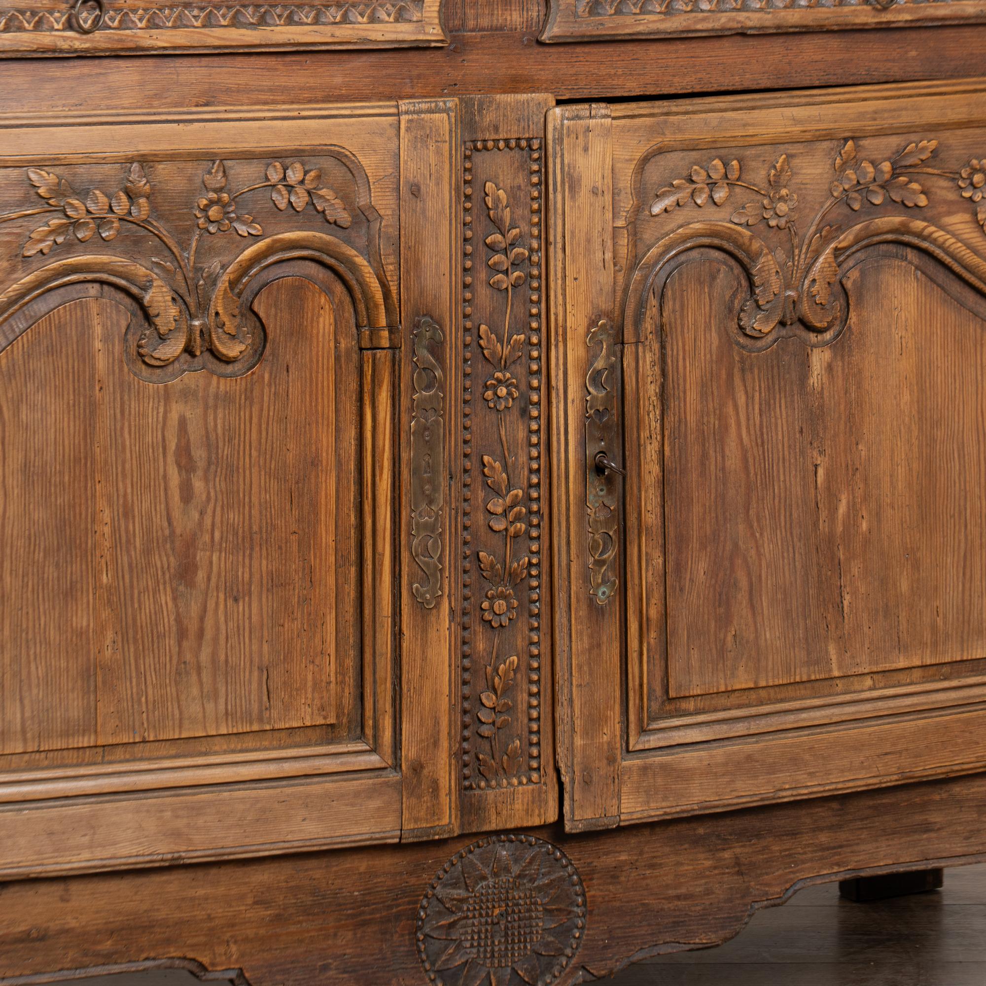 The scalloped skirt is centered with a carved sunflower medallion, and each door panel displays refined carved detail typical of the period. Age-related wear, including surface distress, scratches, cracks, stains, and residual wormhole activity, is visible throughout and consistent with its age. Separation of planks is present along both sides, and an old repair is visible around the front right leg. The piece has been restored, is strong, stable, and ready for use.