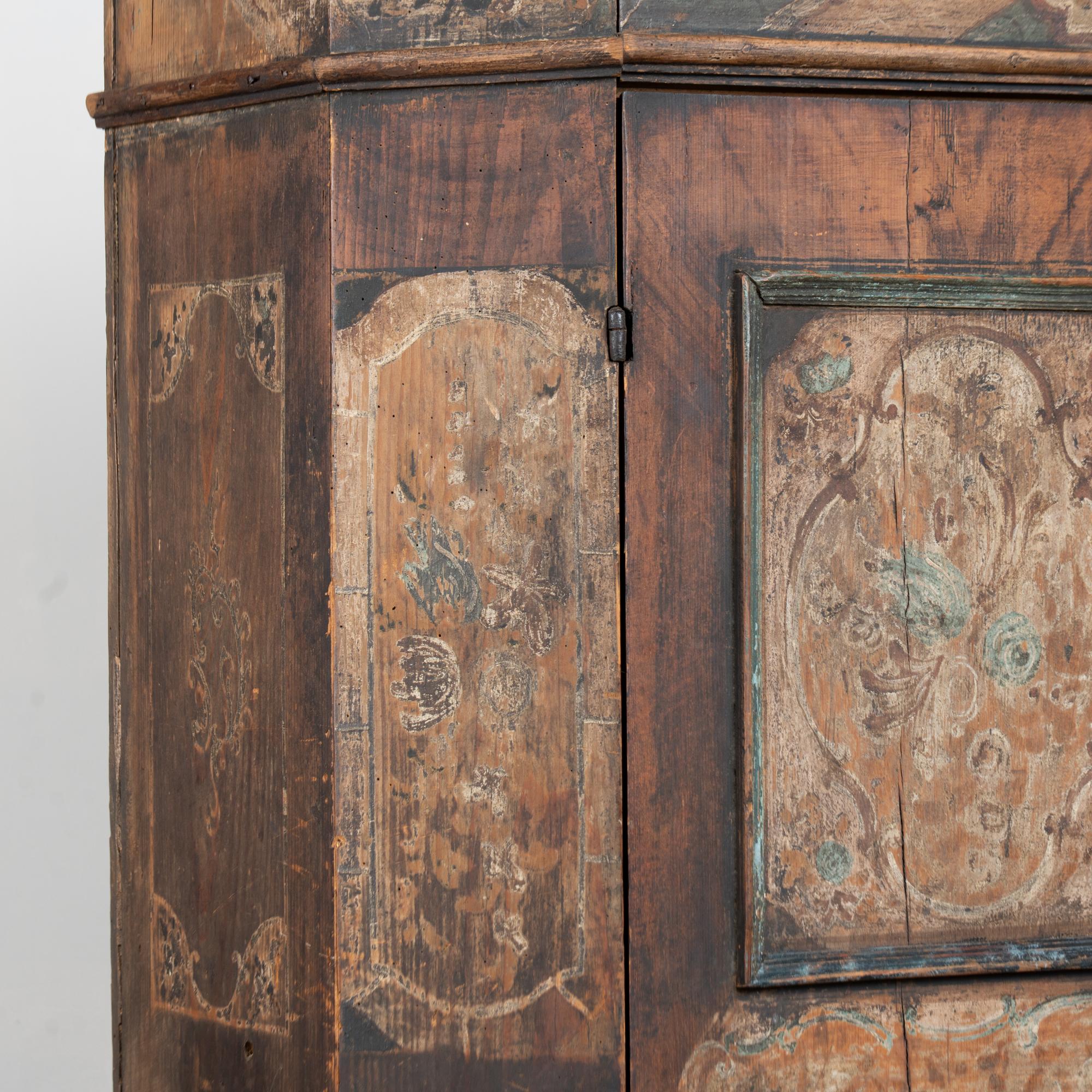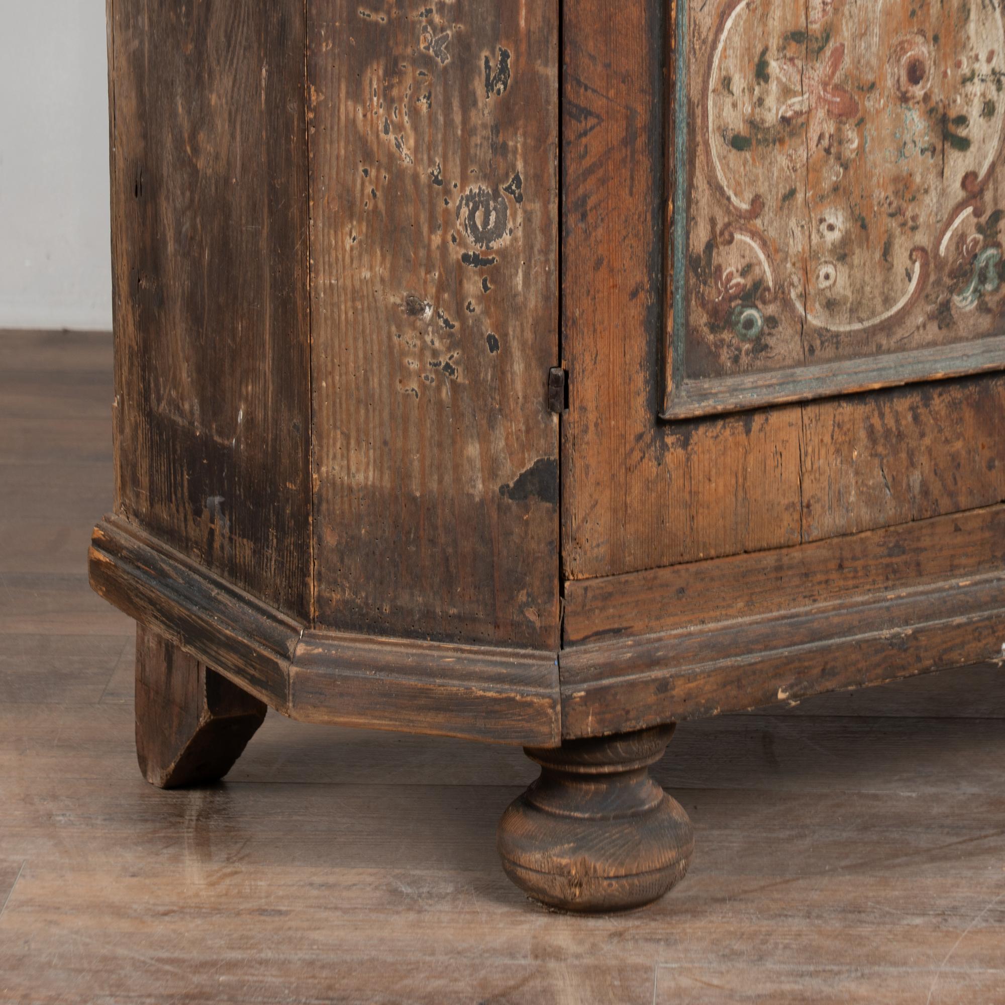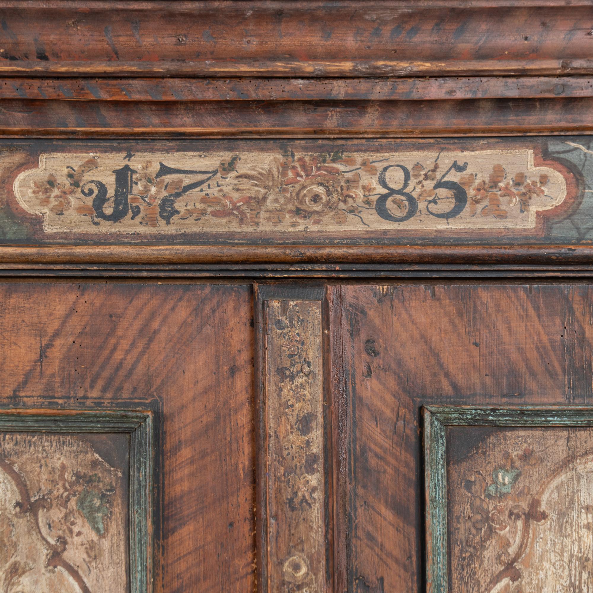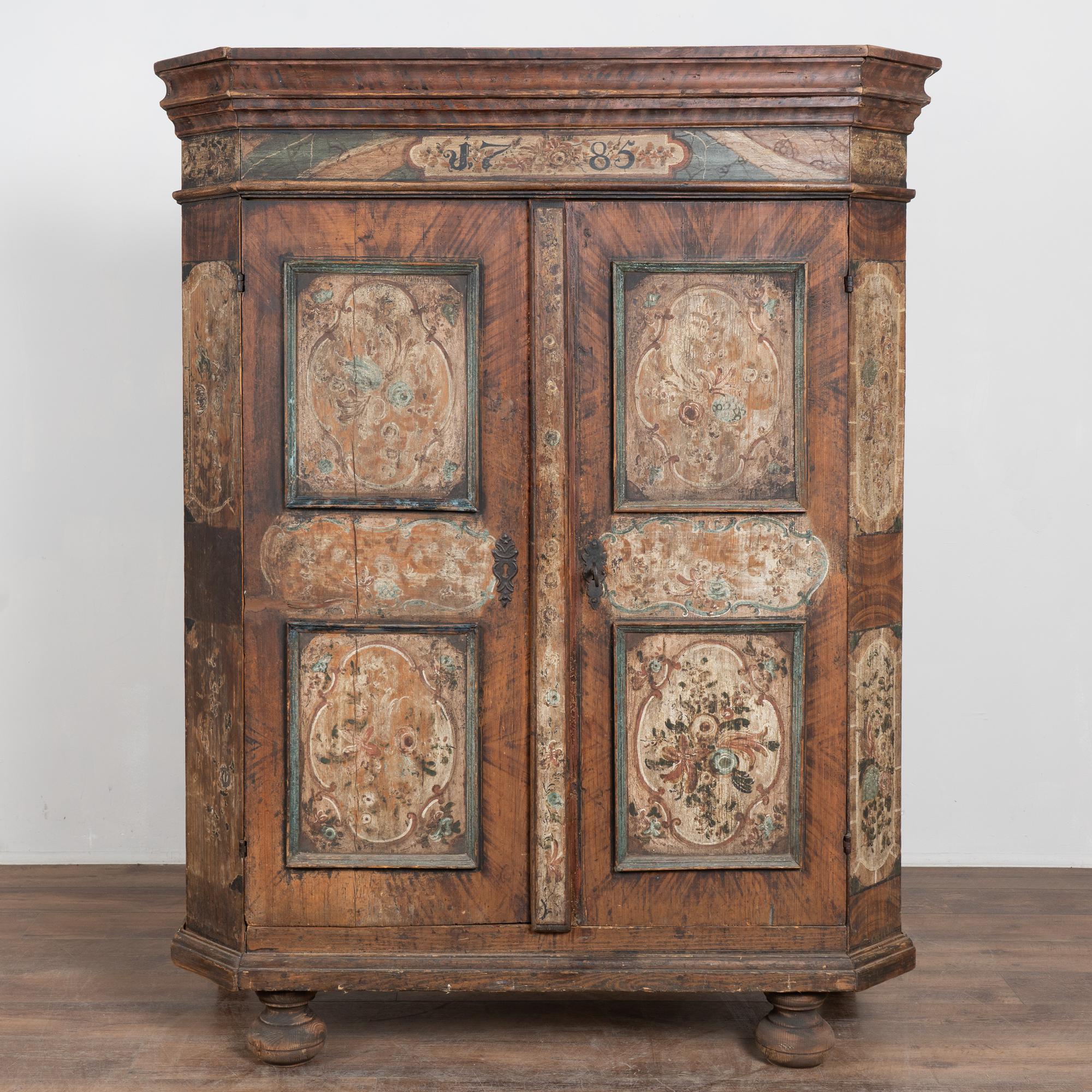 Original hand-painted Austrian pine armoire dated 1785. The cabinet retains its original painted finish in soft teal, pale blue, white, and faded red tones. Floral motifs decorate the four front door panels and canted sides, while beneath the crown a faux marble motif frames the central date of 1785, suggesting the piece may have originally served as a wedding or dowry cabinet.