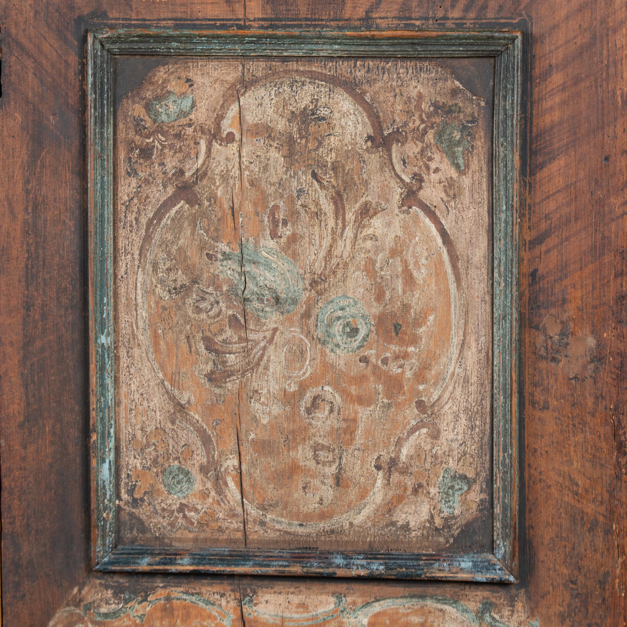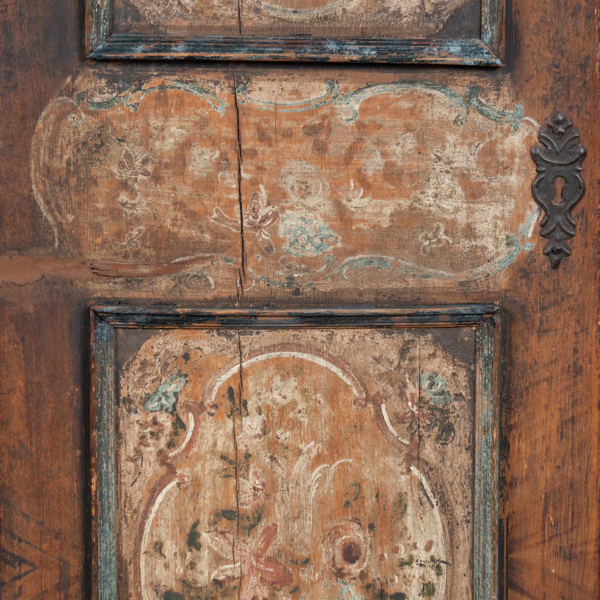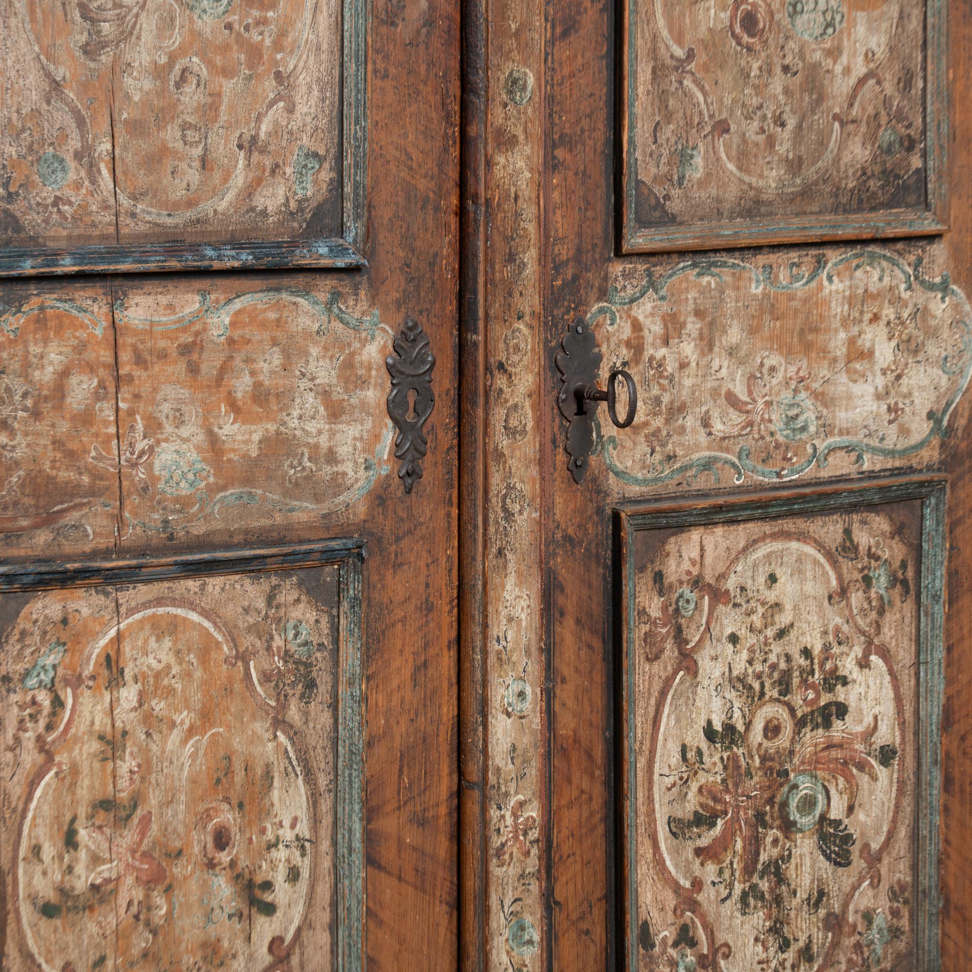 The original lock and key remain present and functional. Long wrought iron hinges run the length of the doors. The interior reveals divided storage sections, with a hanging rod on the left side. Age-related distress is visible throughout, including surface wear, scratches, nicks, cracks along the left door, and scattered residual dried wormhole activity that does not impact structural integrity. The armoire has been restored, is strong, stable, and ready for use. A beautiful and authentic example of late 18th-century Austrian craftsmanship.