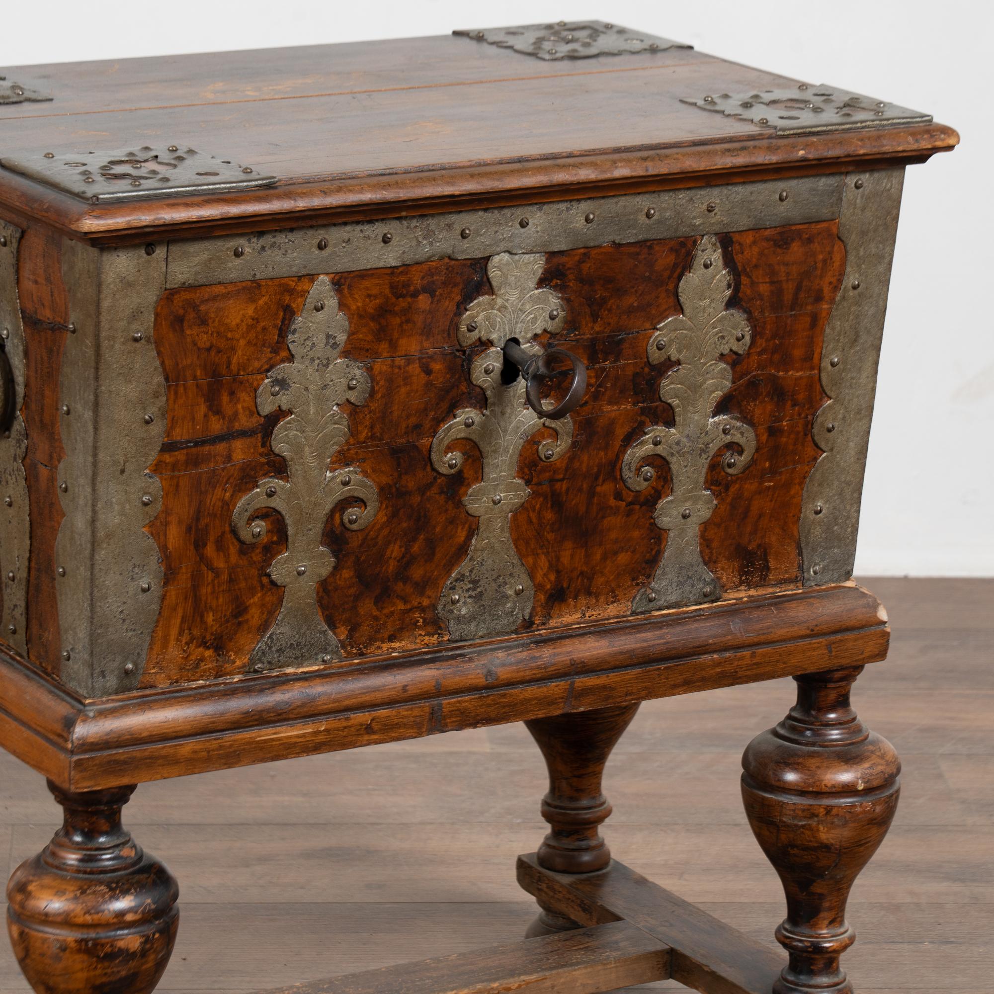 Early 19th-century Swedish trunk or lockbox crafted in pine and raised on turned legs with a stretcher base, creating a distinctive and functional side table. The trunk retains its original faux wood painted finish, adding depth and character to the piece.
