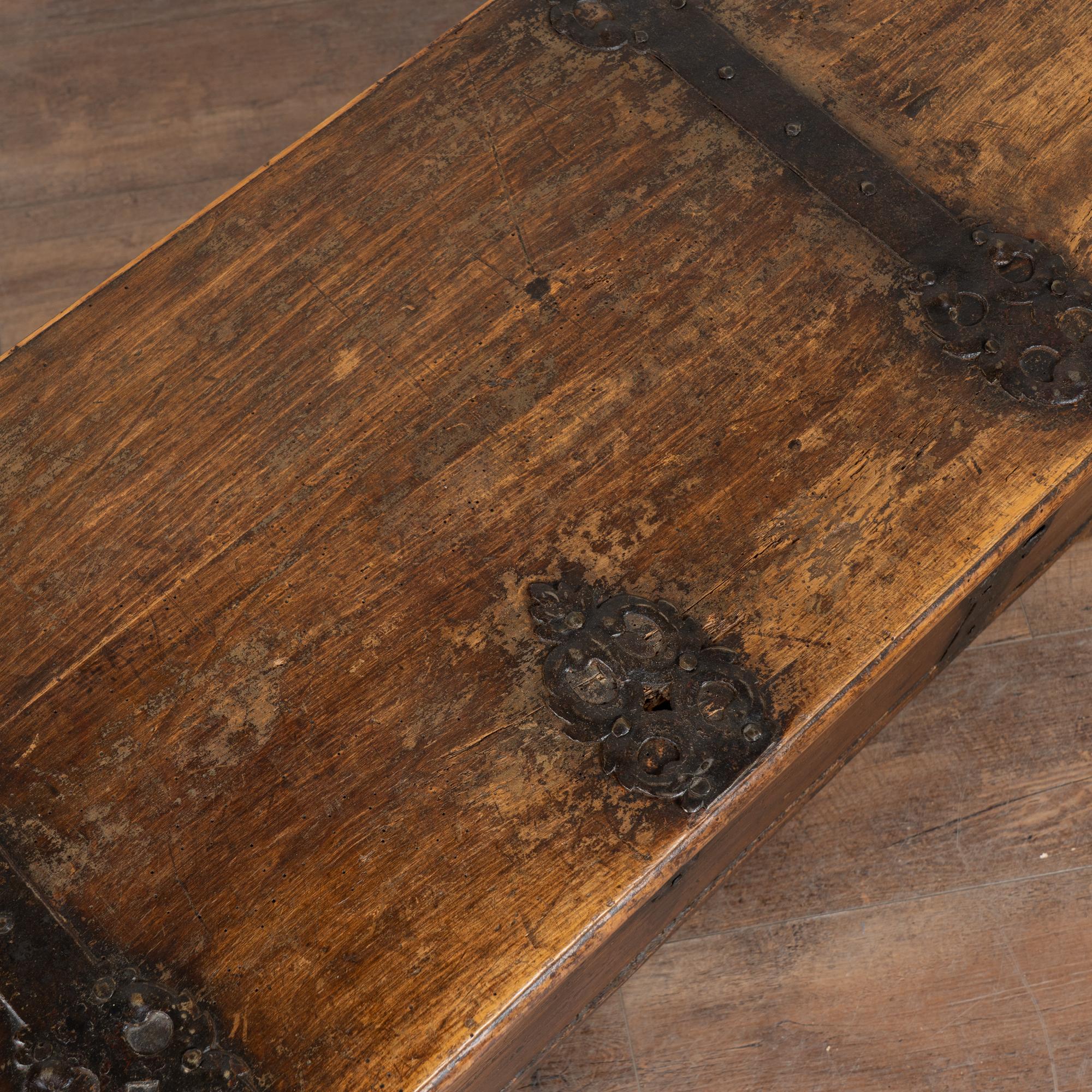 The age of this trunk is revealed in the deep, dark patina of the aged pine. The heavy chest rests on four large bun feet. Typical age related cracks, gouges, and distress are seen throughout commensurate with generations of use. Dried old wormhole activity is present throughout, in particular the interior bottom and back, but does not impact the strength or integrity of the trunk itself.
