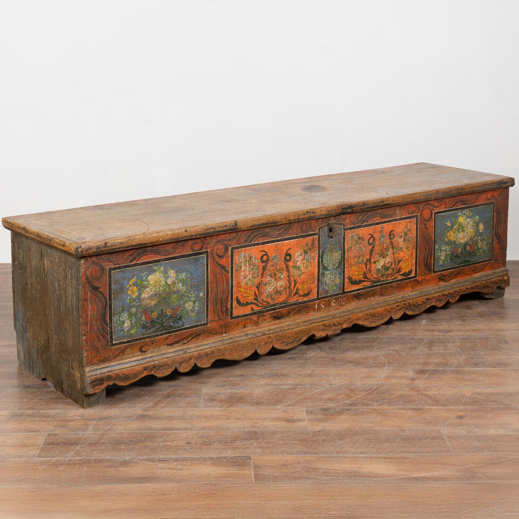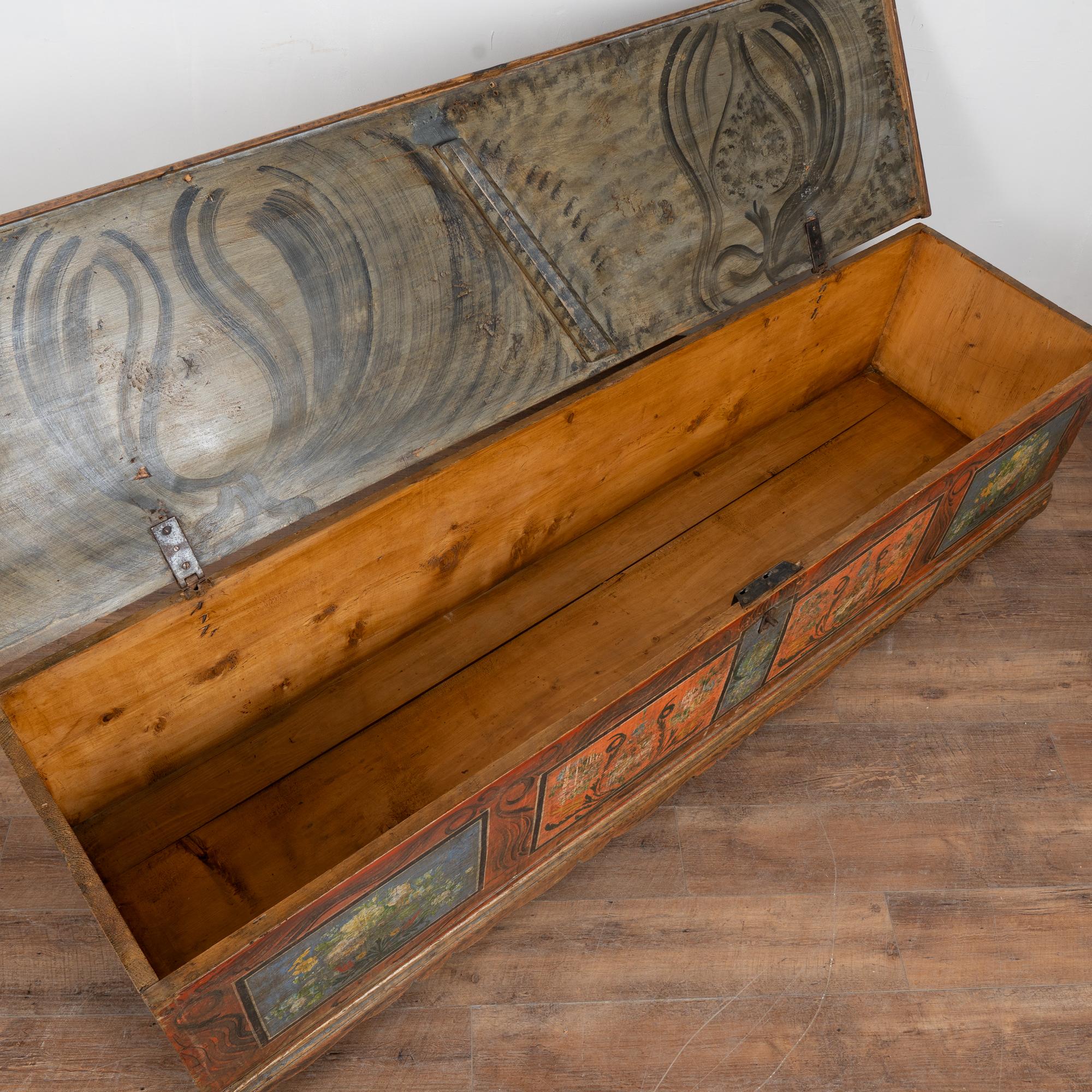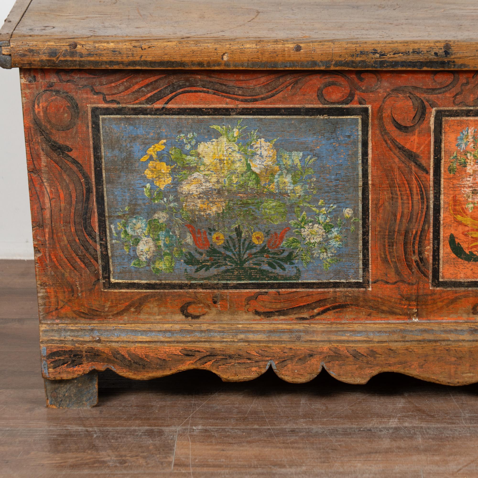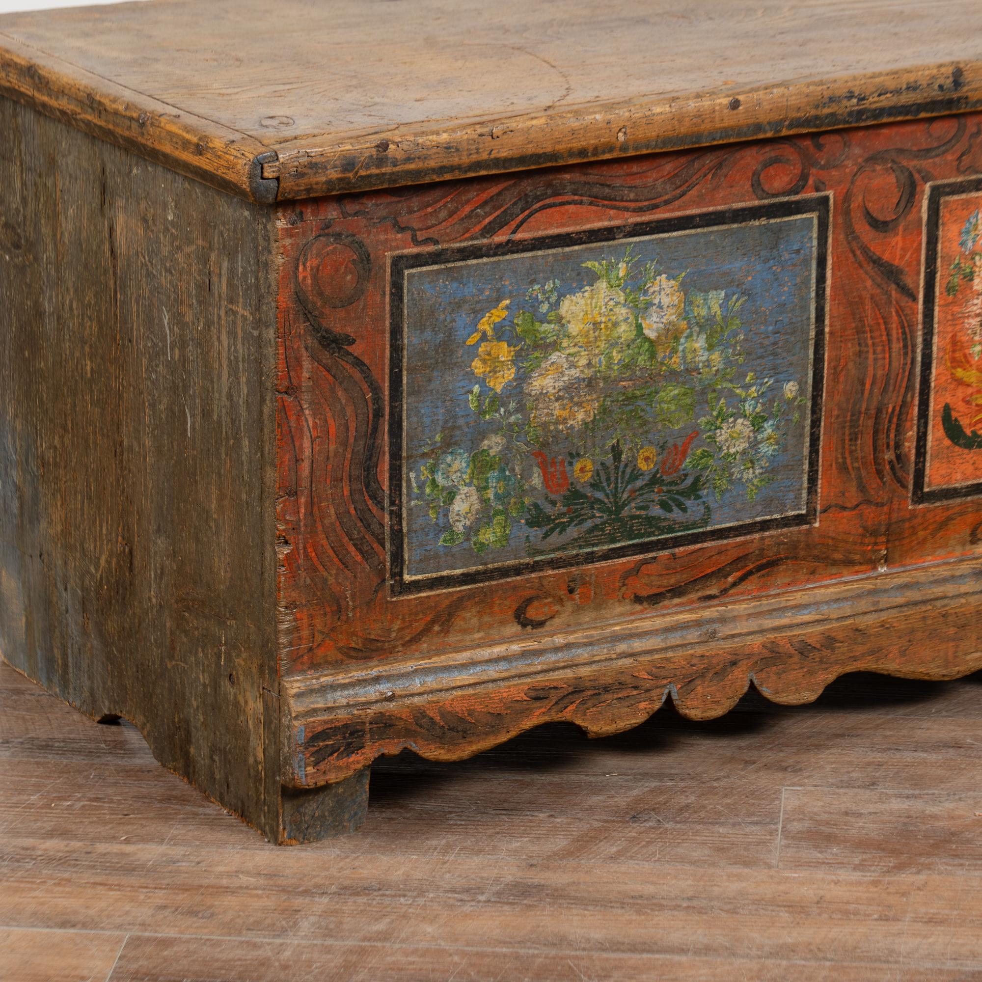 The painted finish is all original on this rustic pine flat top narrow trunk which may also serve as a bench. Flowers were a traditional embellishment as seen on the front of this handcrafted trunk with multi colored flowers contrasting against the blue and red-orange panel backgrounds. The deep patina of the pine top reflects generations of use, and much wear is seen along the top. The faux wood painted background was also a traditional style motif of the era.