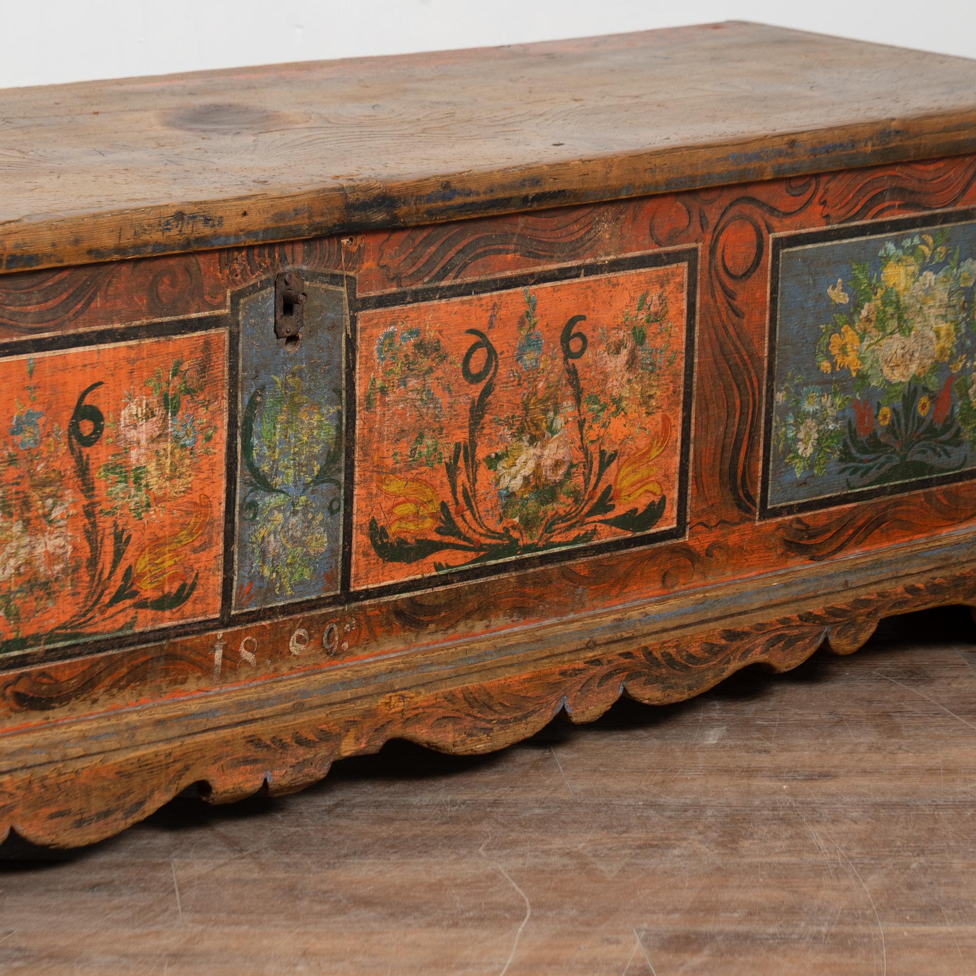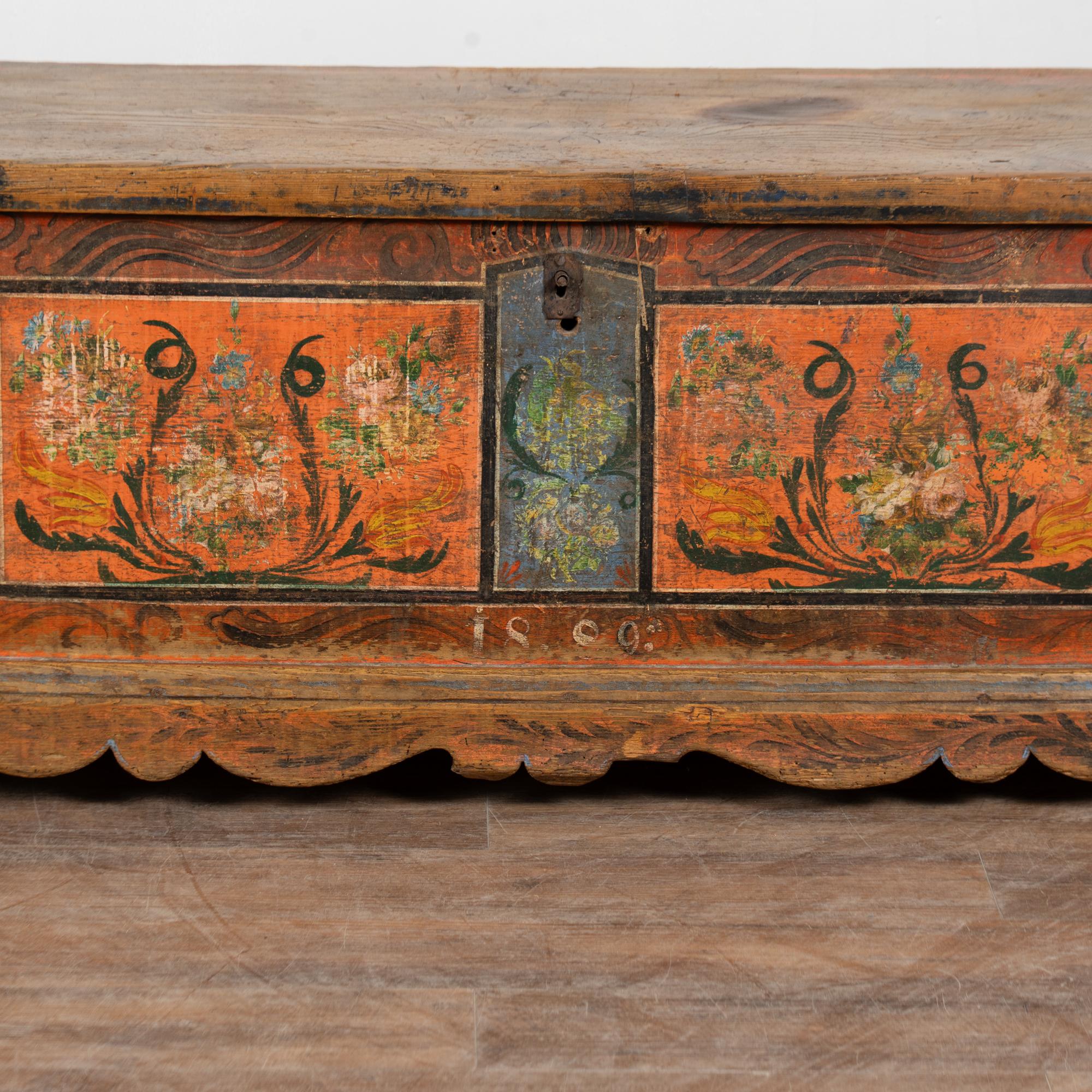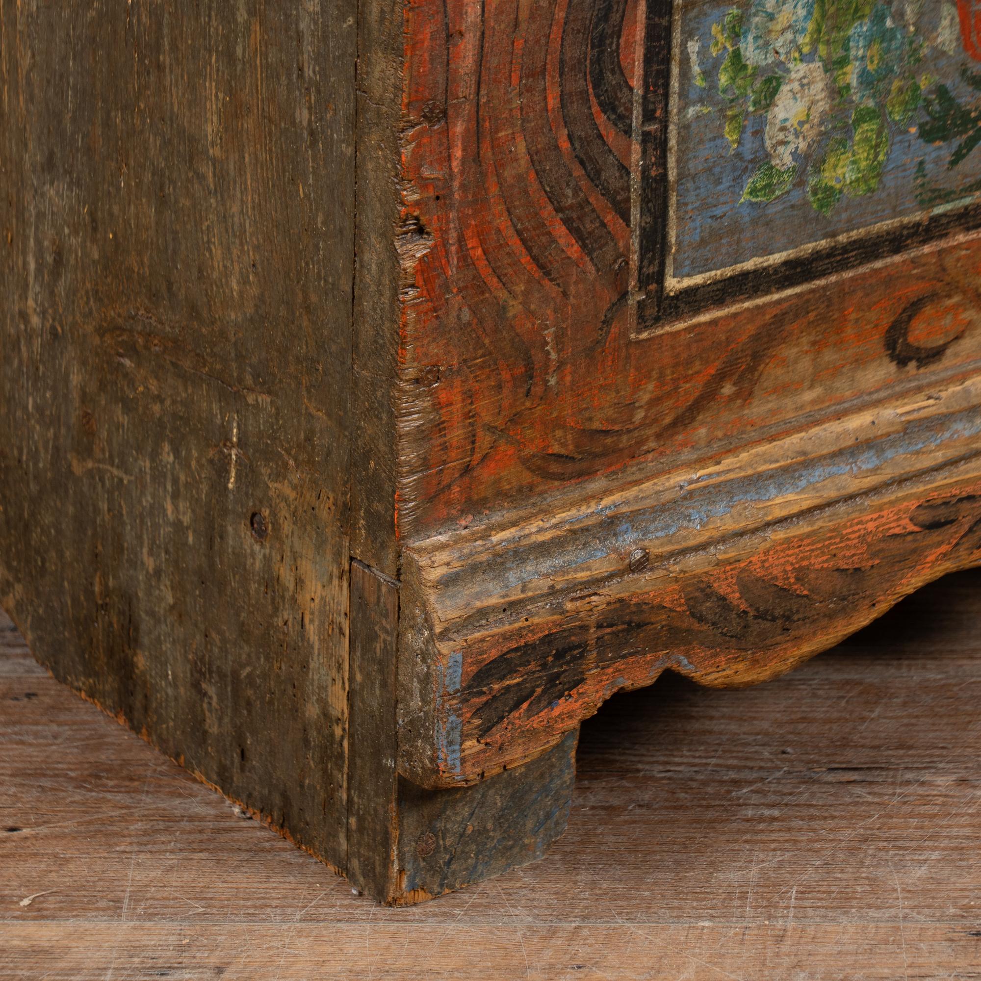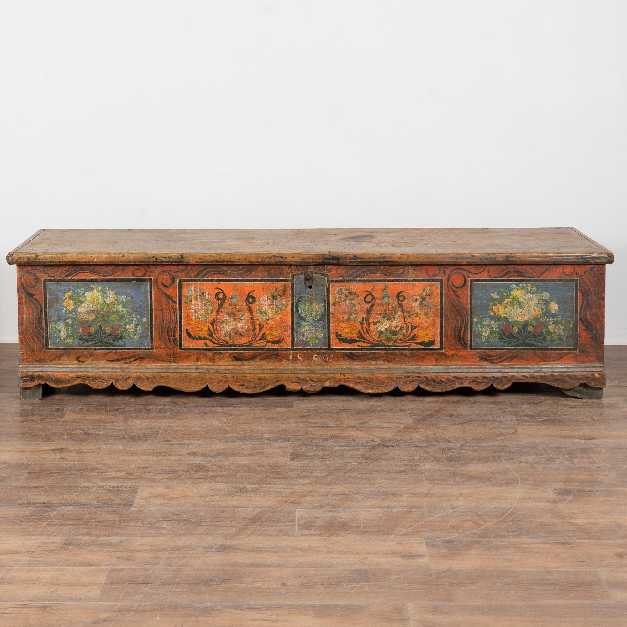 The painted finish is all original on this rustic pine flat top narrow trunk which may also serve as a bench. Flowers were a traditional embellishment as seen on the front of this handcrafted trunk with multi colored flowers contrasting against the blue and red-orange panel backgrounds. The deep patina of the pine top reflects generations of use, and much wear is seen along the top. The faux wood painted background was also a traditional style motif of the era.