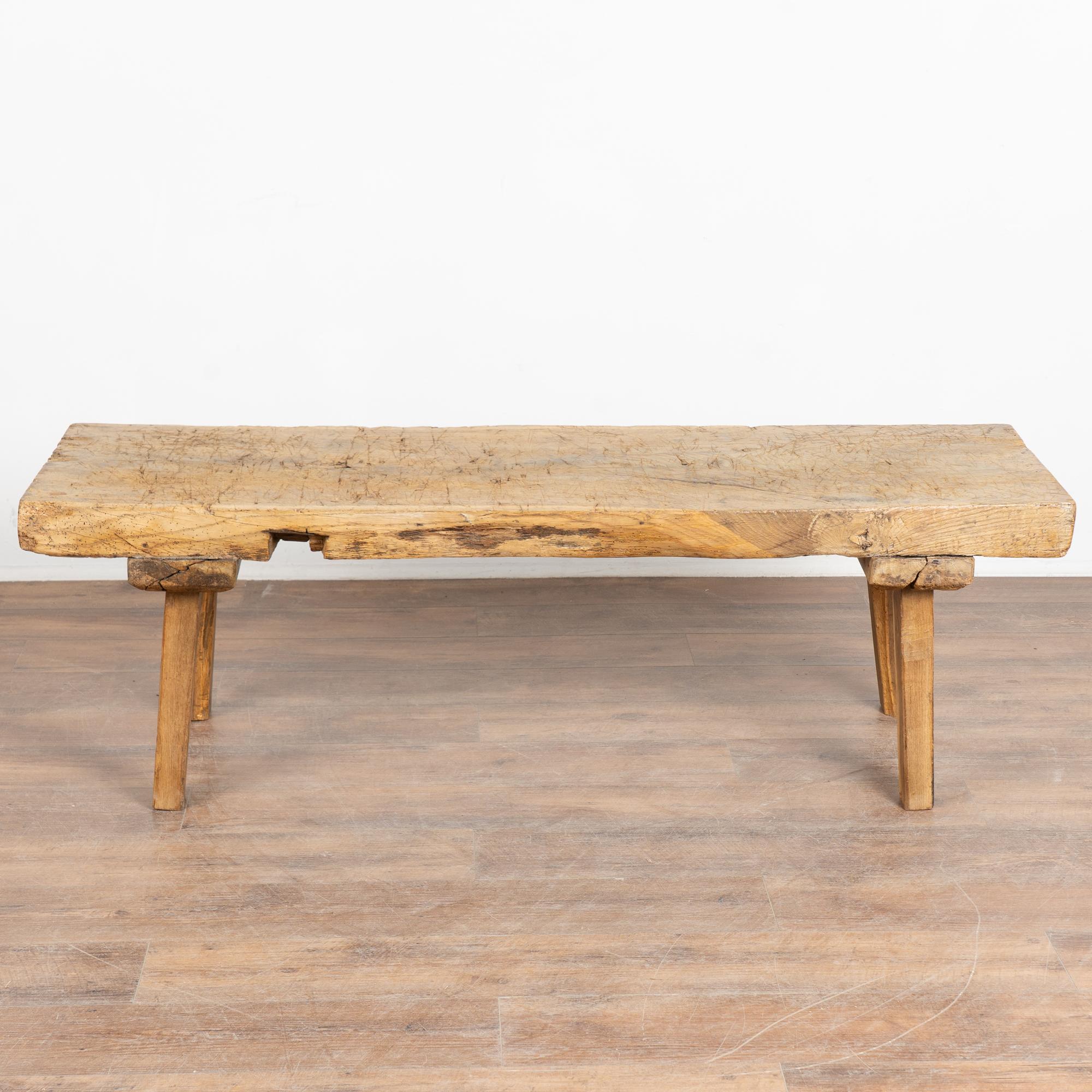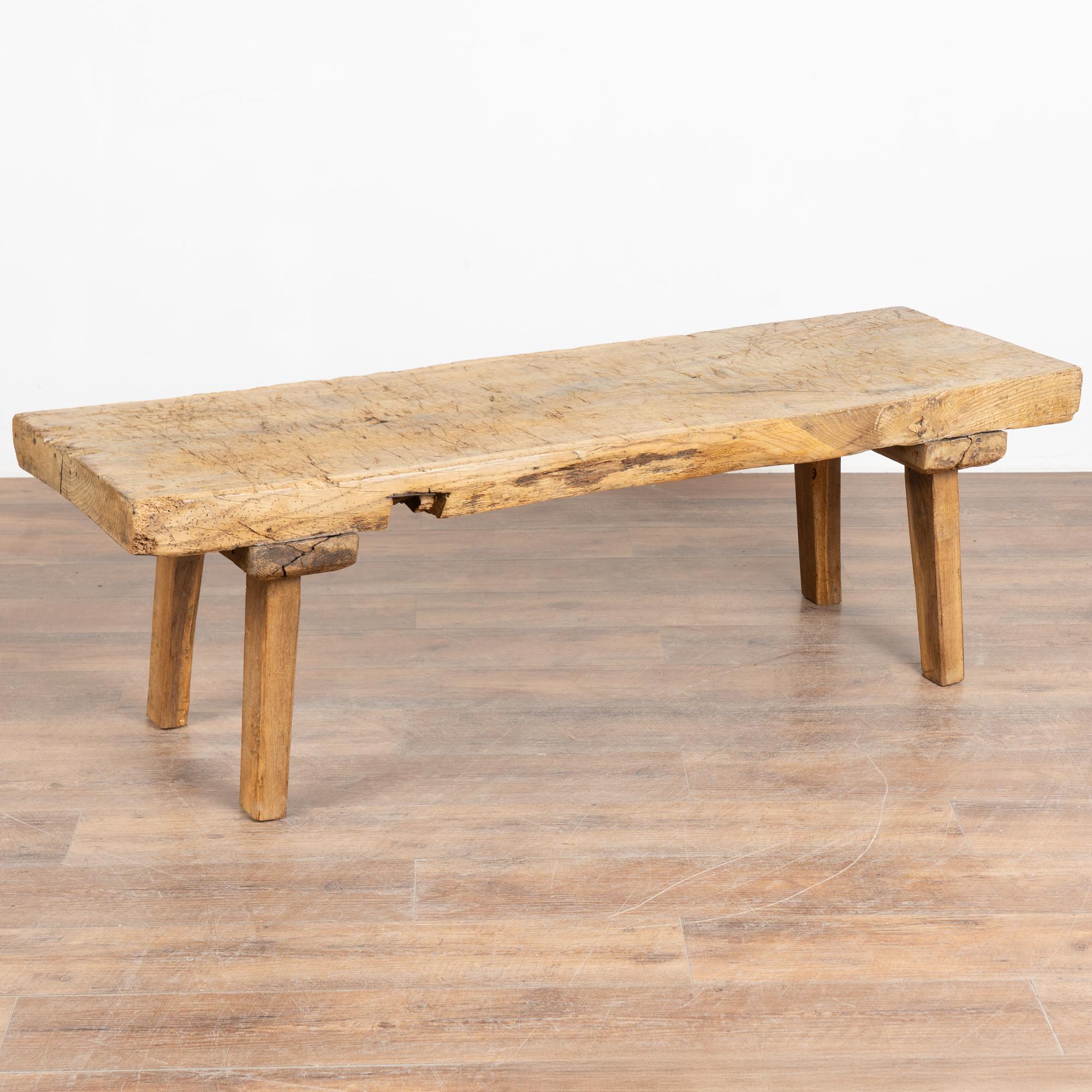 The appeal of this rustic coffee table comes from the thick wood of the top that originally served as a worktable, all resting firmly on square peg legs.