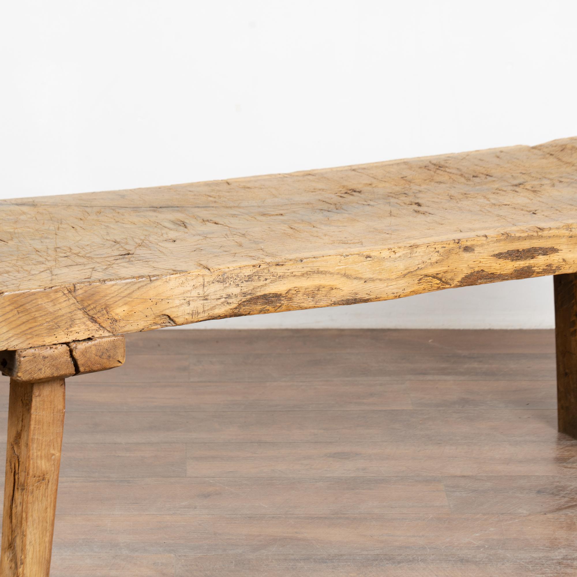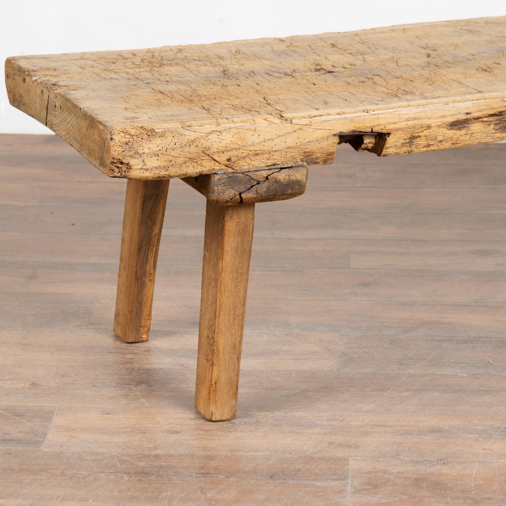 The slab of wood that serves as the top is impressive with all the gouges, stains, scrapes, cracks and even dried old wormholes that all combine to build the depth of character. Note along the edge there is a cut out section, likely where a tool was attached at an early point in its use.