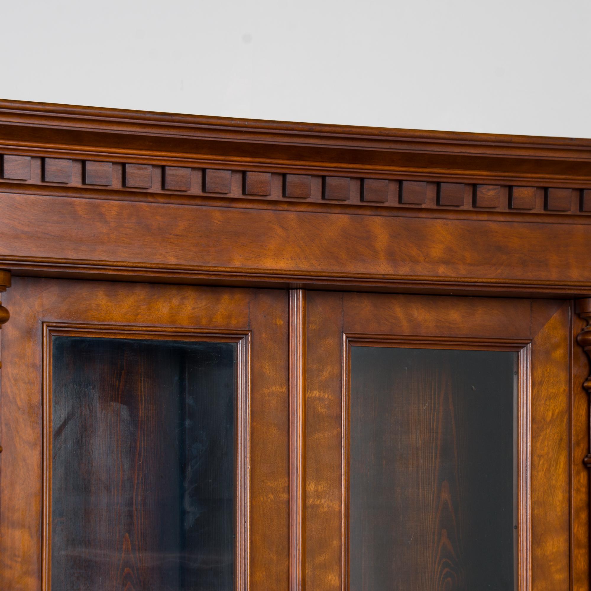 20th century Danish bookcase crafted in walnut. The upper cabinet features glass panes allowing display of books or any collection. Handsome turned columns flank the upper doors. The cabinet includes three adjustable shelves providing flexibility for display or storage. The lower cabinet doors feature burled wood veneer panels adding visual interest and contrast.