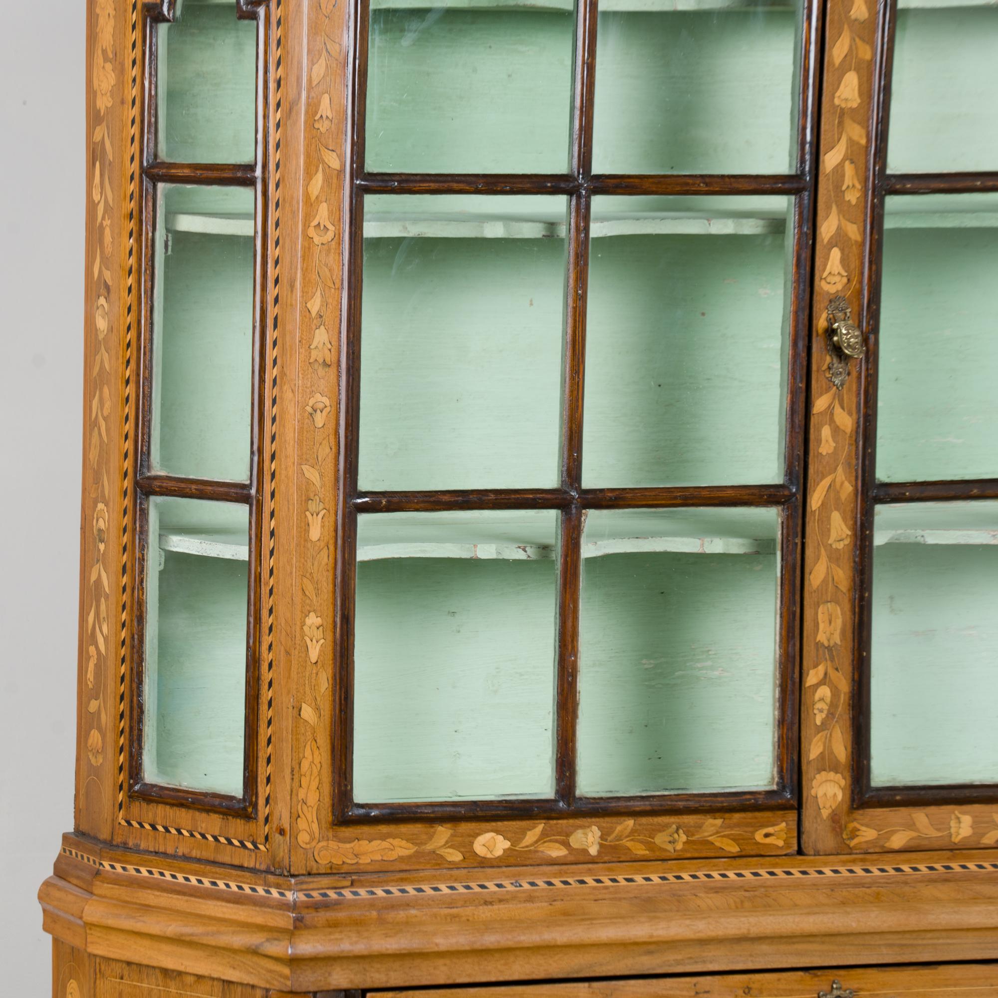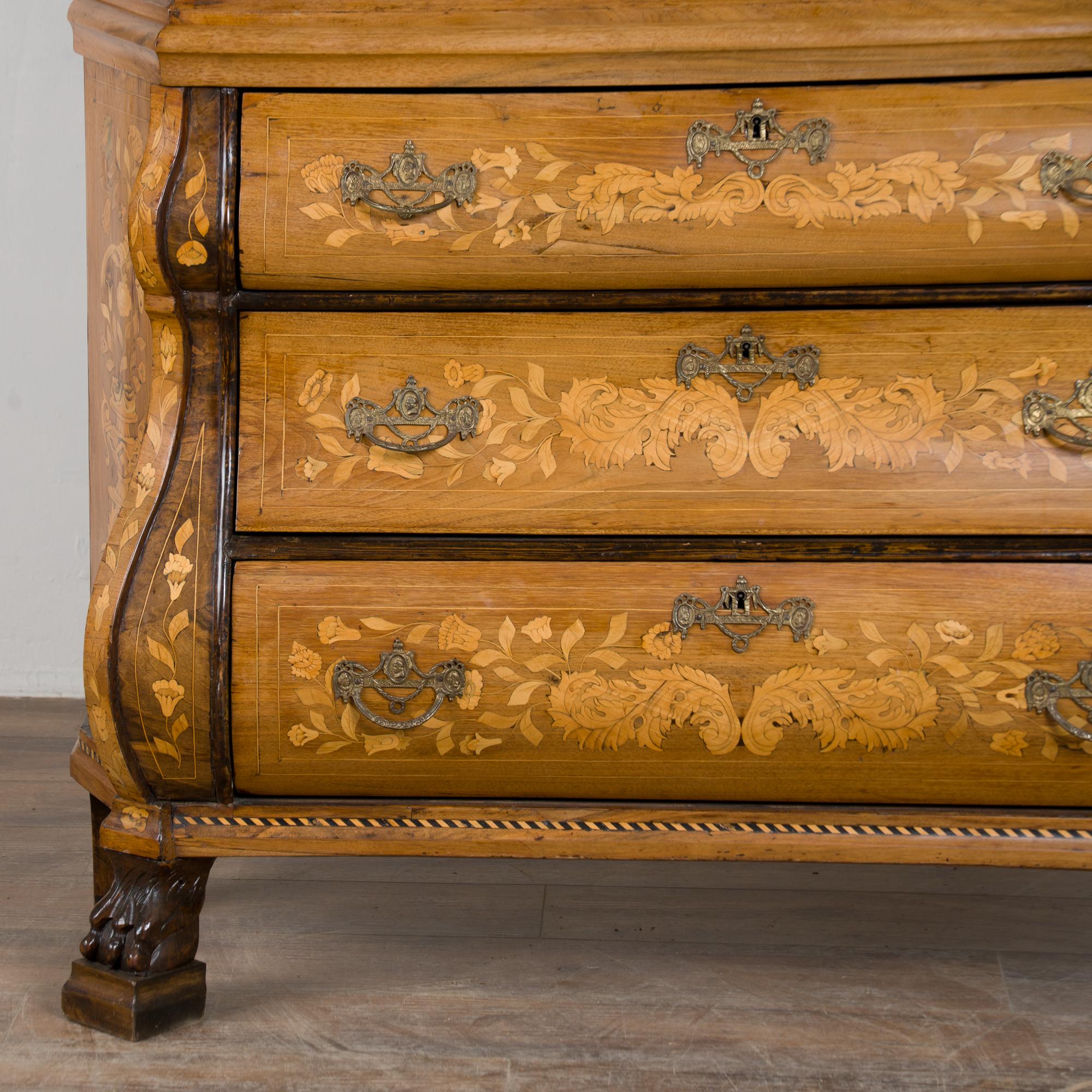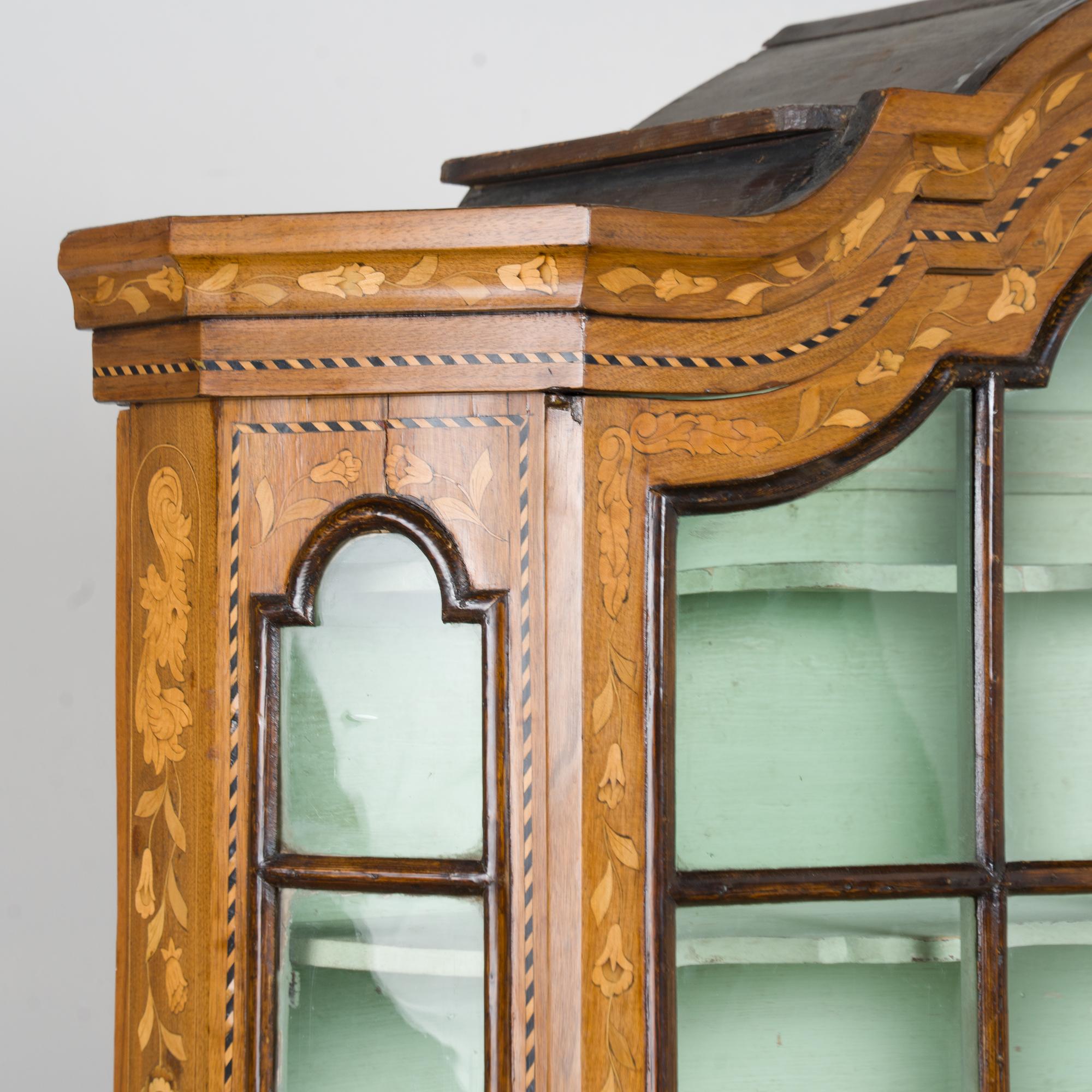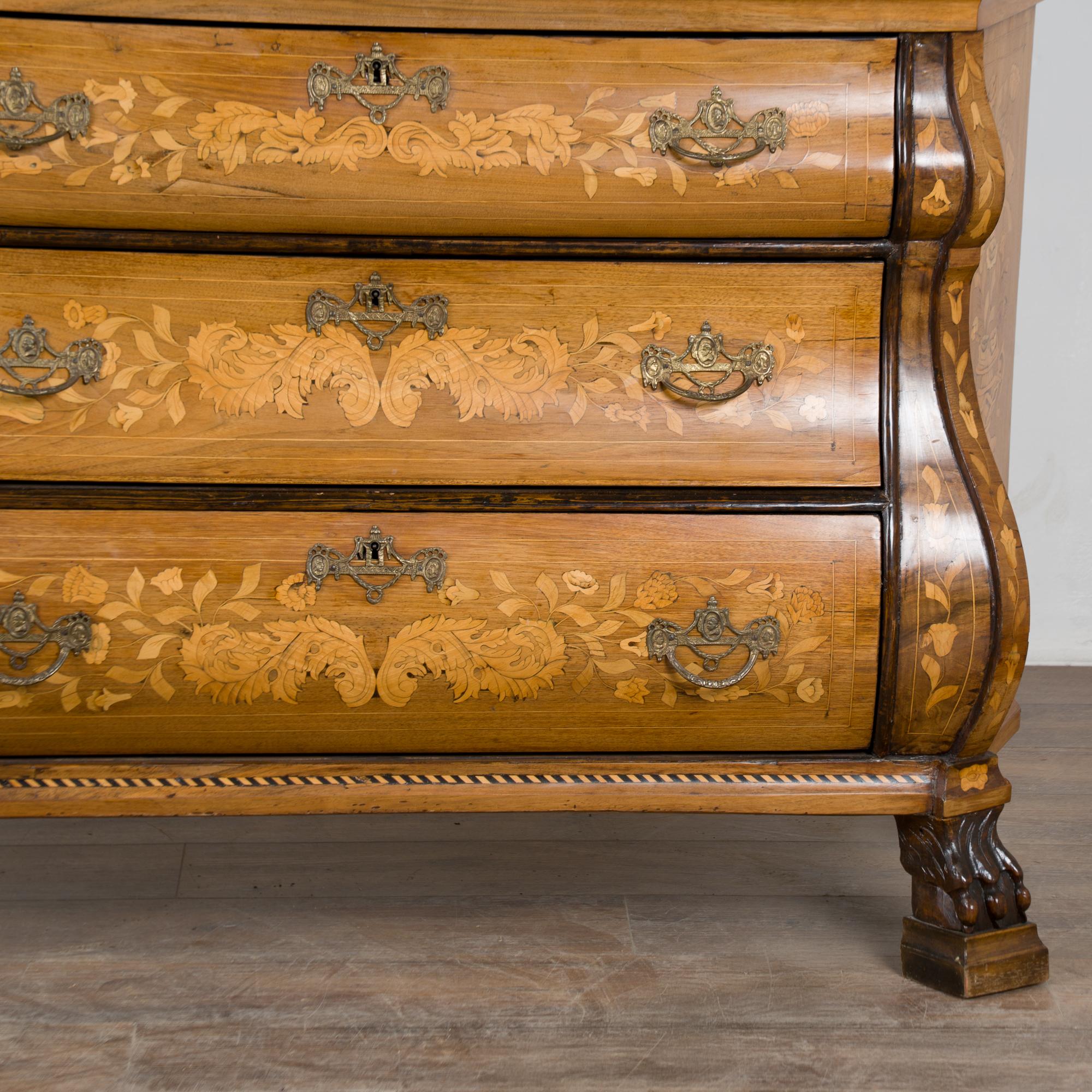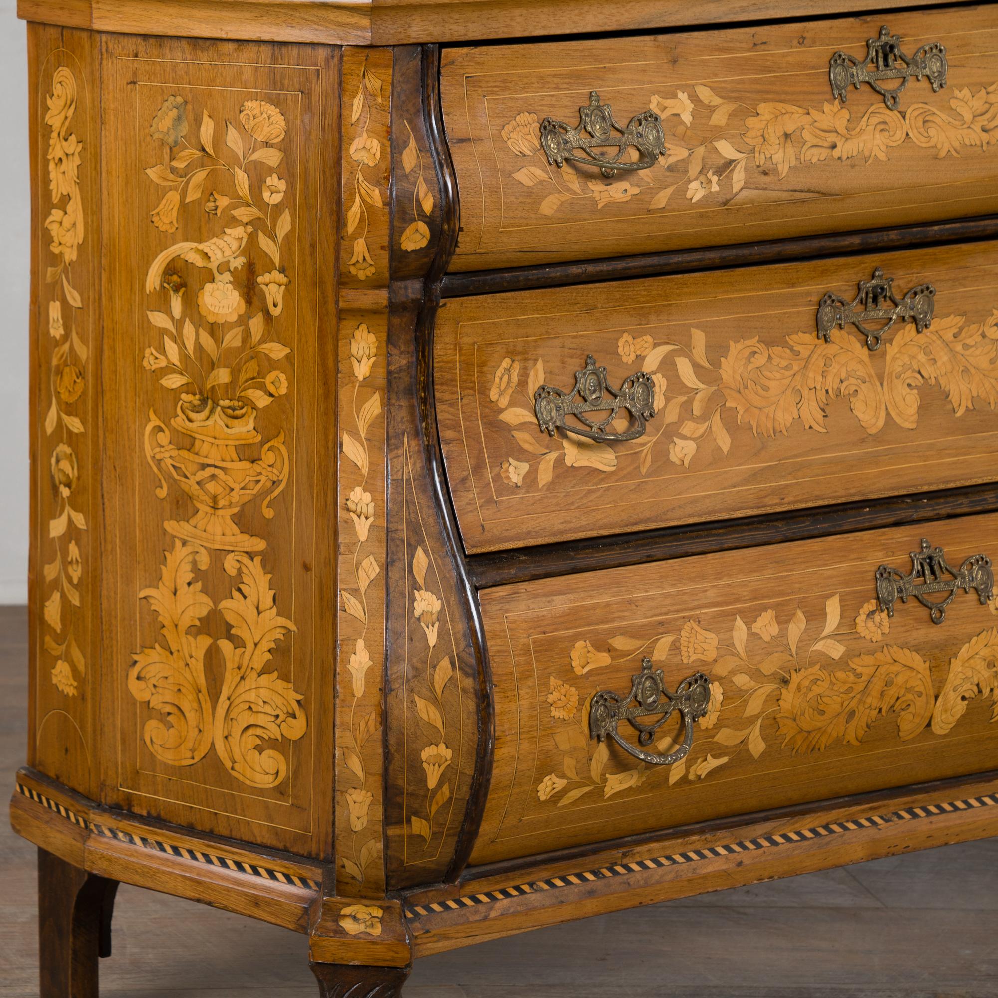 Early 19th century Dutch cabinet featuring elaborate marquetry inlay. The decoration includes flowers, vines, birds, vases, and scrolling leaves, all intricately worked across the surface.