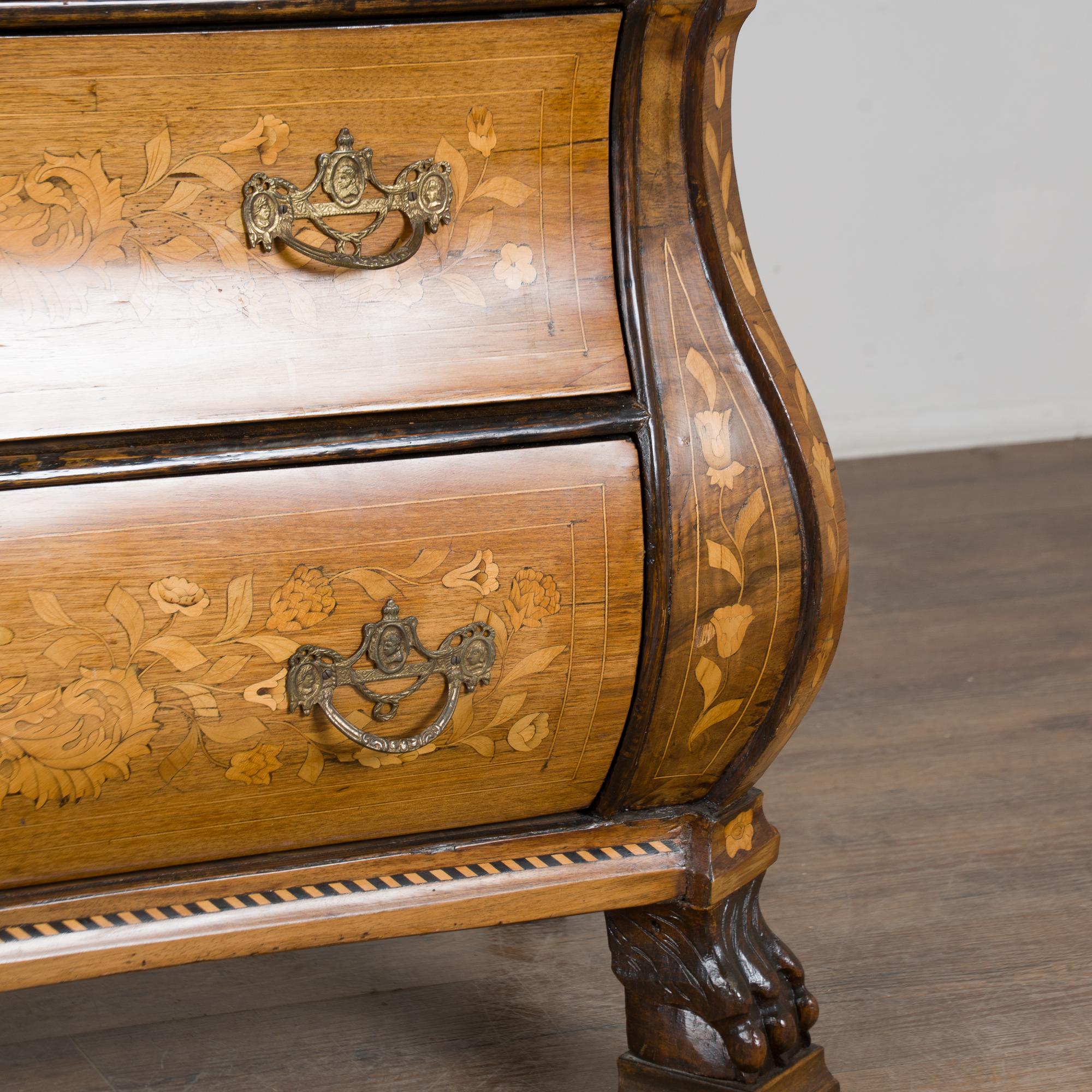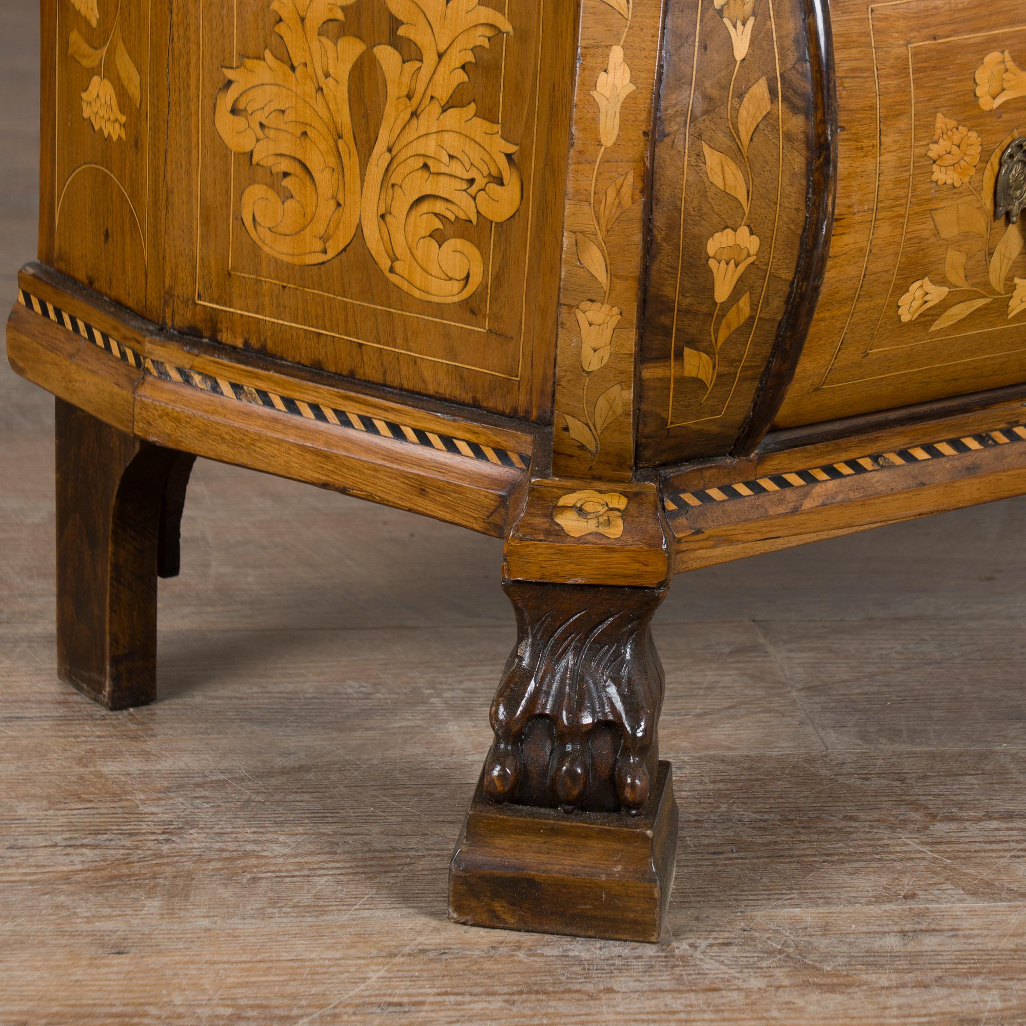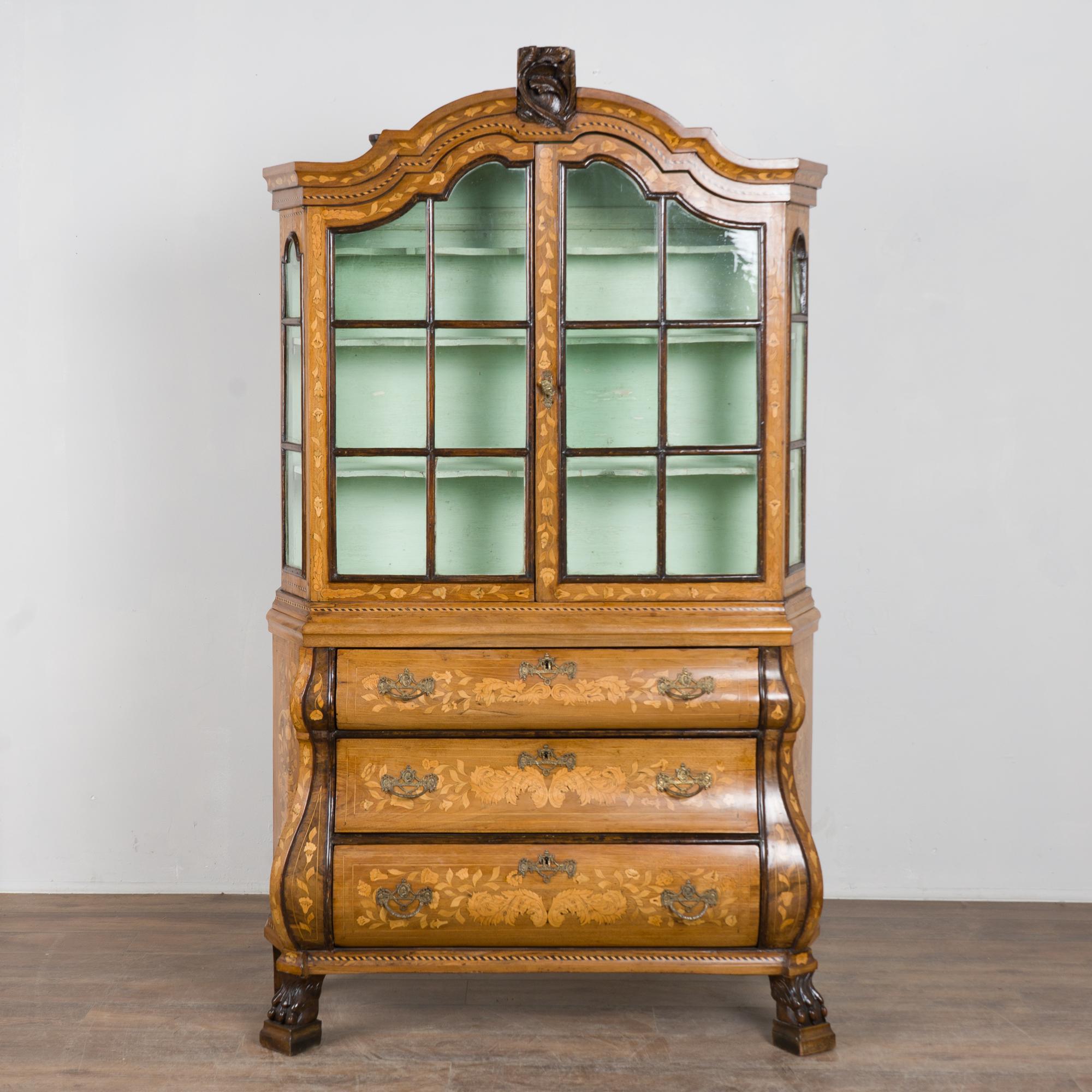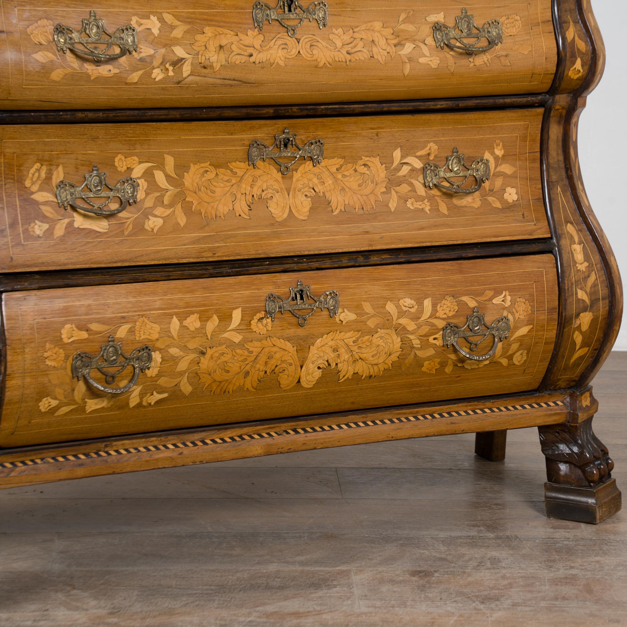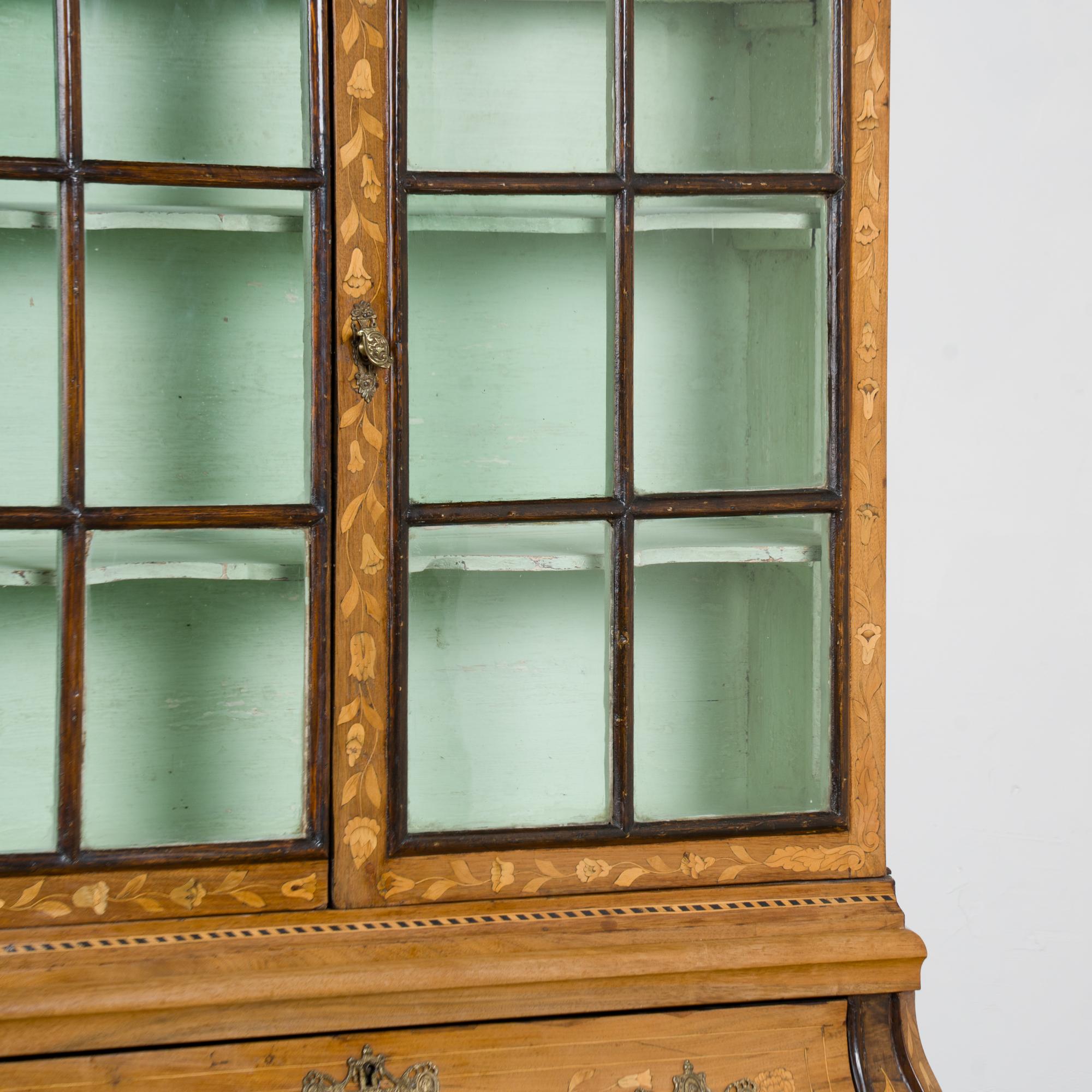 Early 19th century Dutch cabinet featuring elaborate marquetry inlay. The decoration includes flowers, vines, birds, vases, and scrolling leaves, all intricately worked across the surface.