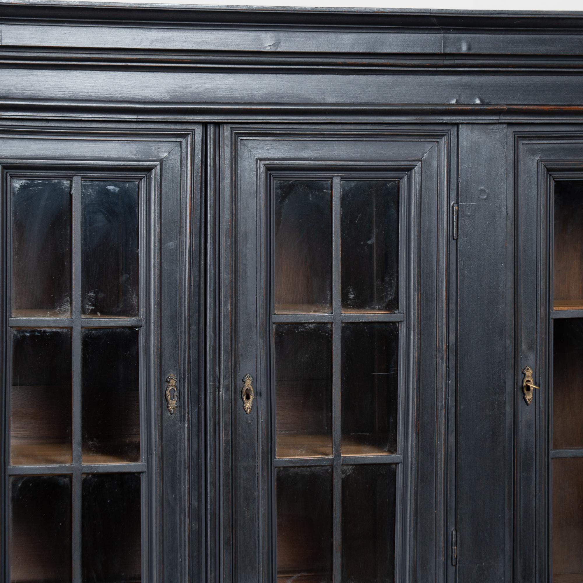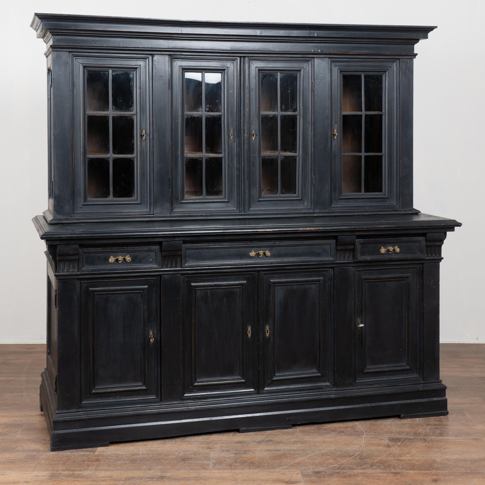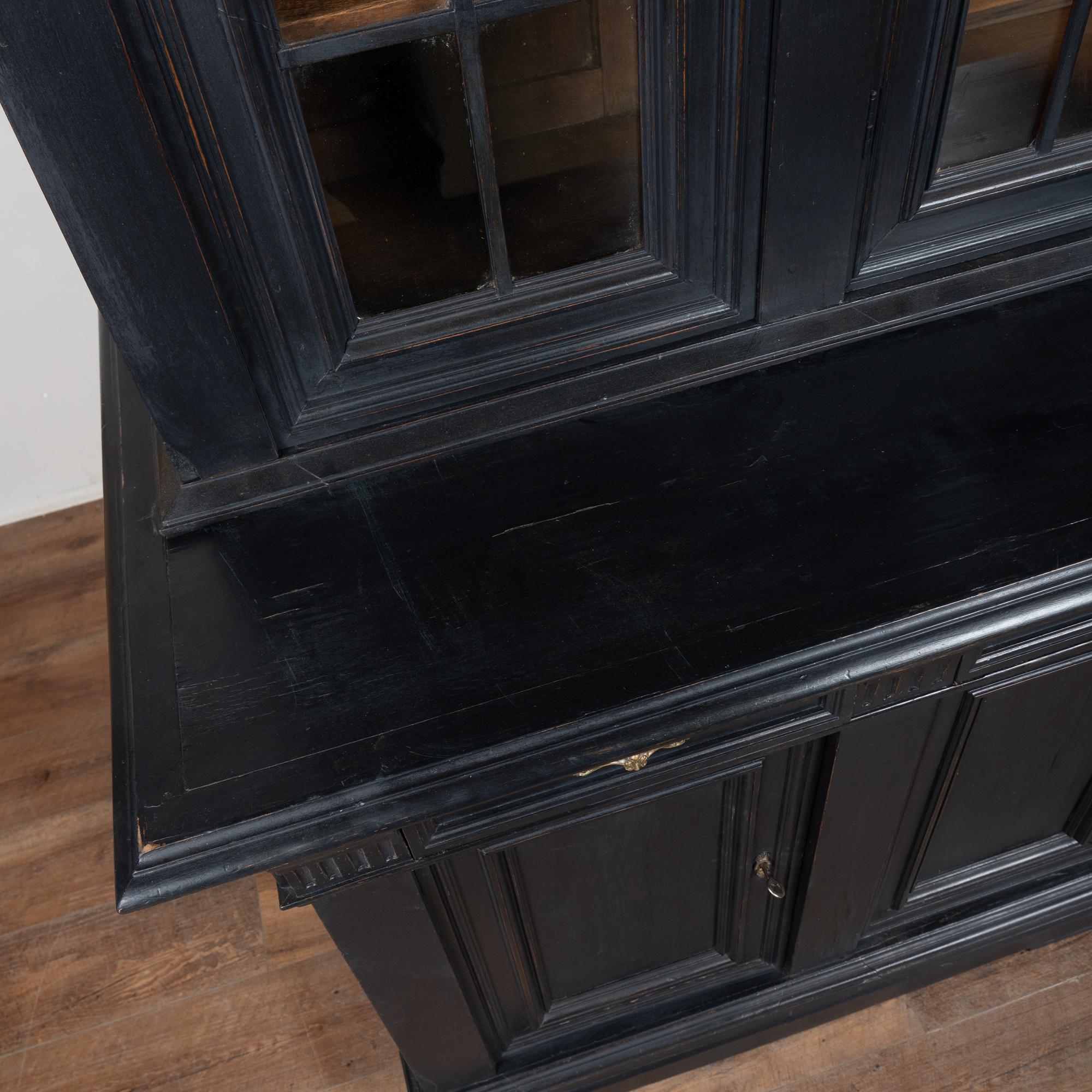 Early 20th century oak display cabinet with a newer black painted finish. Measuring approximately 6 feet wide by 6 feet tall, it features an upper cabinet set back above the base. The upper section includes four pane glass doors designed to display any collection held within.