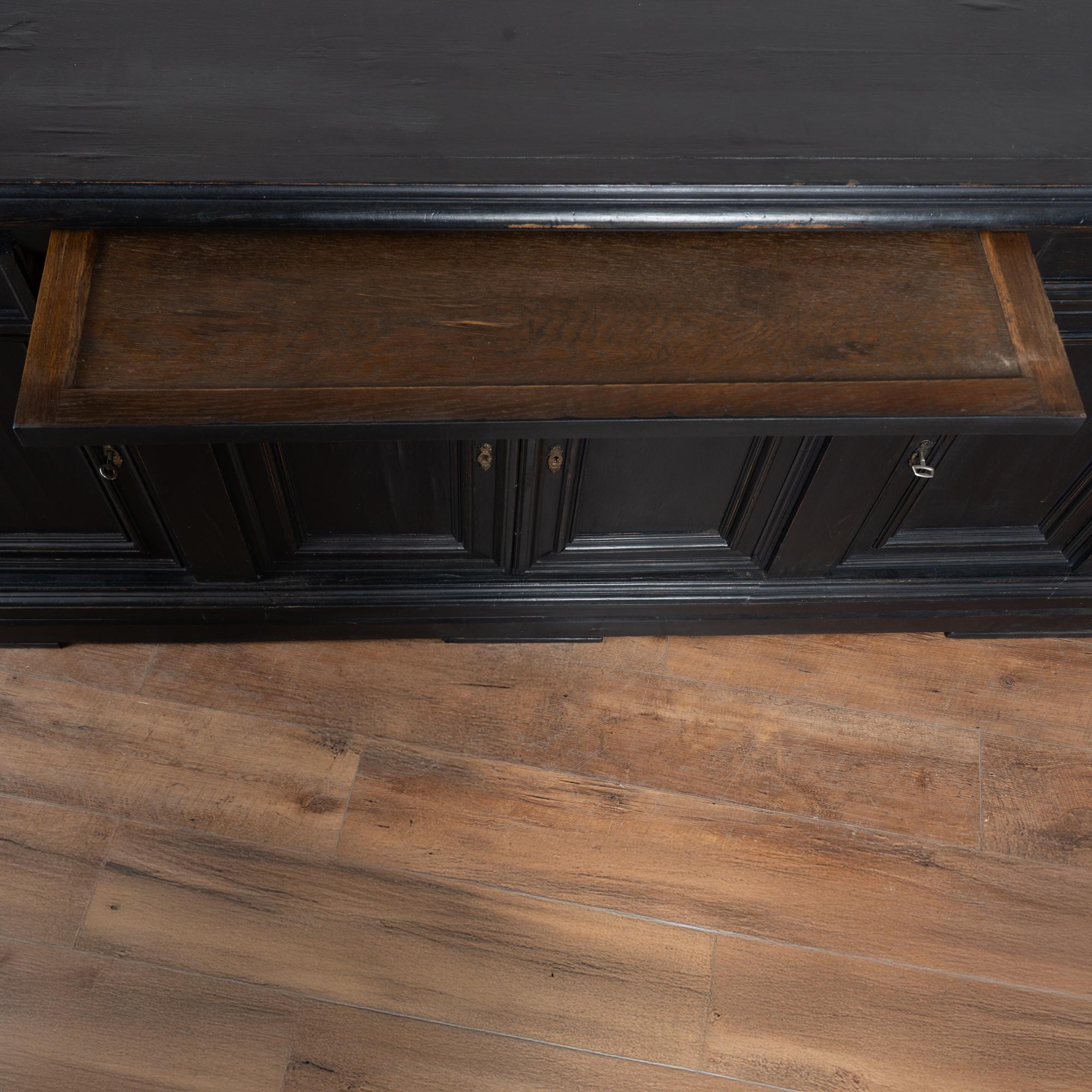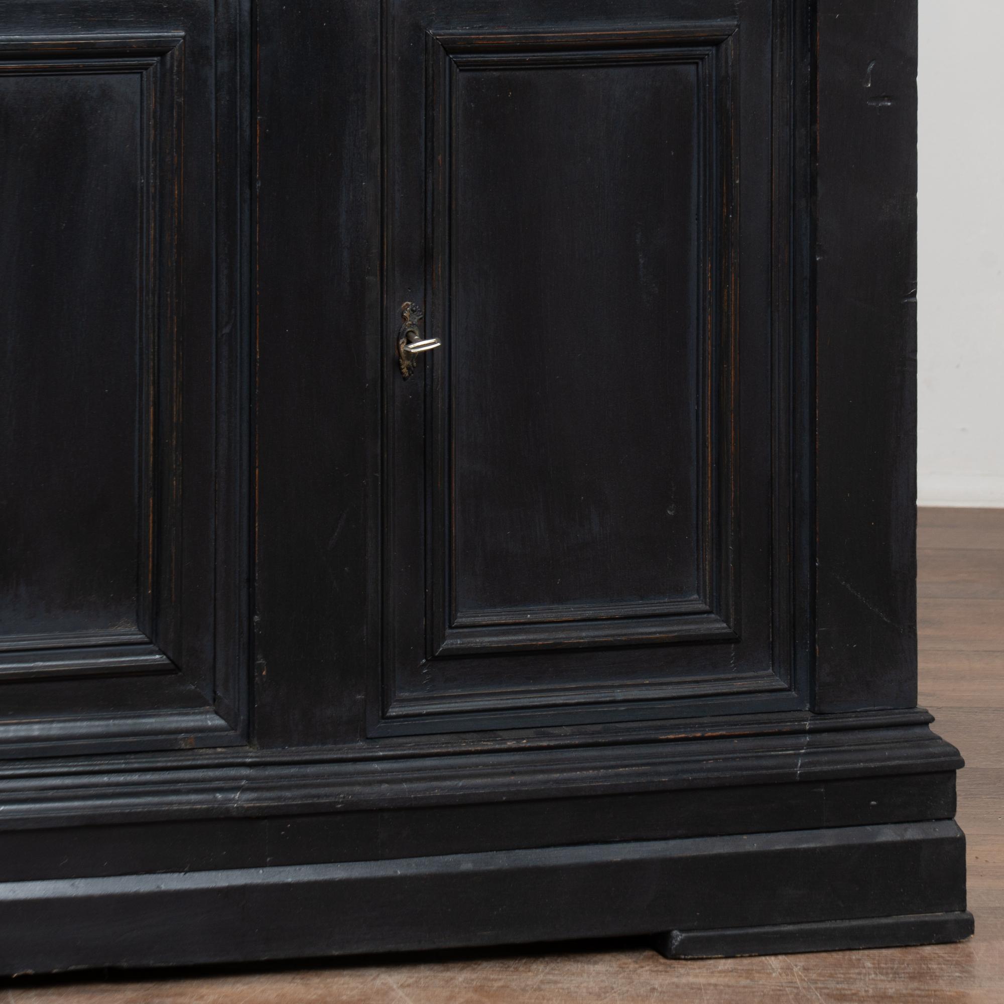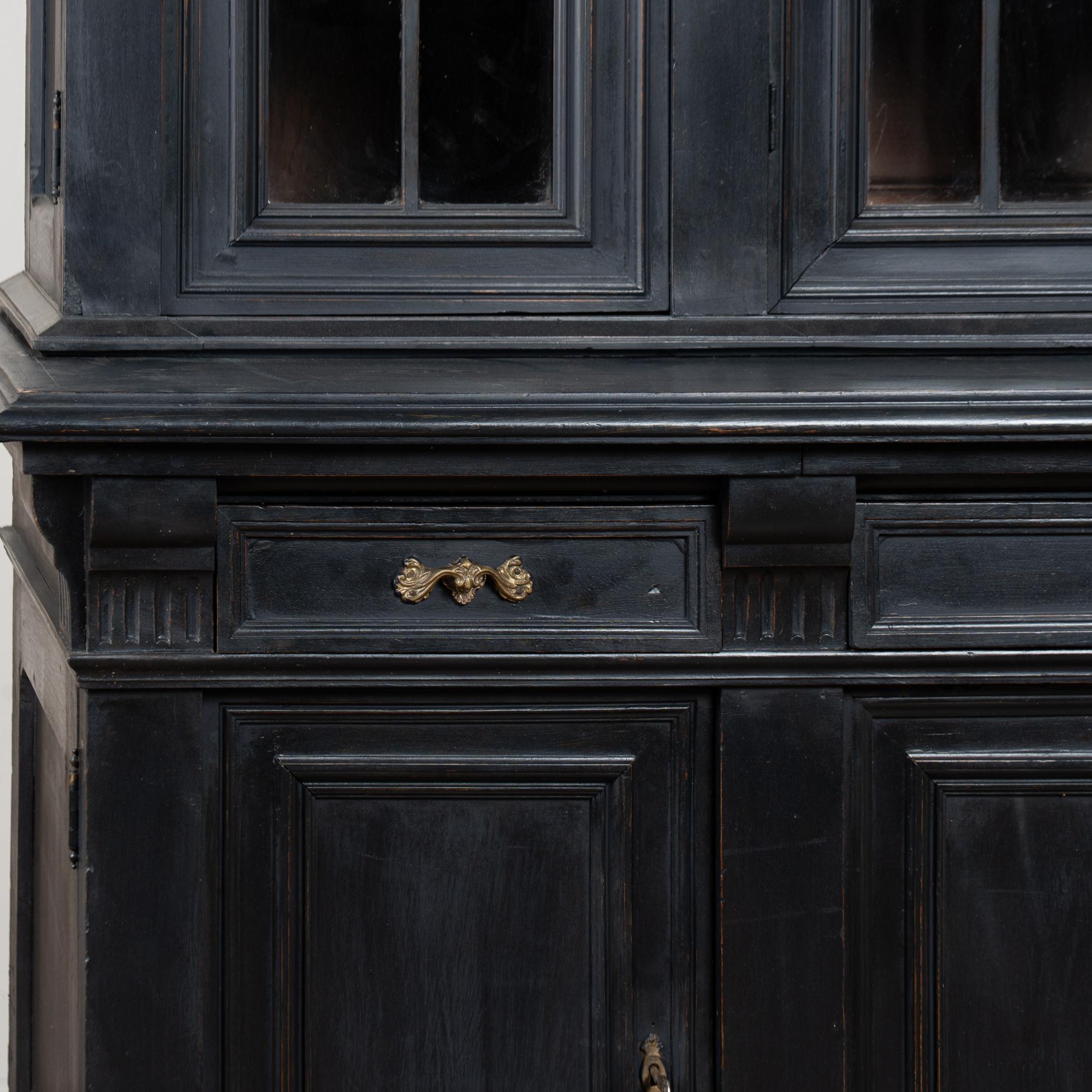 Early 20th century oak display cabinet with a newer black painted finish. Measuring approximately 6 feet wide by 6 feet tall, it features an upper cabinet set back above the base. The upper section includes four pane glass doors designed to display any collection held within.