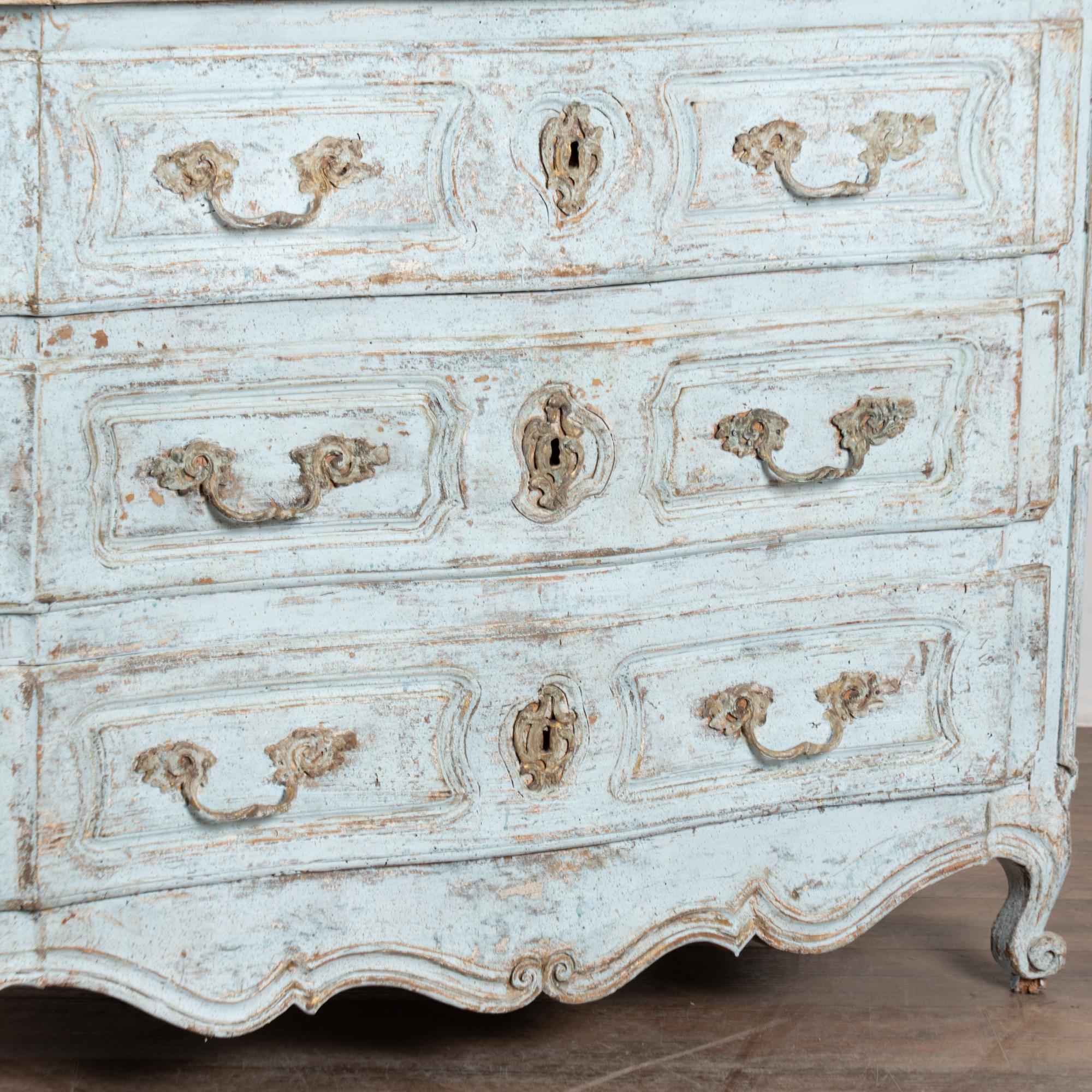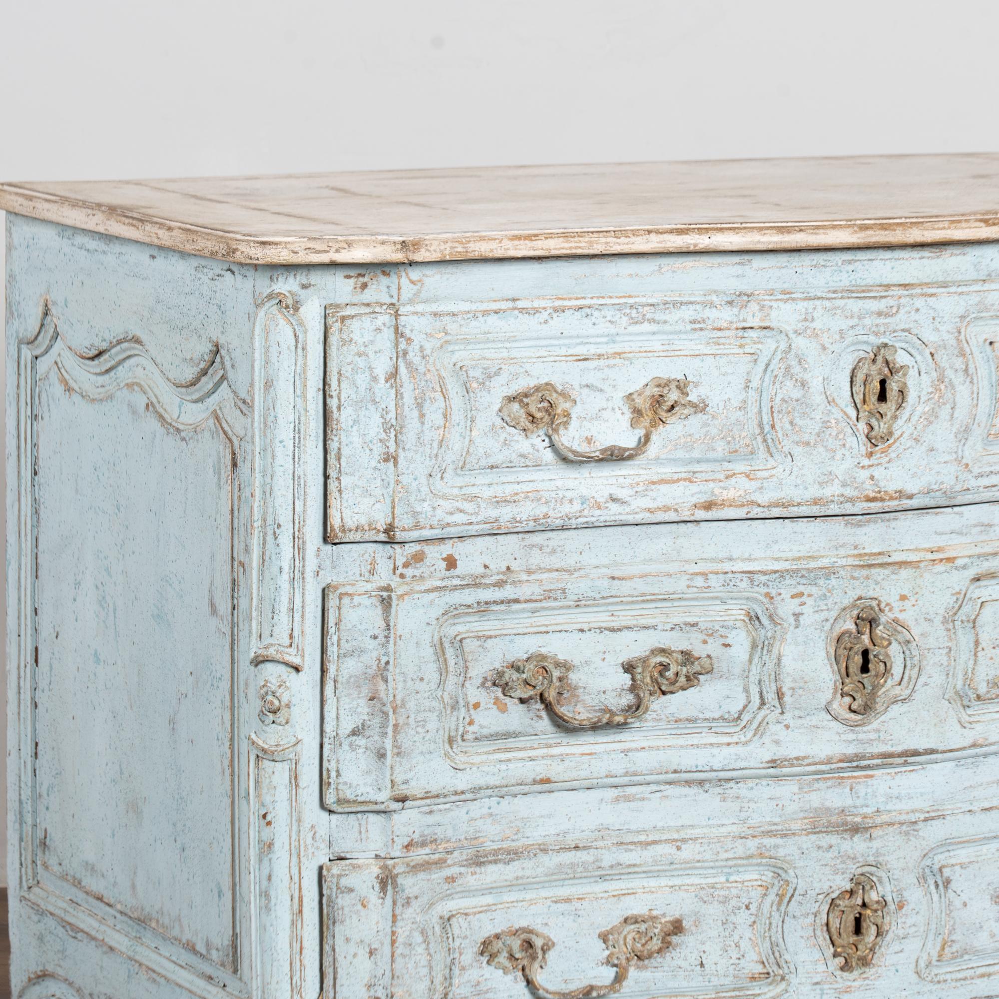 The chest features a newer professionally applied layered painted finish in pale blue with the top finished in contrasting antique white. The surface has been lightly distressed, revealing areas of the natural wood beneath and creating an aged character reflective of the period.