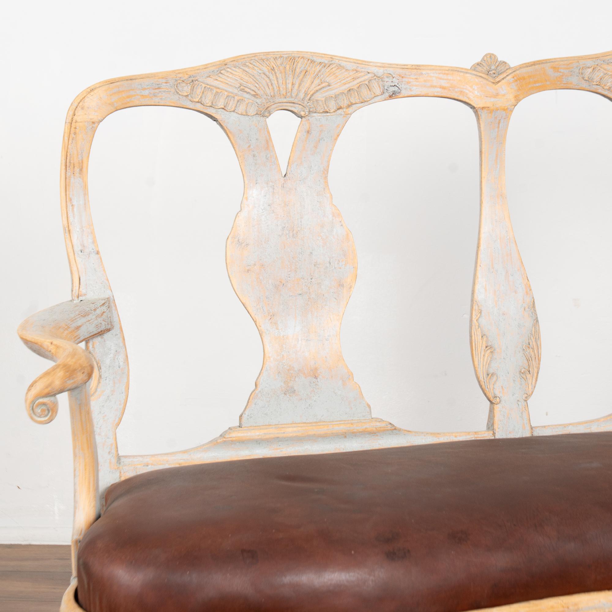 Early 19th century Swedish rococo bench settee crafted in pine. Graceful curves accent the arms, feet, and back, giving the bench an elegant and romantic profile.