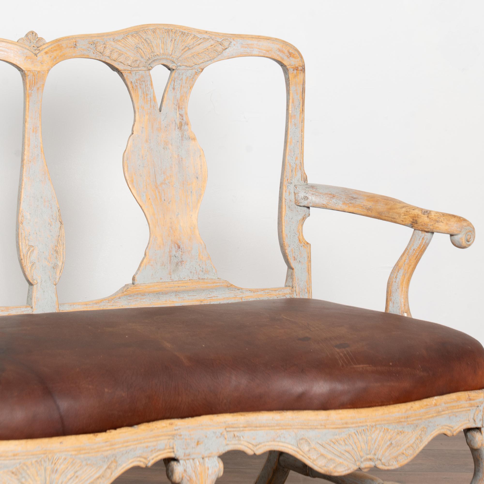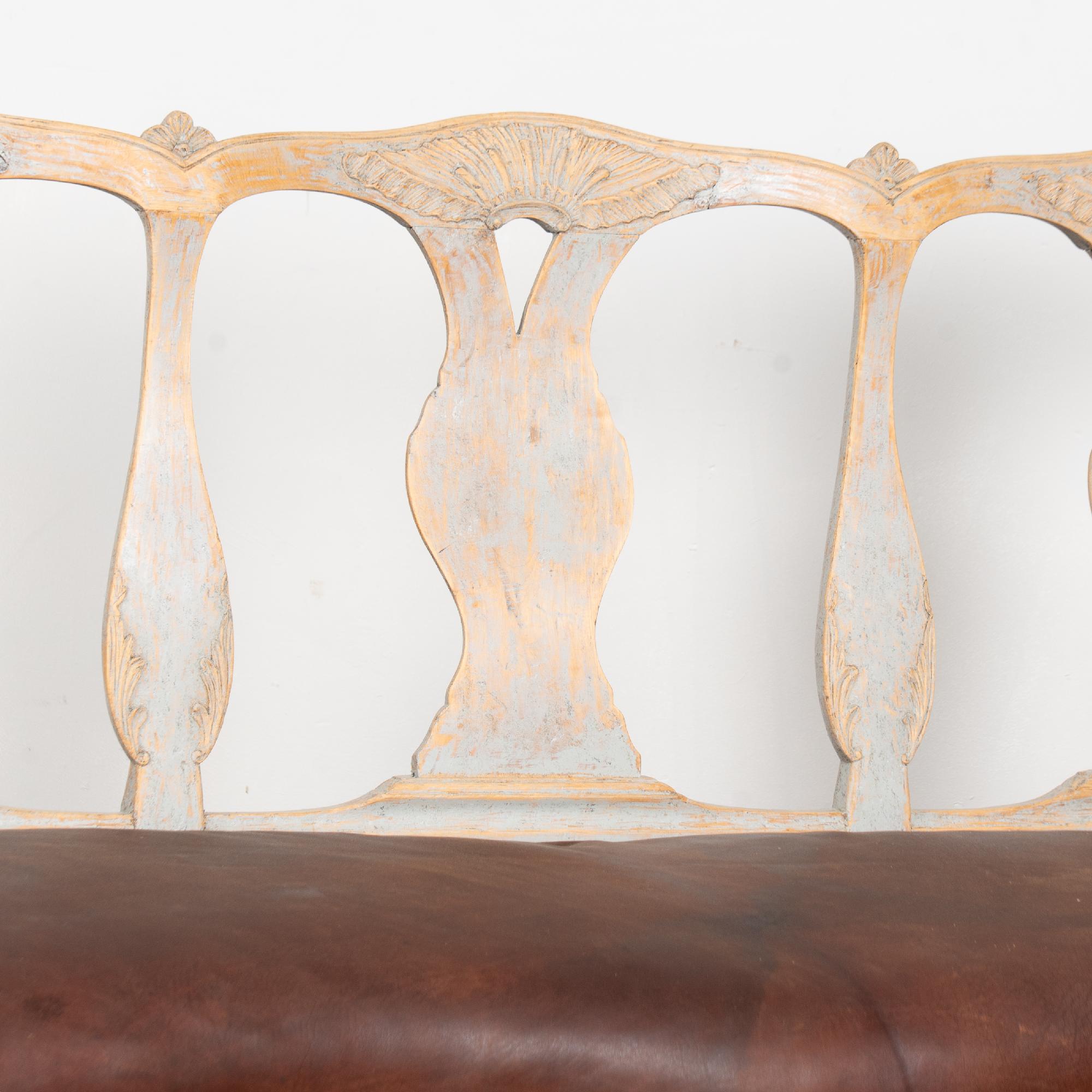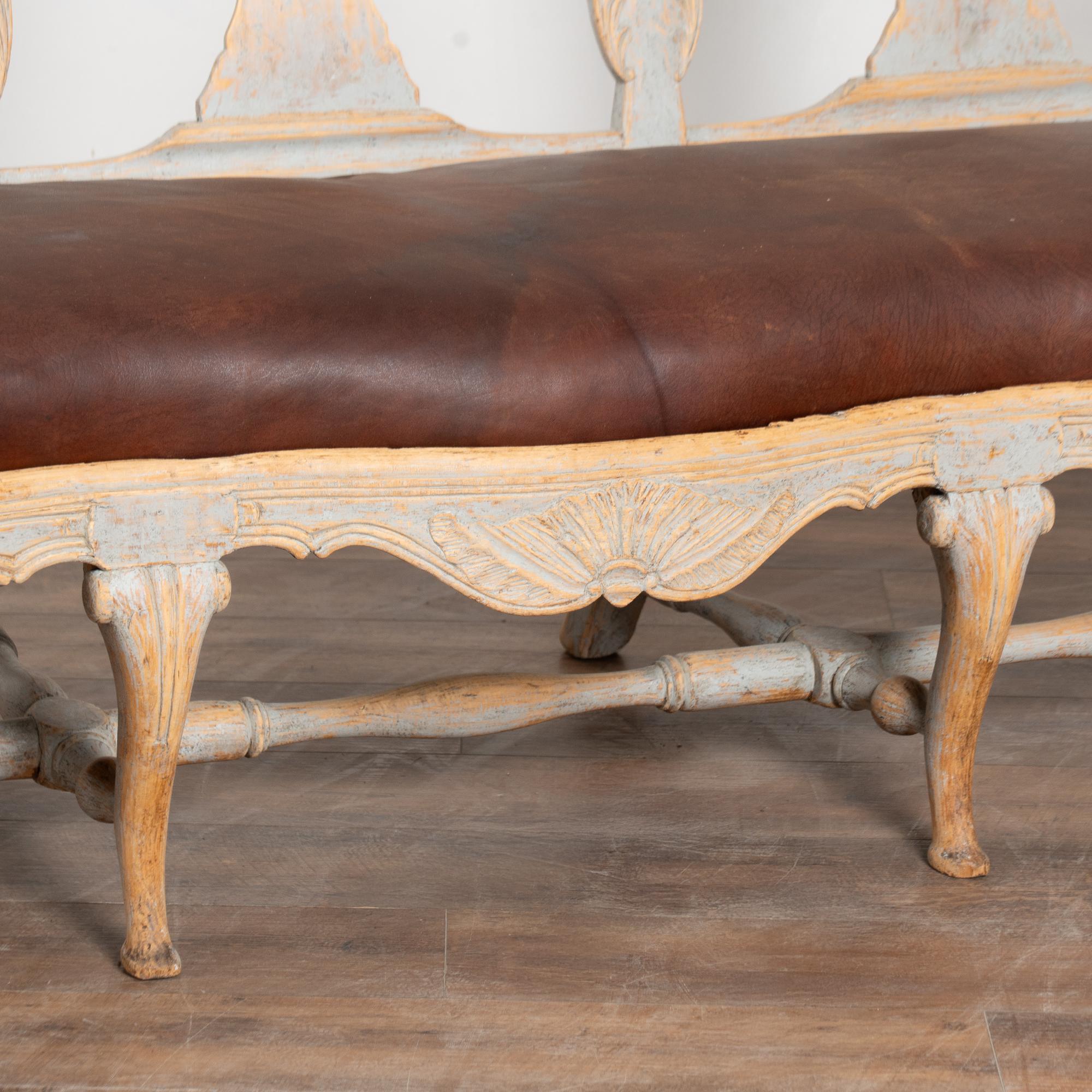 Flowing curves along the front, back, and sides contribute to the classic rococo character. The seat is upholstered in vintage rich brown leather.