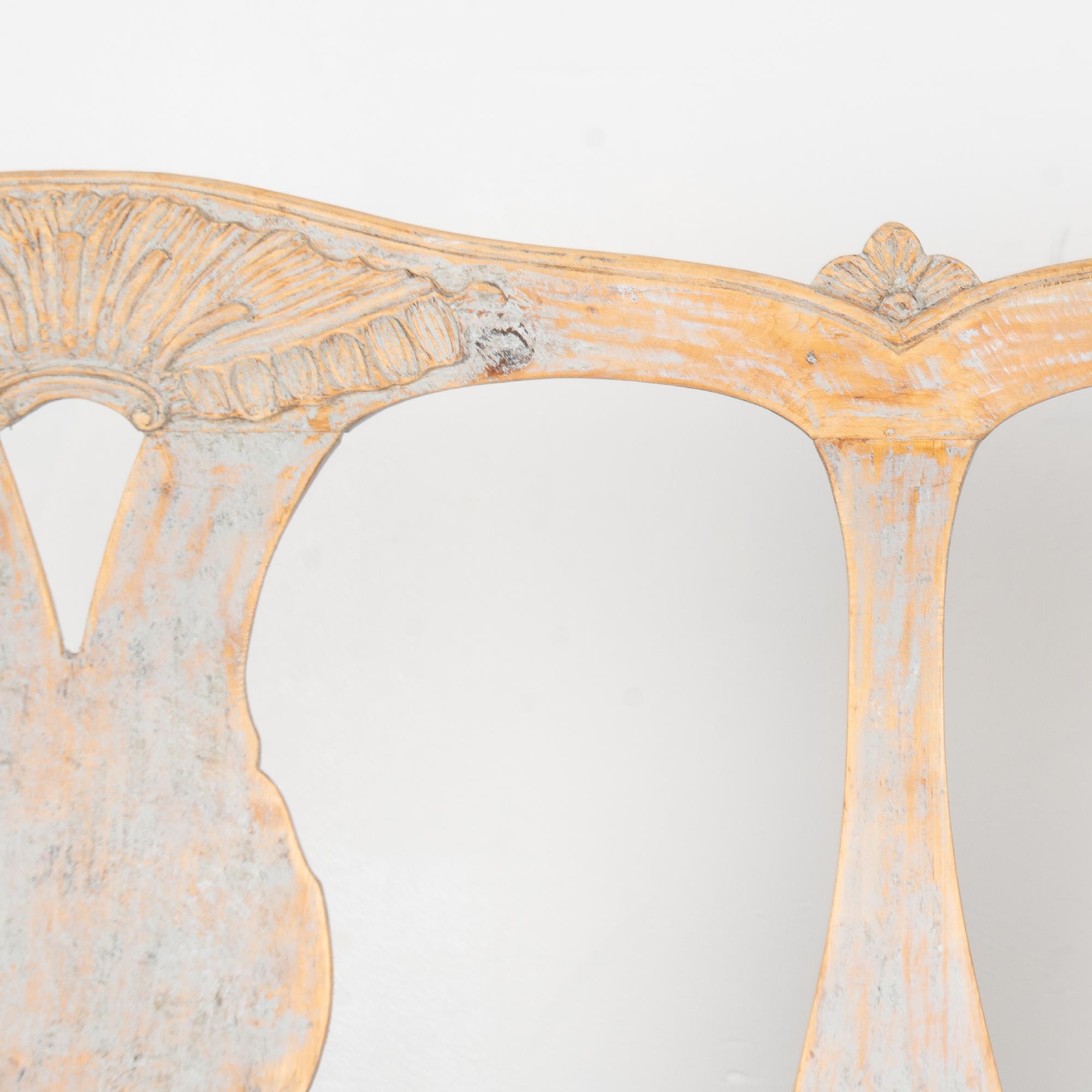 The painted finish has been scraped to reveal a warm patina, with residual tones of gray and pale blue still visible, with much of the natural pine now revealed. Hand carving decorates both the upper seat rail and the lower skirt. Typical age-related scratches, nicks, minor separation reflective of generations of use.