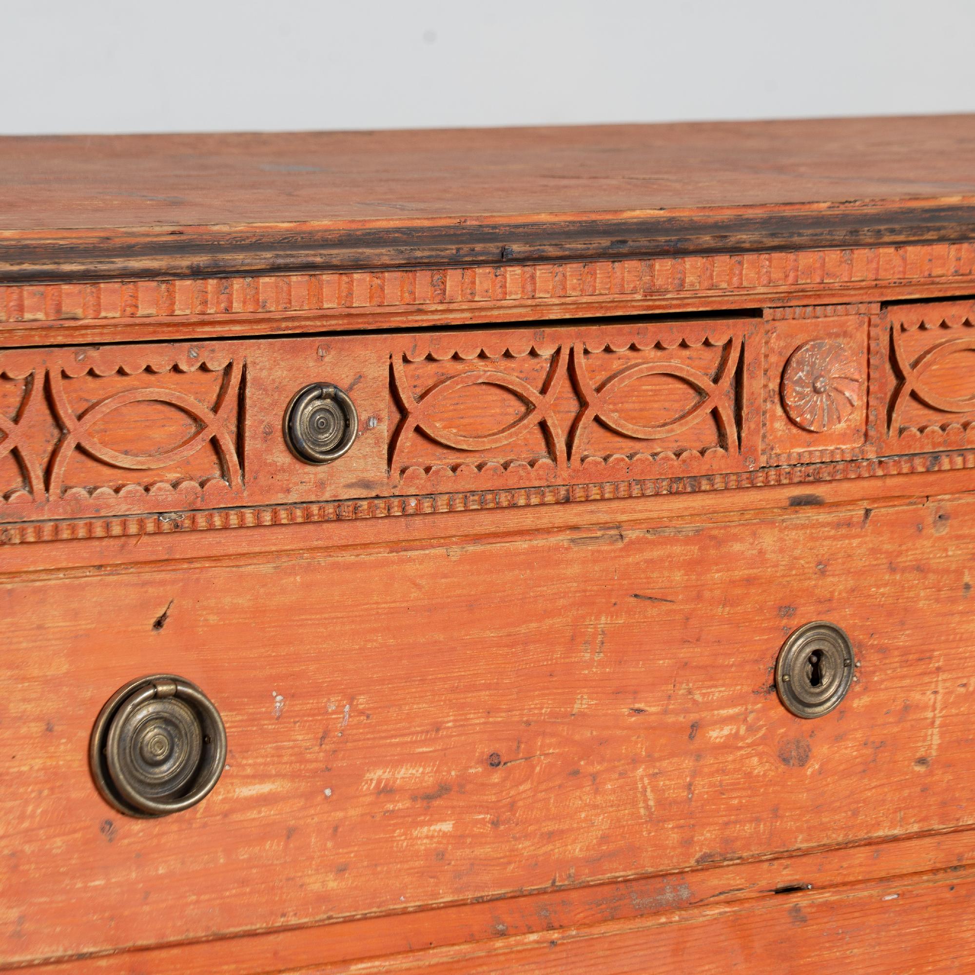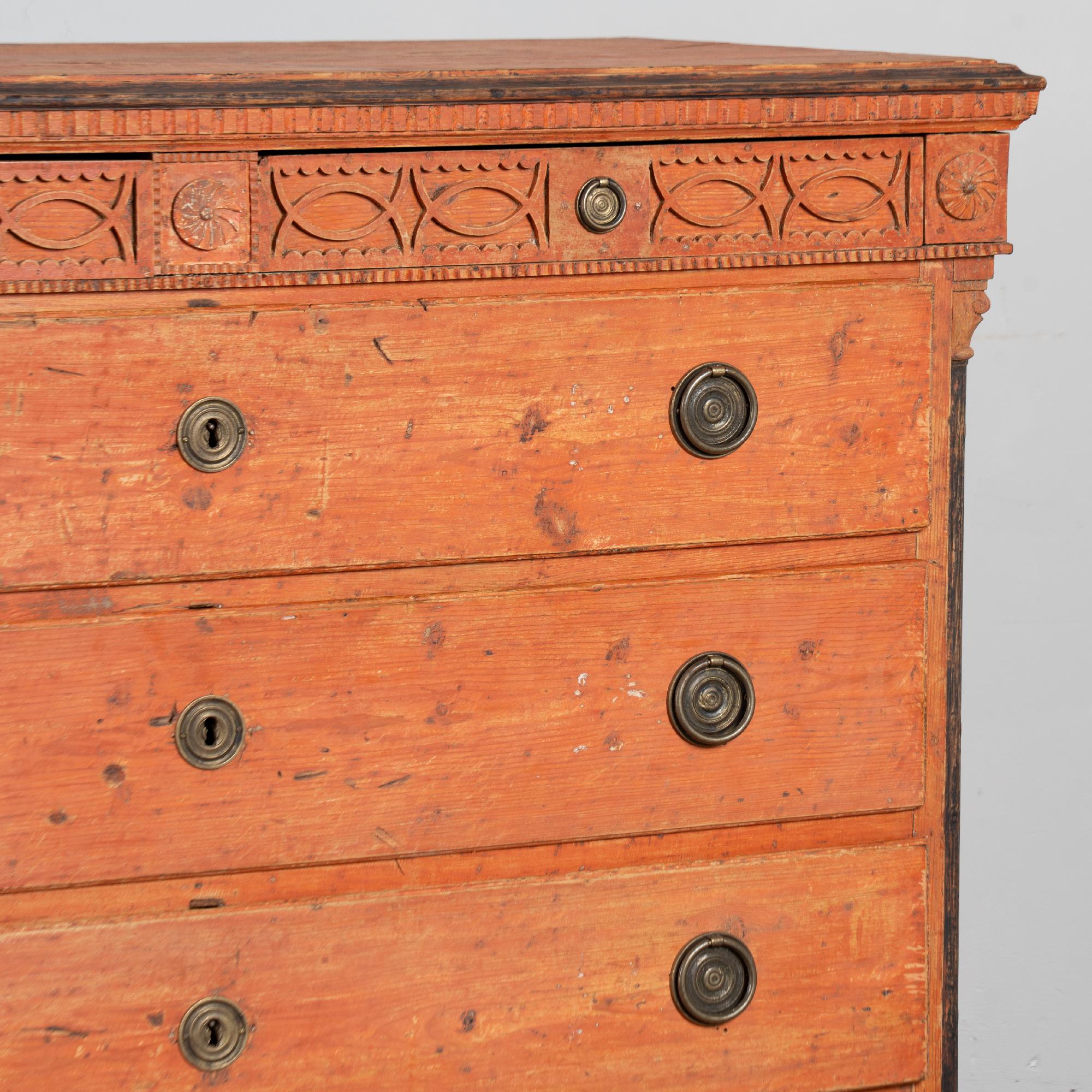 Early 19th century tall chest crafted in pine and fitted with six drawers. Decorative carving accents the top two drawers and the lower skirt, while carved dentil molding runs along the crown.