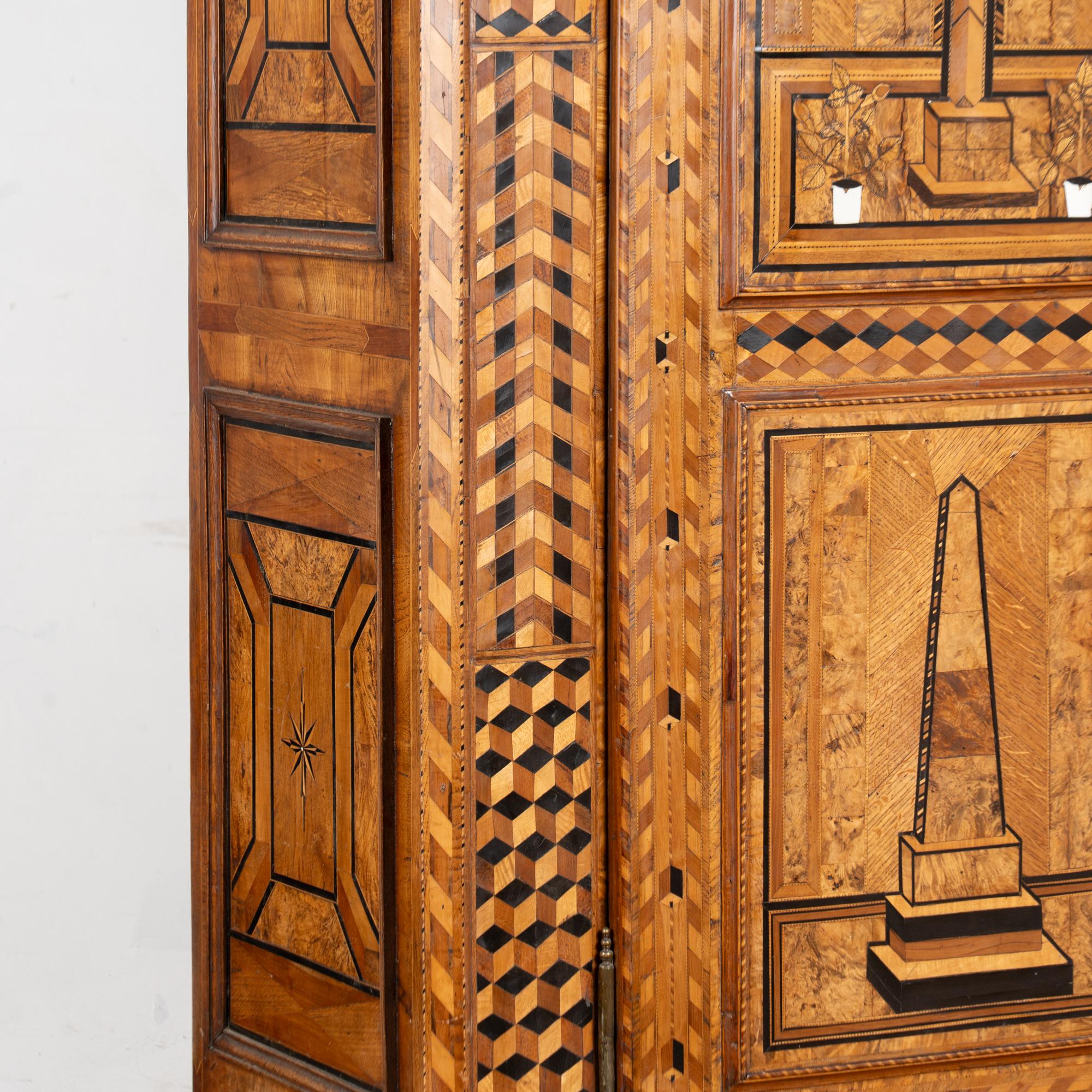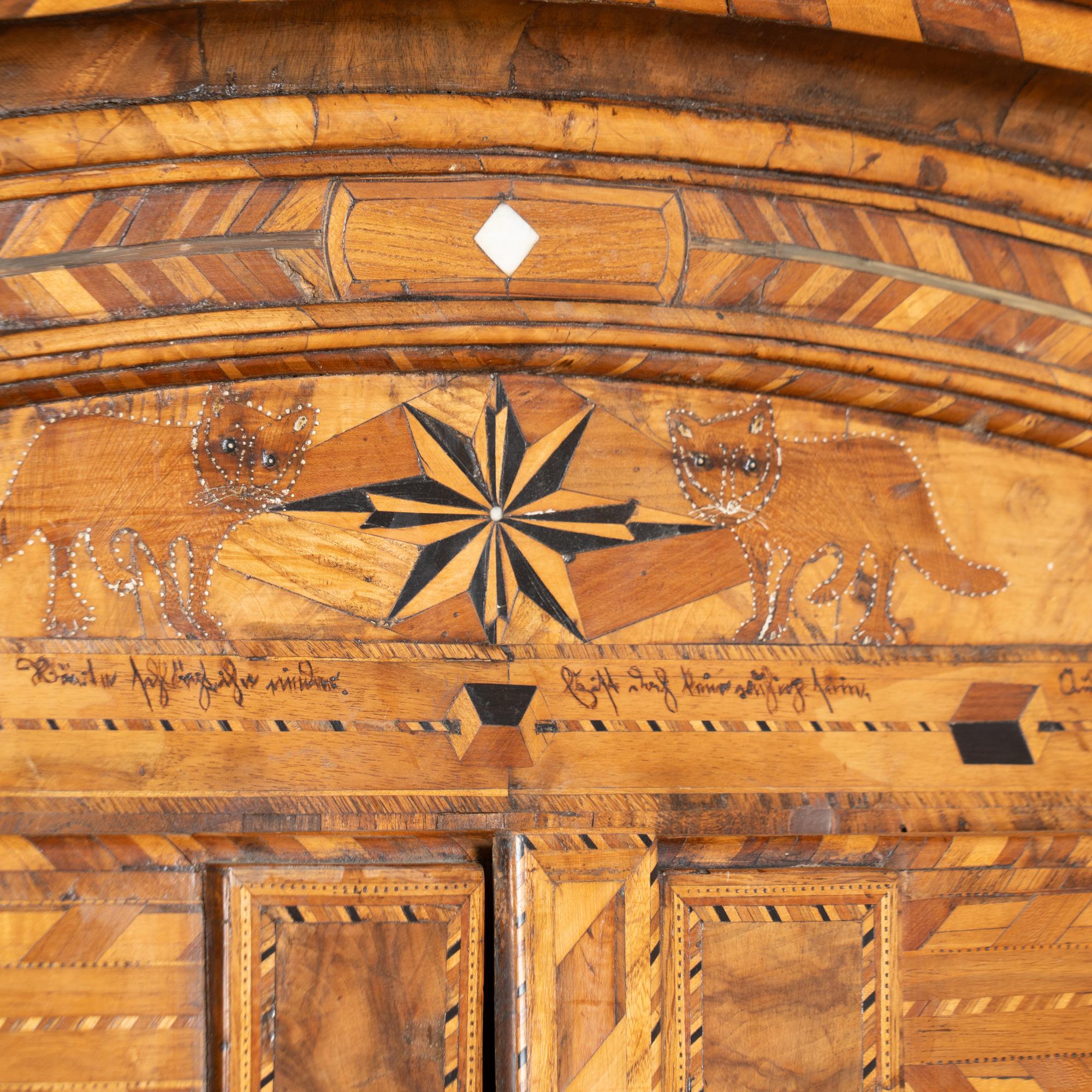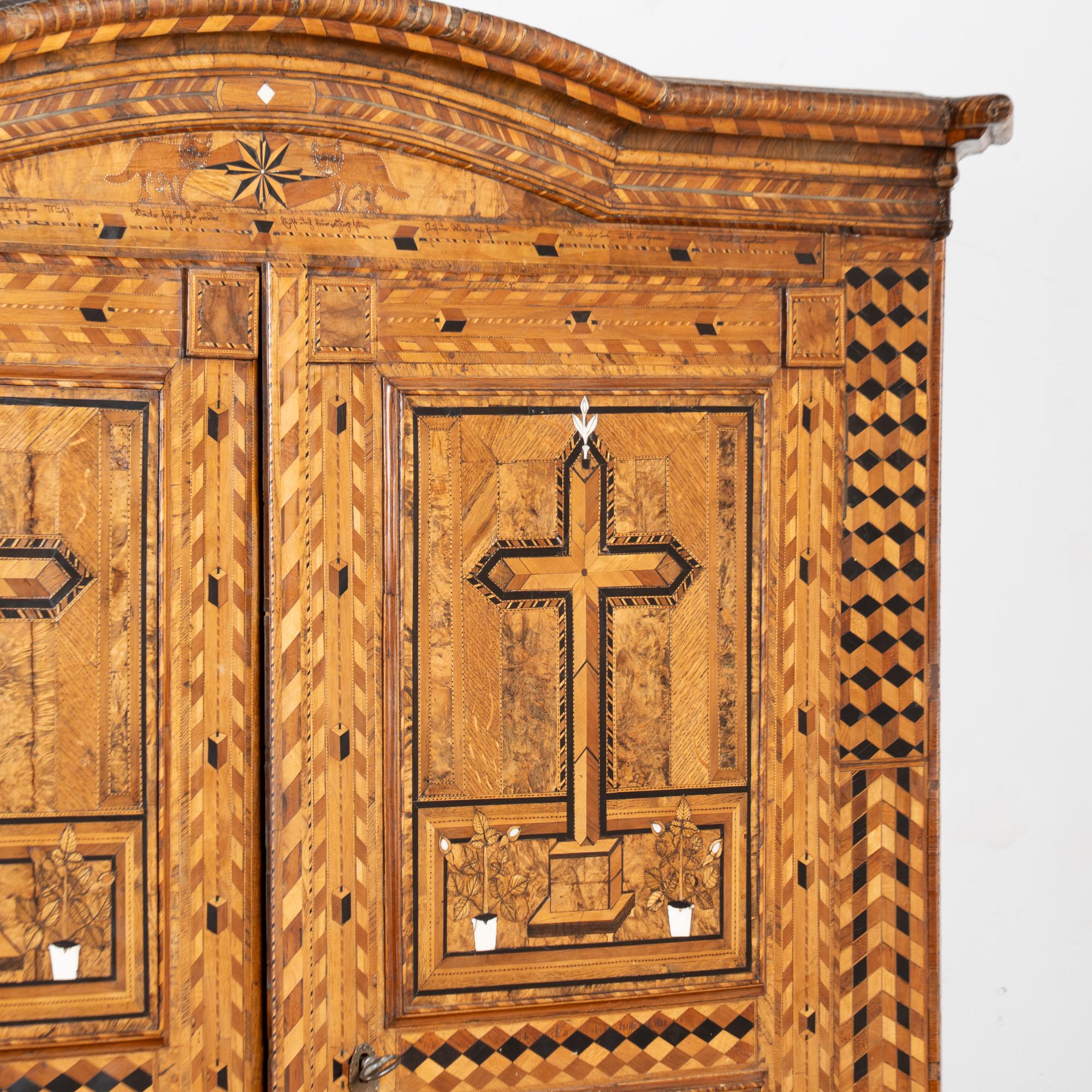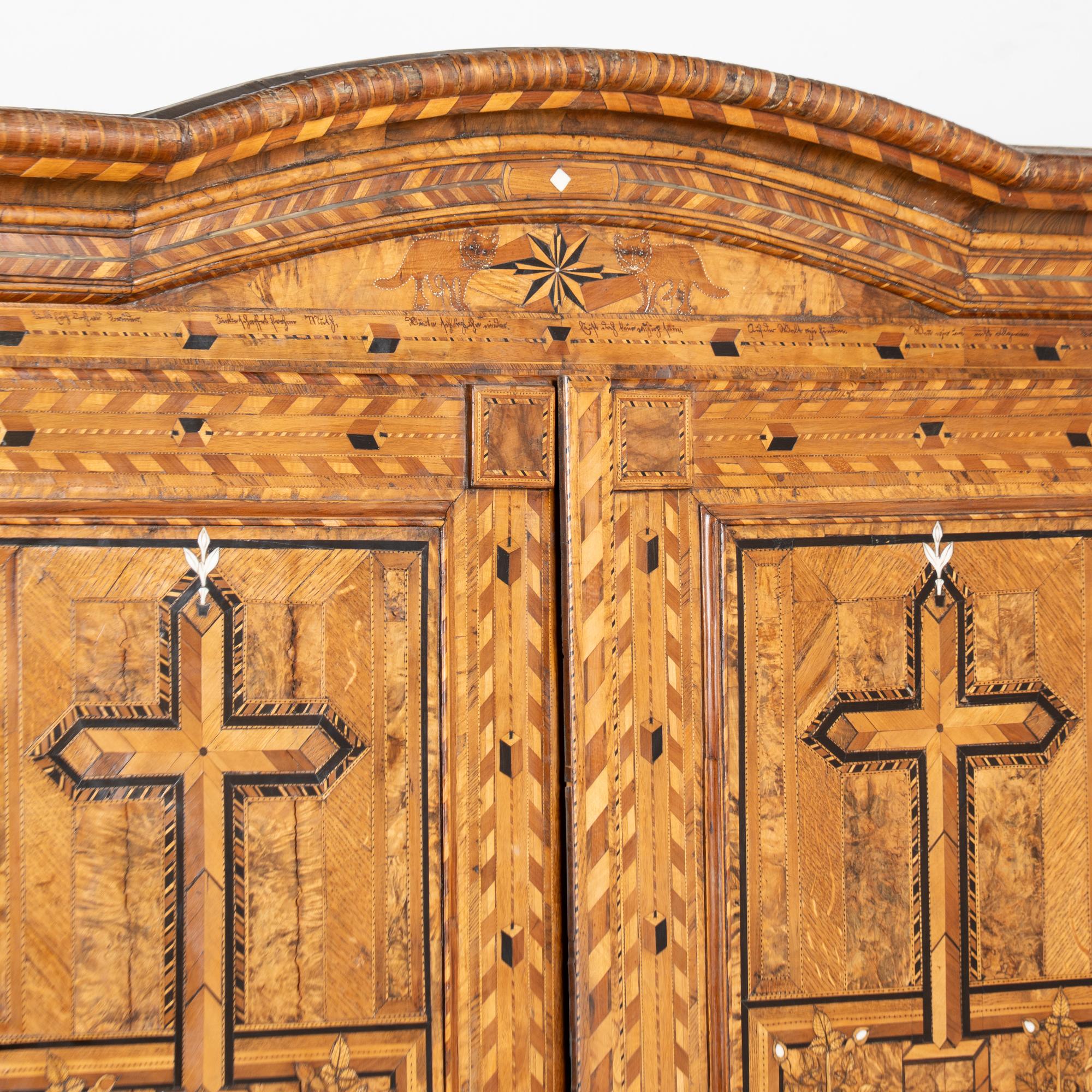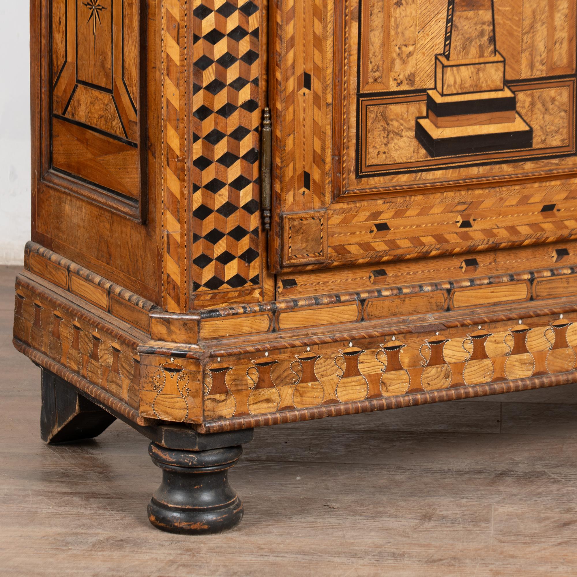 Examine all the photos to appreciate the complexity of the mesmerizing inlaid patterns, fox, cross, obelisk, delicate outlines, names and more (resting on newer feet). The prior owner indicated this armoire was acquired from a castle in Hungary.