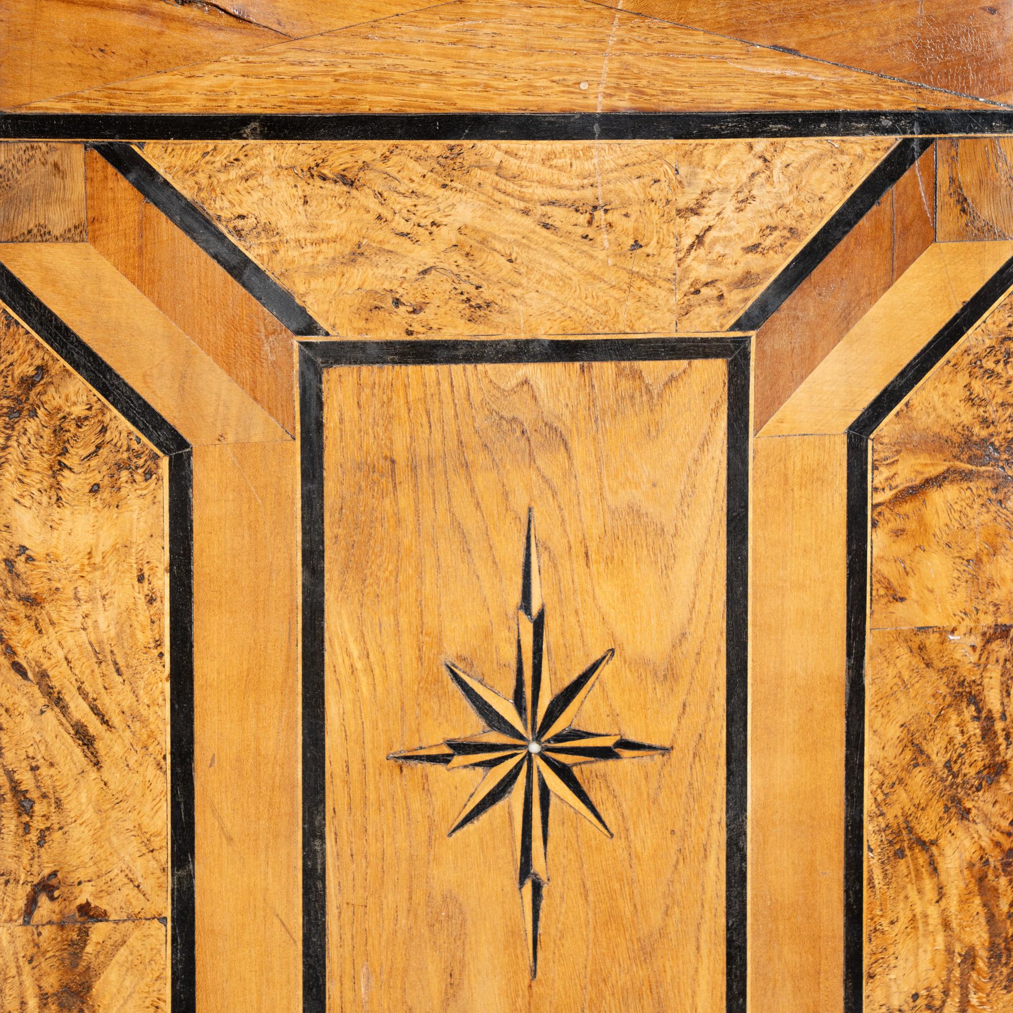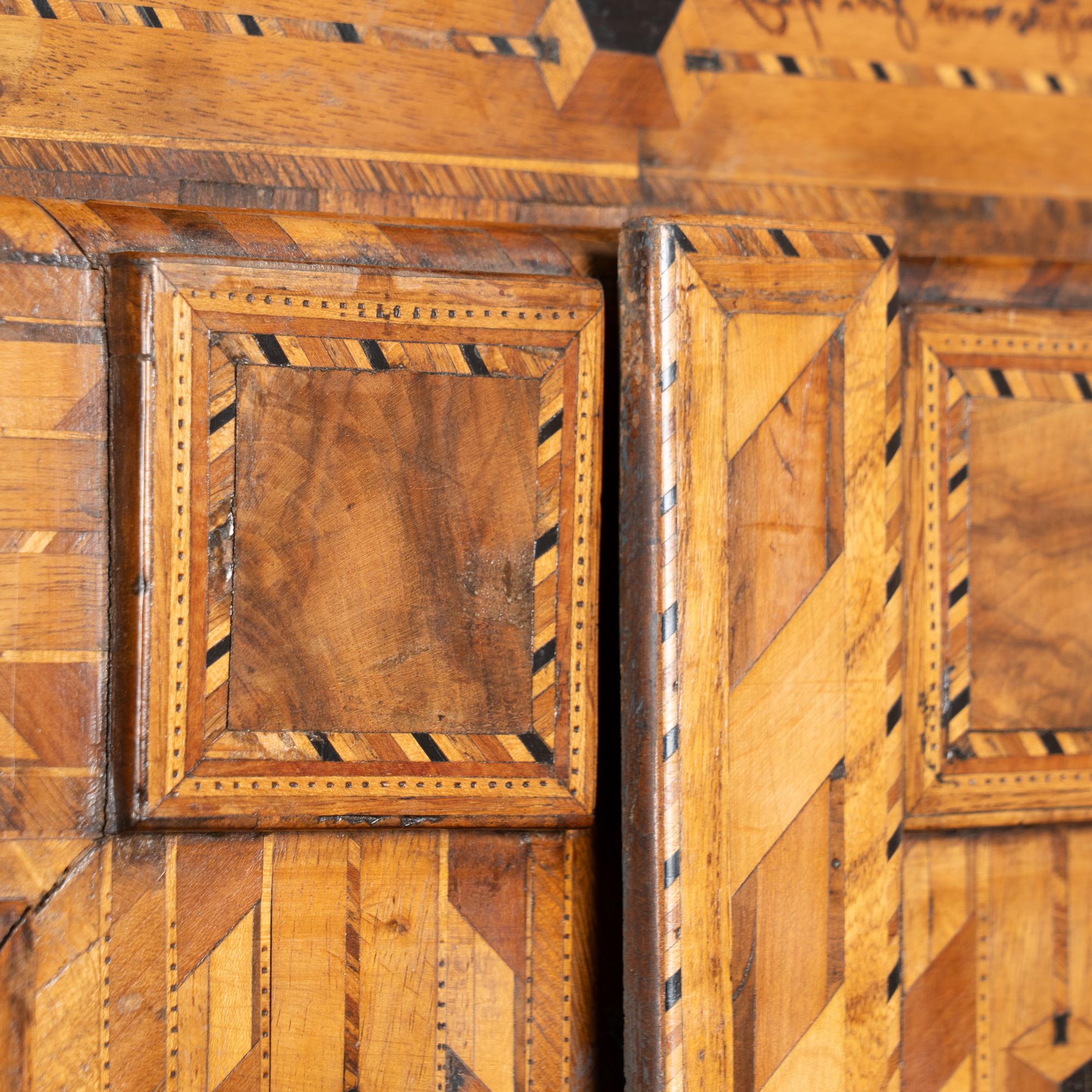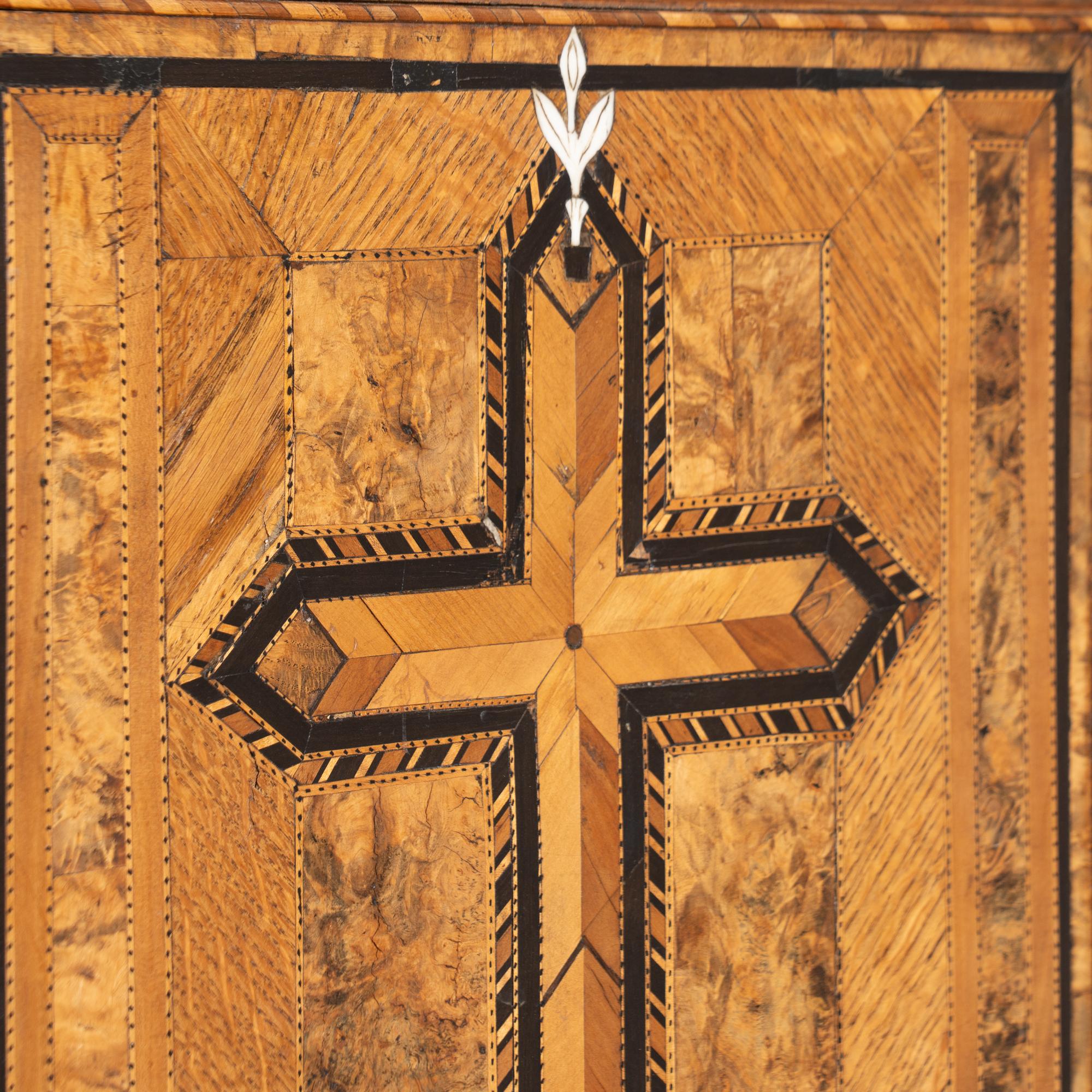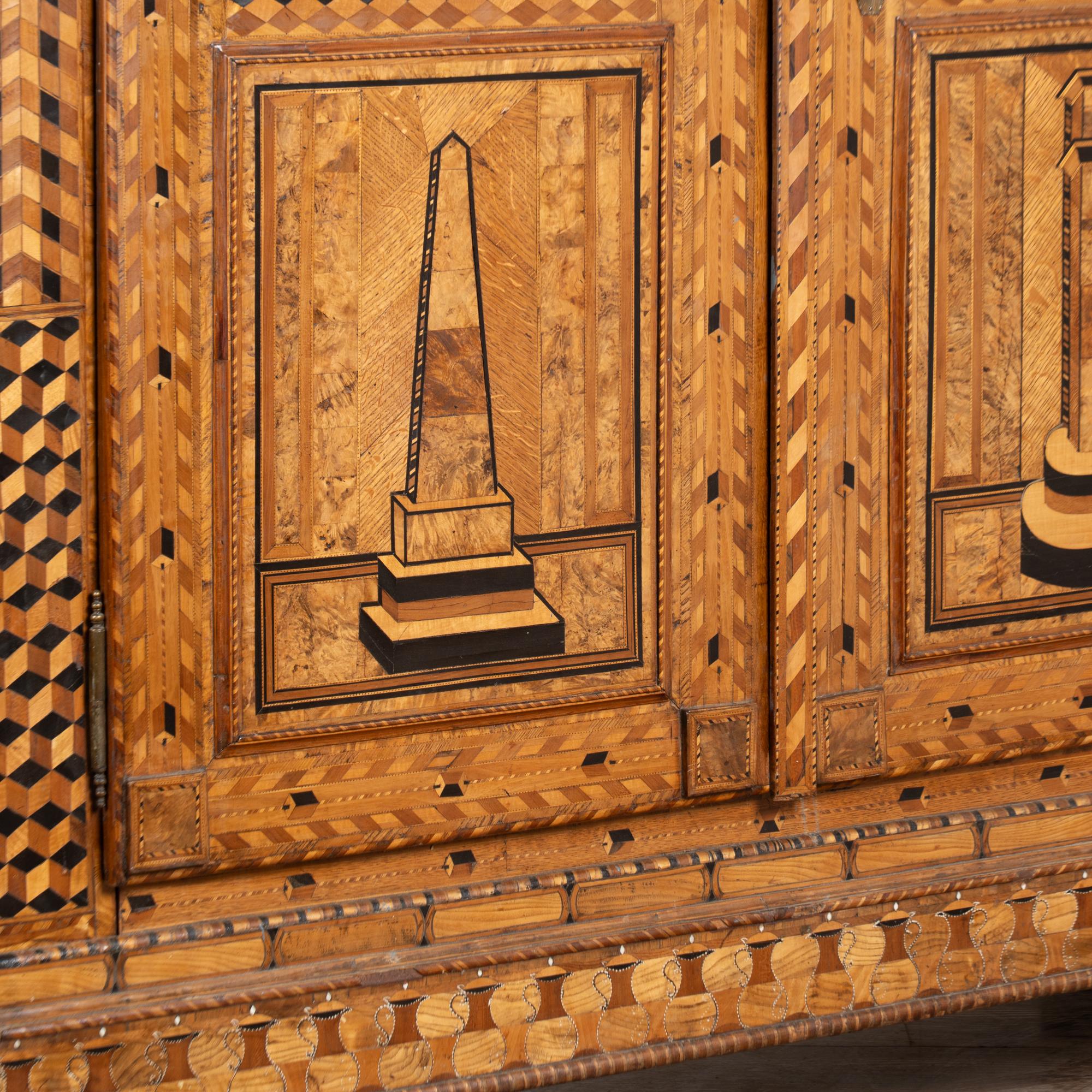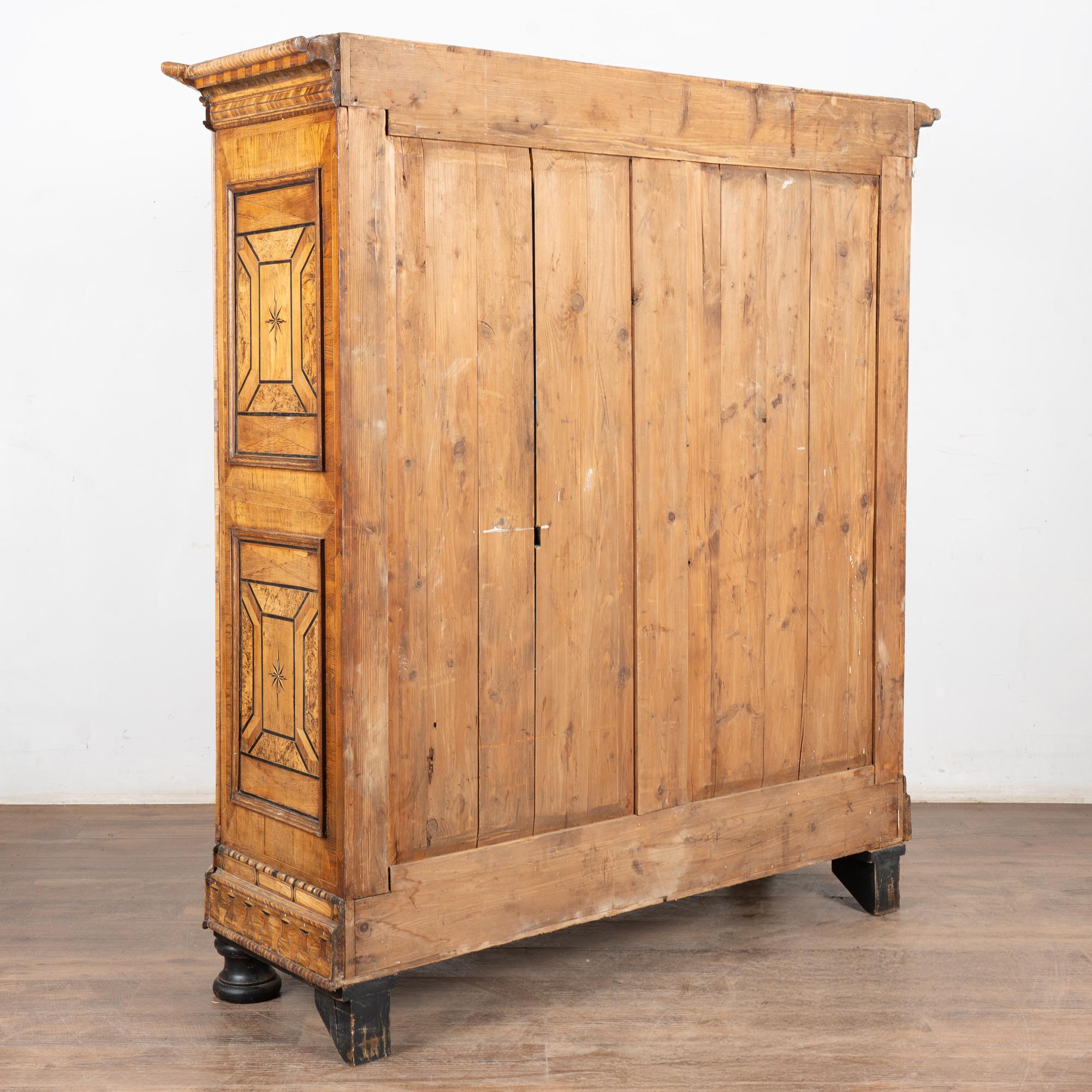 Examine all the photos to appreciate the complexity of the mesmerizing inlaid patterns, fox, cross, obelisk, delicate outlines, names and more (resting on newer feet). The prior owner indicated this armoire was acquired from a castle in Hungary.
