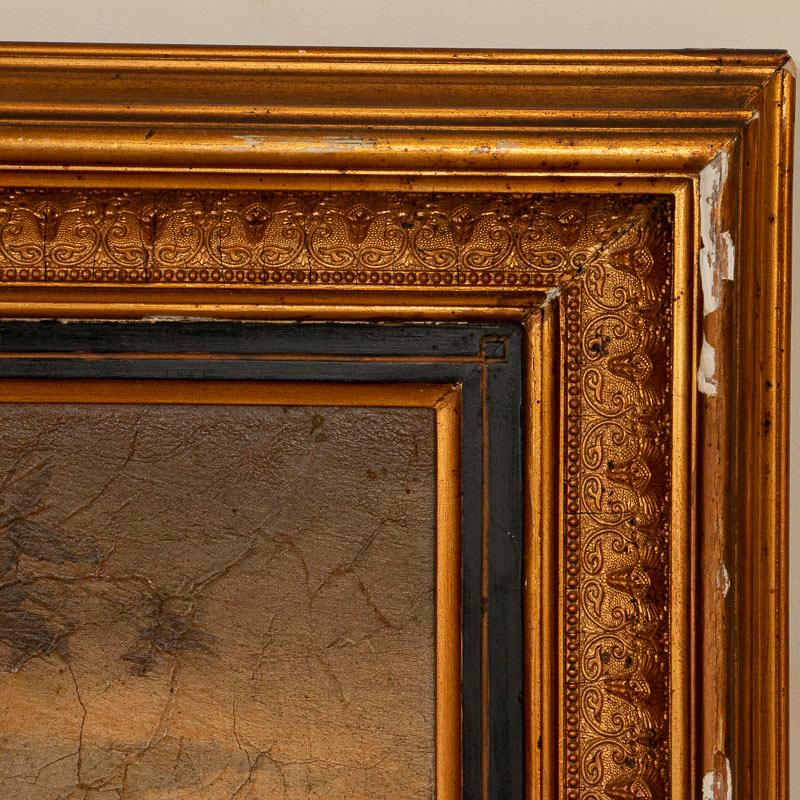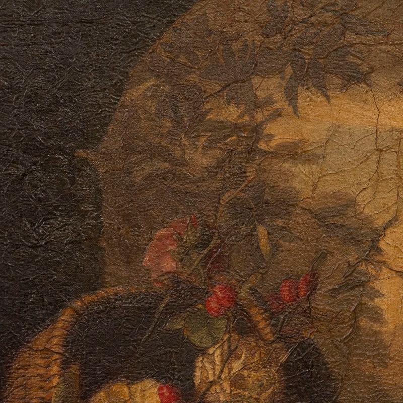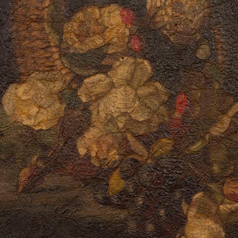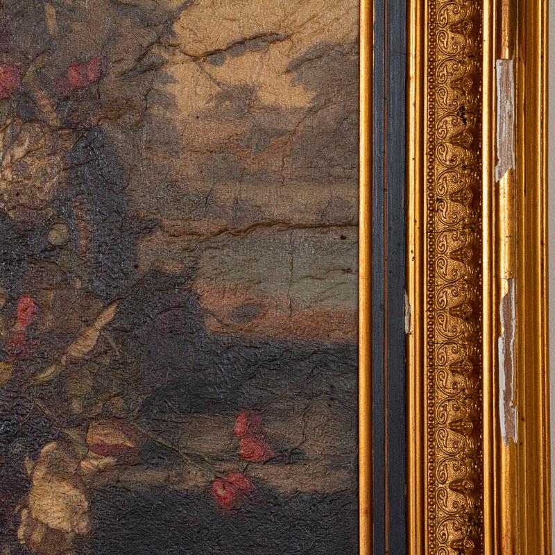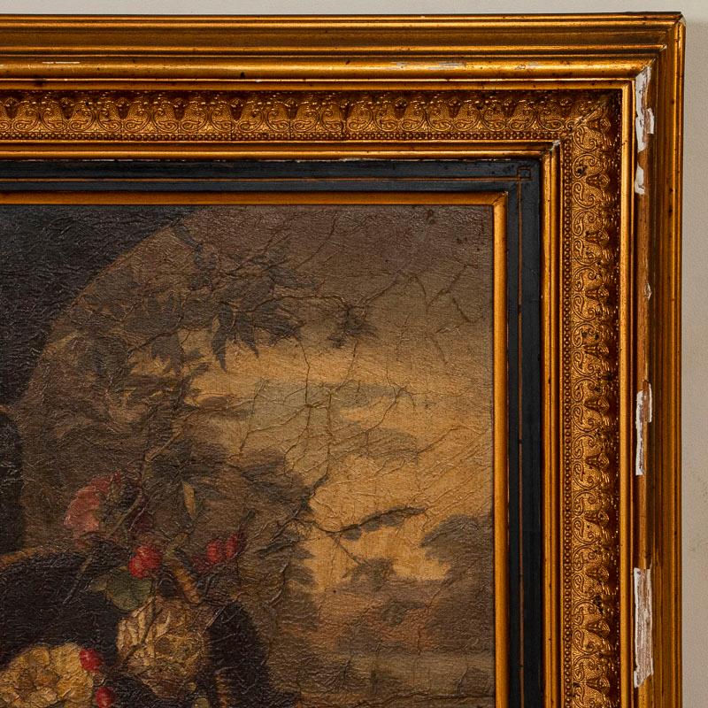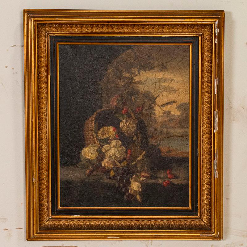 Unsigned still life oil on canvas of flowers and fruits in a basket from the mid to late 1800's. The basket appears to rest in a curved windowsill, with view of picturesque landscape in the distance. The thick paint reveals craquelure throughout the canvas while the gilt frame shows extensive wear and loss with gilt scraped and missing in multiple sections.