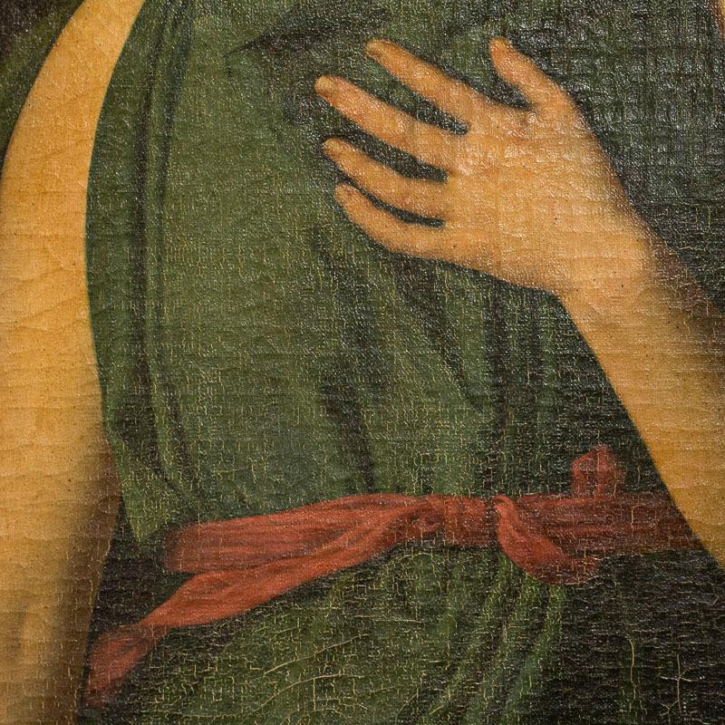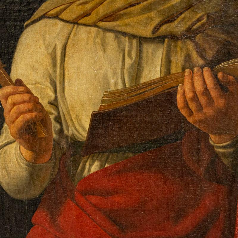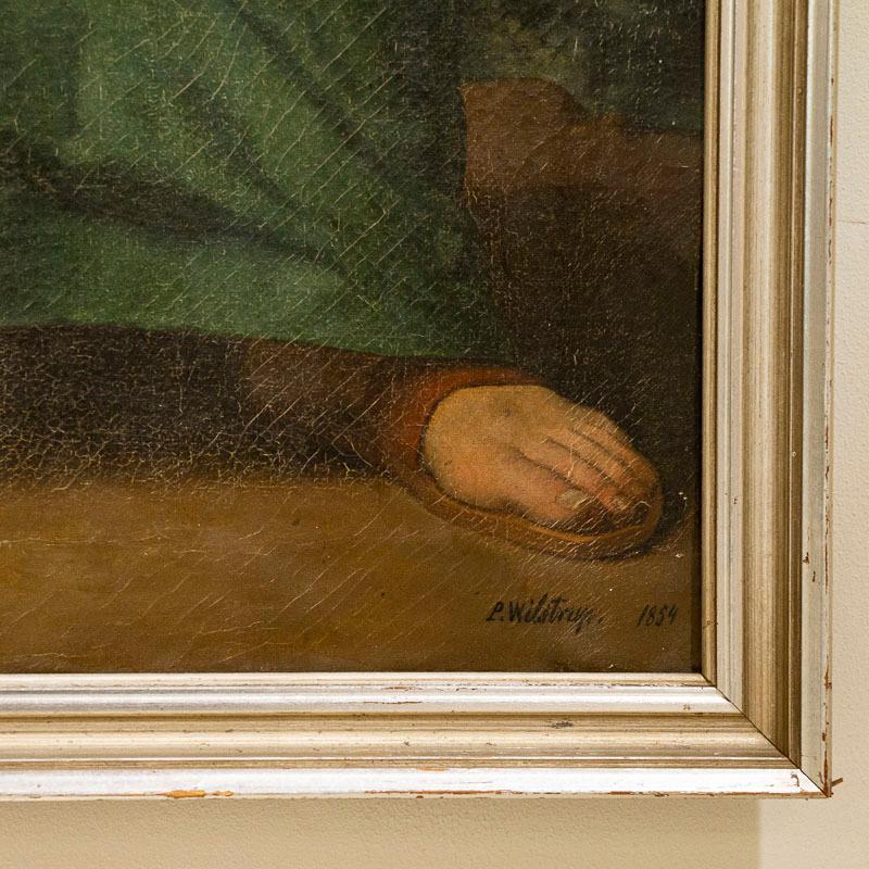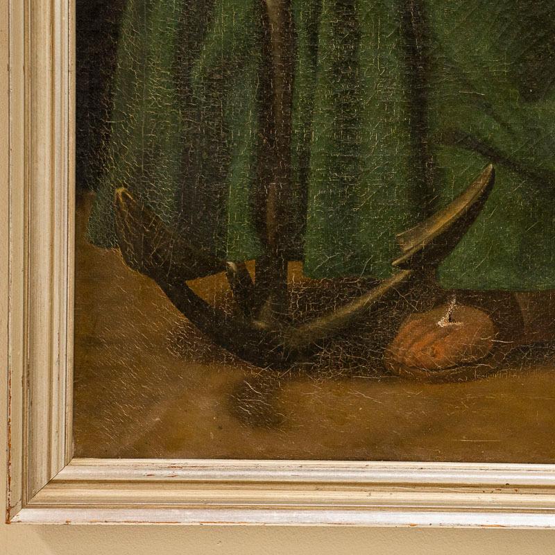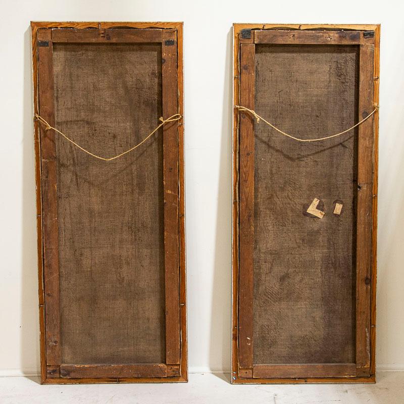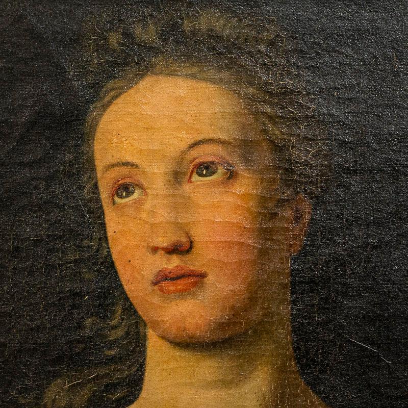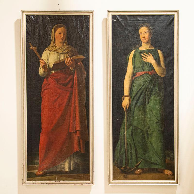 Two standing women symbolize faith and hope in this beautiful and dramatic pair of tall oil on canvas paintings.Vibrant colors and lovely lighting draw one to gaze at the expressions on each face. The lady in red gown is holding a cross, symbolizing faith while the woman in green holds an anchor, representing hope. They are signed and dated by the Danish artist, P. Wilstrup, 1854. Both canvases will benefit from a light surface cleaning which we leave to the discretion of the buyer. Cracqueleuer is seen throughout and some peeling in both, some retouches. "Hope" has repairs/patches seen on back and a pucture at foot by anchor. "Faith" has a pinhole. Please examine photos to understand condition; this stunning pair of religeous symbolic paintings are being sold in as is condition as we found them in Europe.
