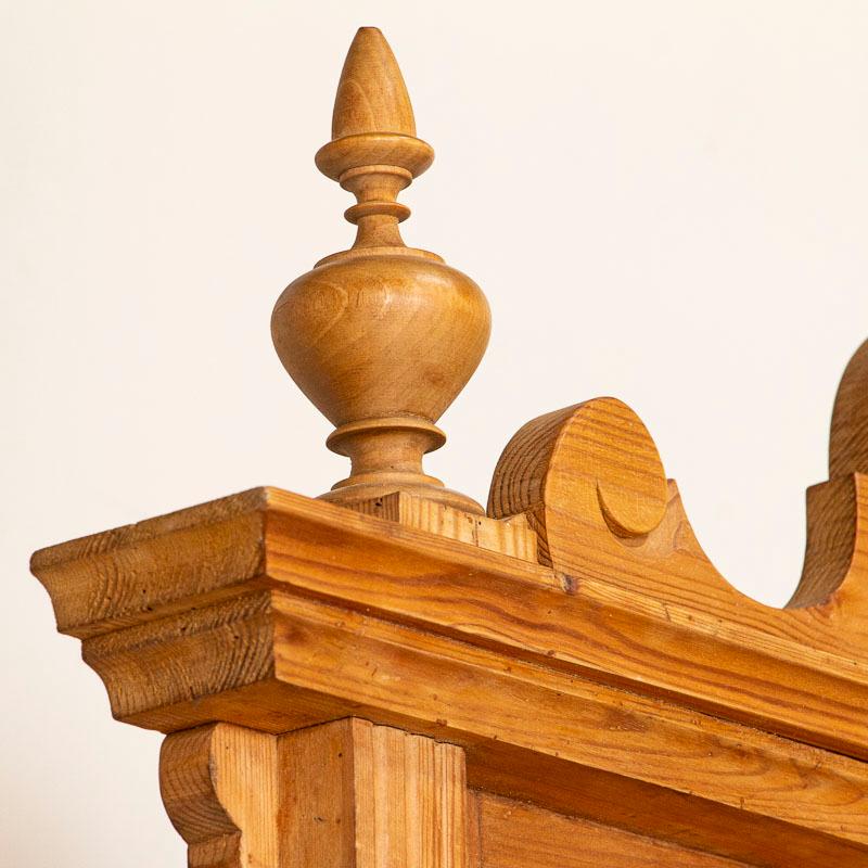 Decorative elements abound in this striking pine buffet server from the late 1800's. Turned columns, finials, and a mirror all add to the strong visual impact. The upper section has stylized shelving to show off items on display while the lower sideboard section has 2 drawers over 2 cabinet doors configuration. This pine buffet has been restored and waxed, so it is strong/stable and ready to be used. Any nicks, scratches, marks are age related and do not impact the function nor beauty of this sideboard.