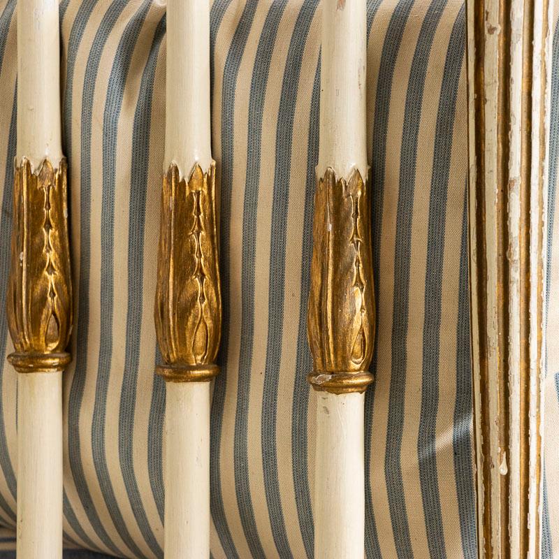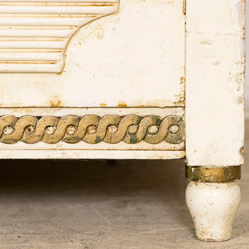 Painted white with gold accents, this antique Gustavian bench has a removeable cushion seat and open back. Architectural elements such as turned spindles create the sides and carved panels along the front add to the visual intrigue of this captivating bench. Please enlage the detailed photos to appreciate the aged, worn patina and Egyptian figural heads that adorn the front. The bench seat is removeable as seen in the photos. This bench is solid, stable and ready to be used but has not been restored. As the original fabric is still in place, the buyer will likely choose to re-upholster. Crackles and distress to the paint are reflections of generations of use that add to the character of this lovely bench.