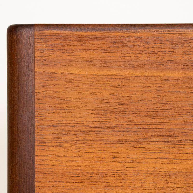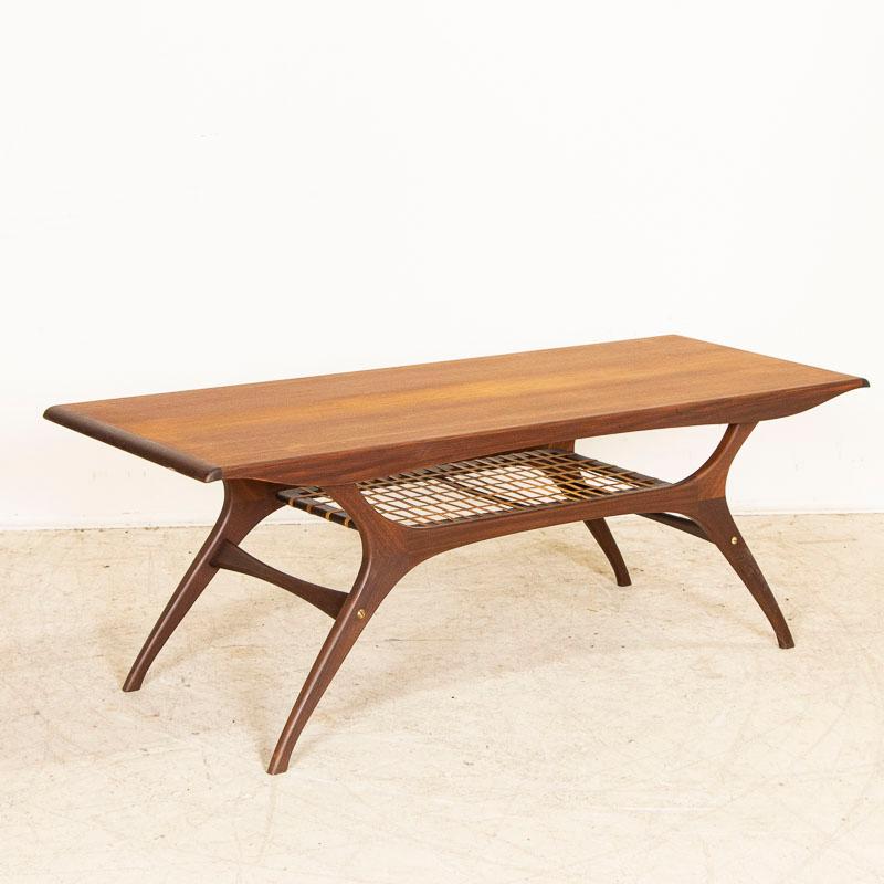 Sleek lines define this attractive mid-century modern teak coffee table from Denmark. The rattan/wicker shelf adds both function and visual intrigue. Please enlarge photos to examine the details. Wood shows wear commensurate with age including minor scuffs, scratches. This coffee table is sold in solid, stable used condition and is ready to place and enjoy.