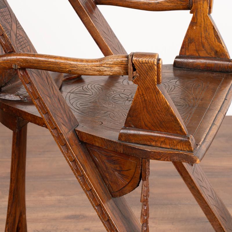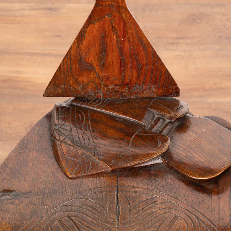 This fascinating rustic chair has a traditional tri-leg design with extensive hand-carved details, including scroll work along the seat and names that frame the back. Please examine the close up photos to appreciate the numerous carved aspects and unique hand-crafted workmanship of this truly one of a kind chair. With an almost sculpted aspect, this side chair will be a wondeful addition to any home; it is restored, strong, and ready for use. Any nicks, scratches, dings or signs of wear are commensurate with age and do not detract from the function nor form of this unique tri-legged chair. Seat Height: 18"
