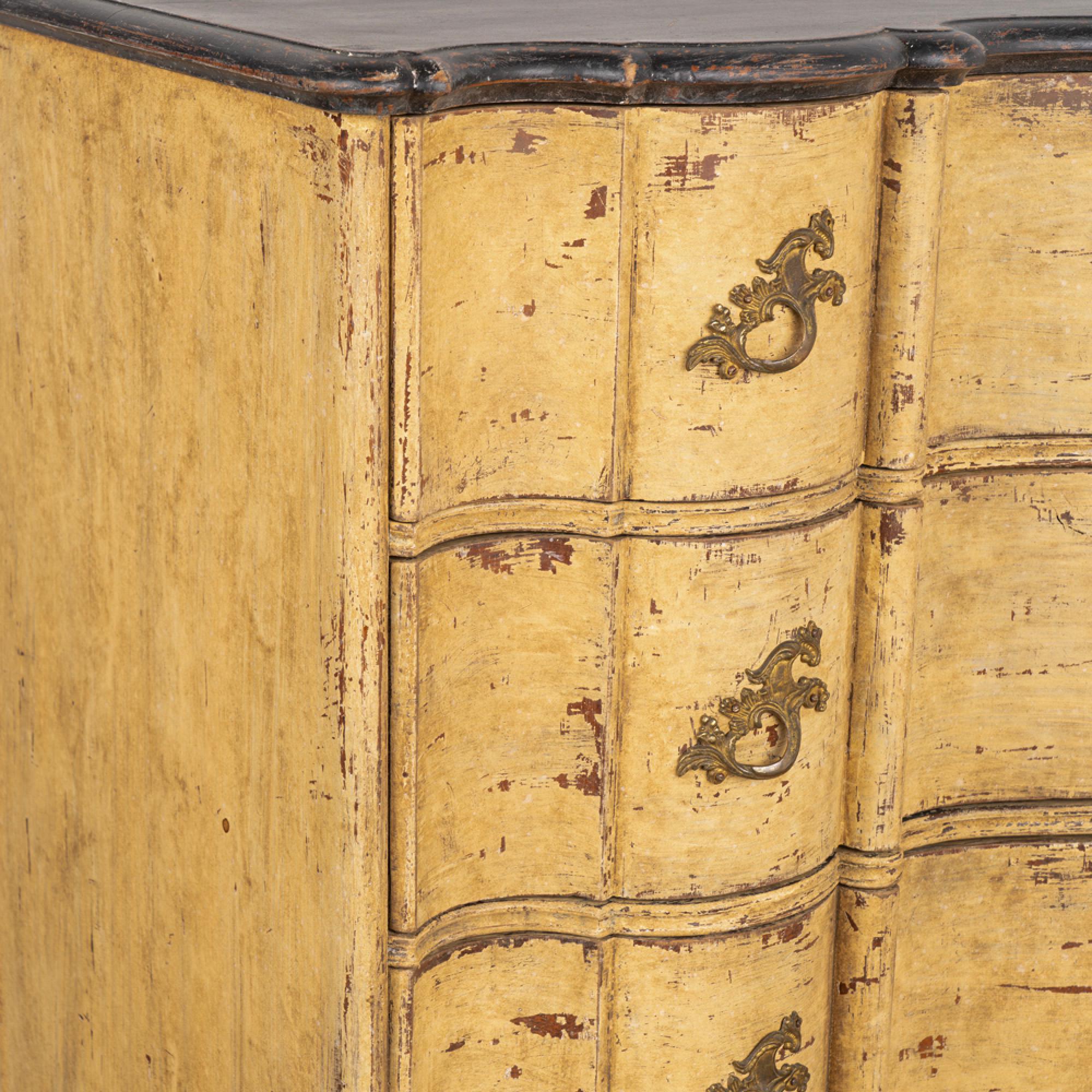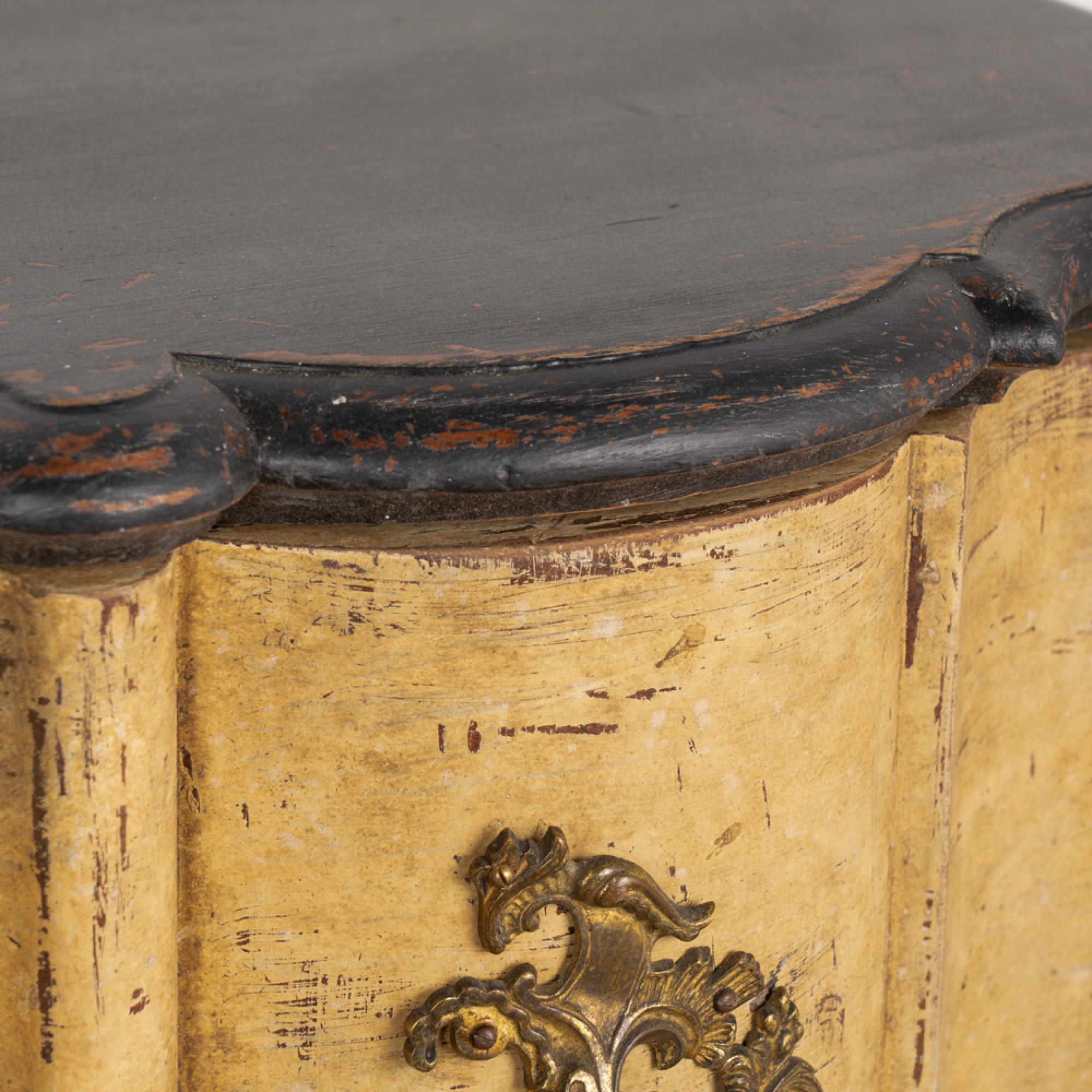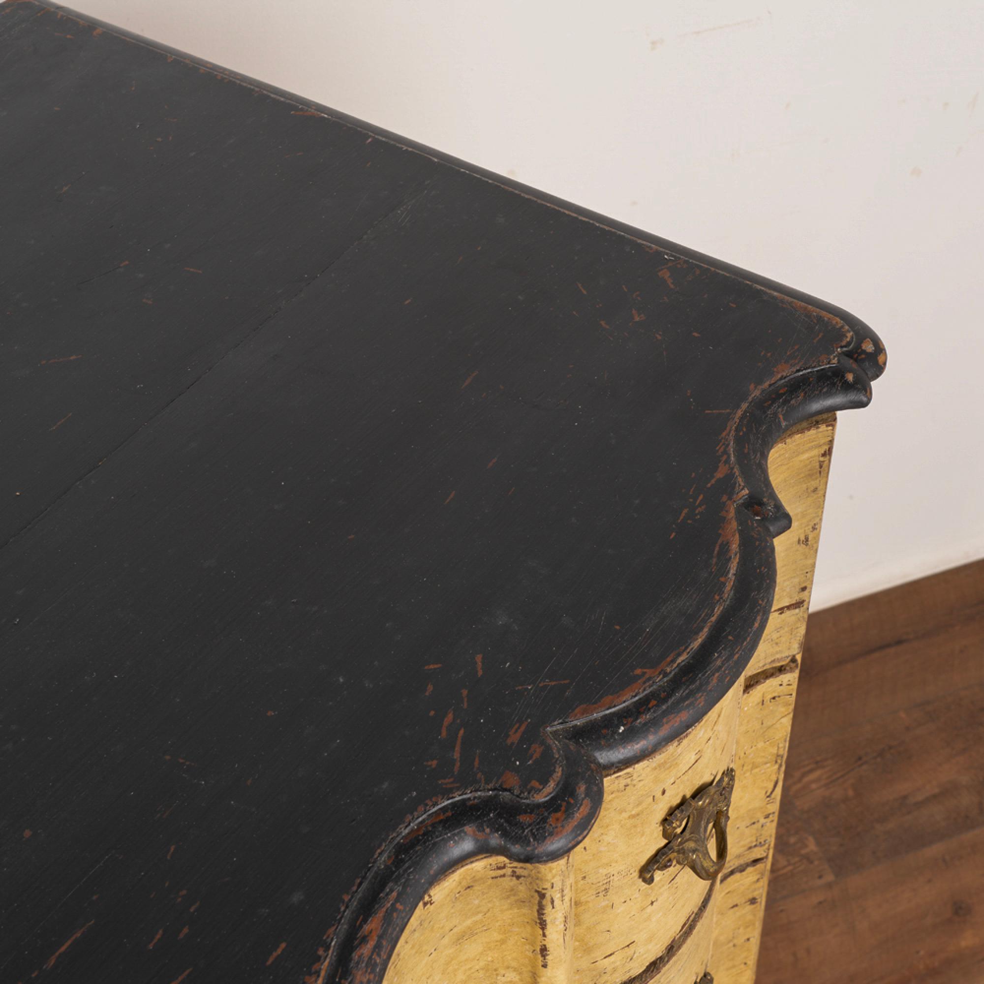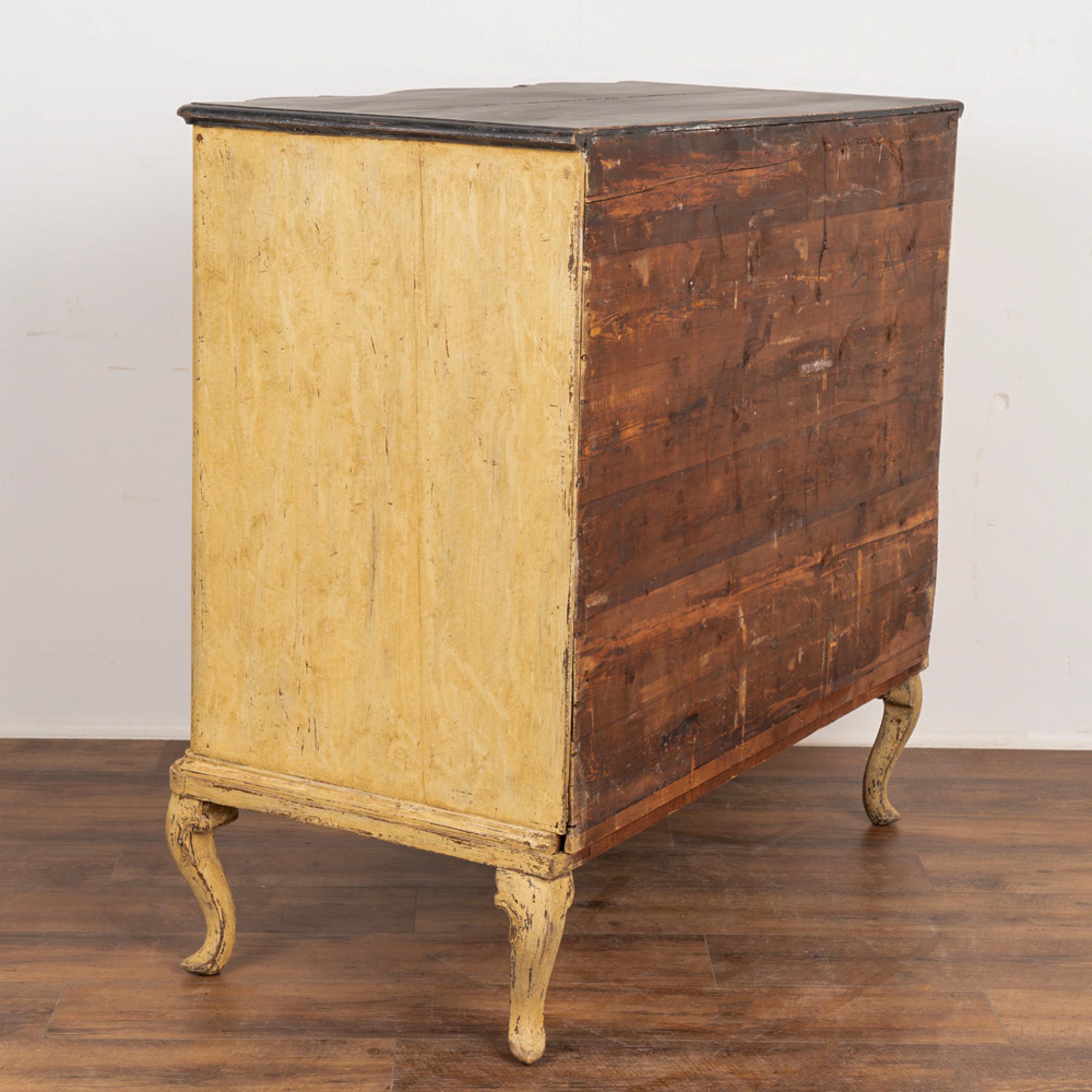 Newer professionally applied layered paint of burnished yellow, with undertones of brown and gray that create an overall muted tone. Top painted in a contrasting black, entire chest lightly distressed to fit the age and character of the chest.