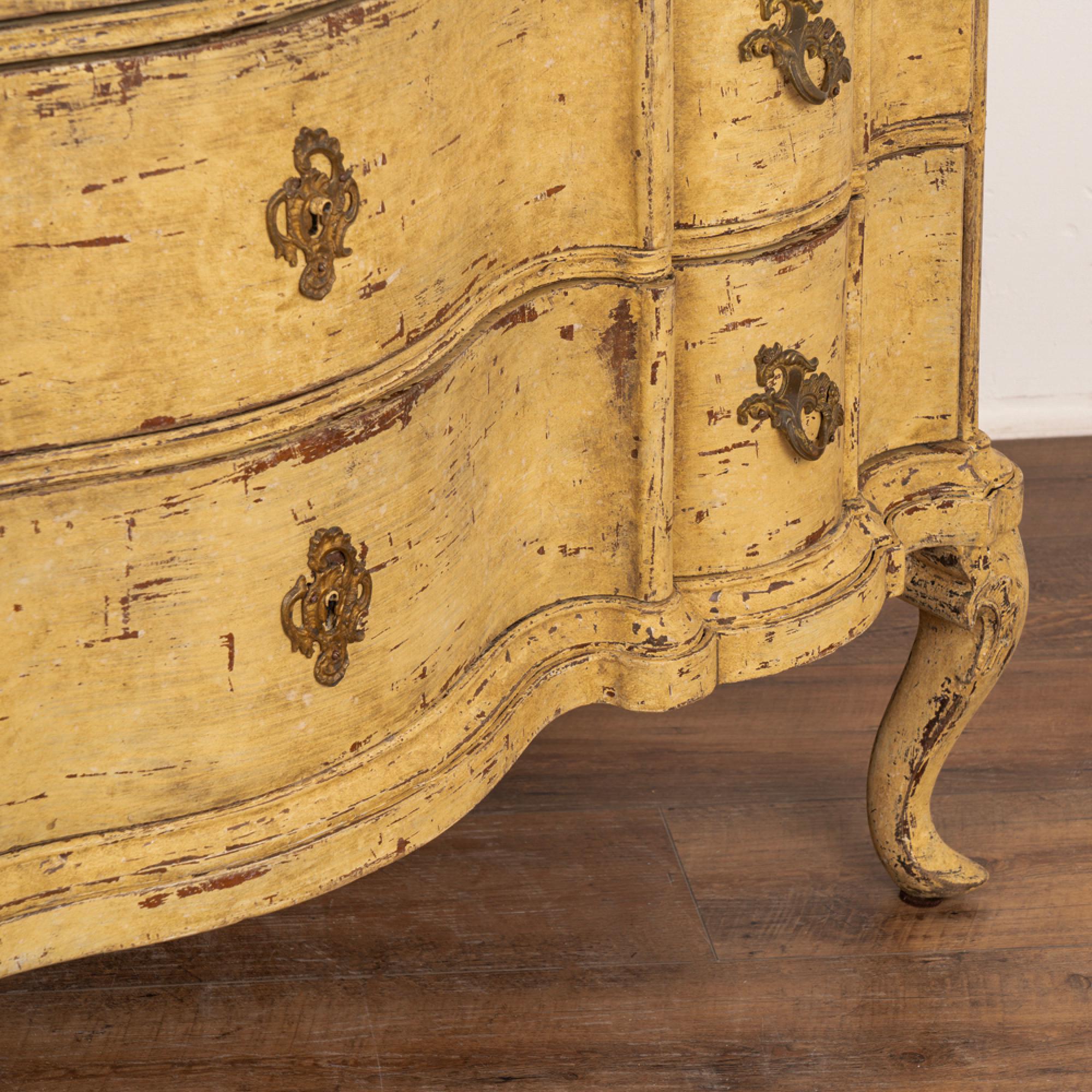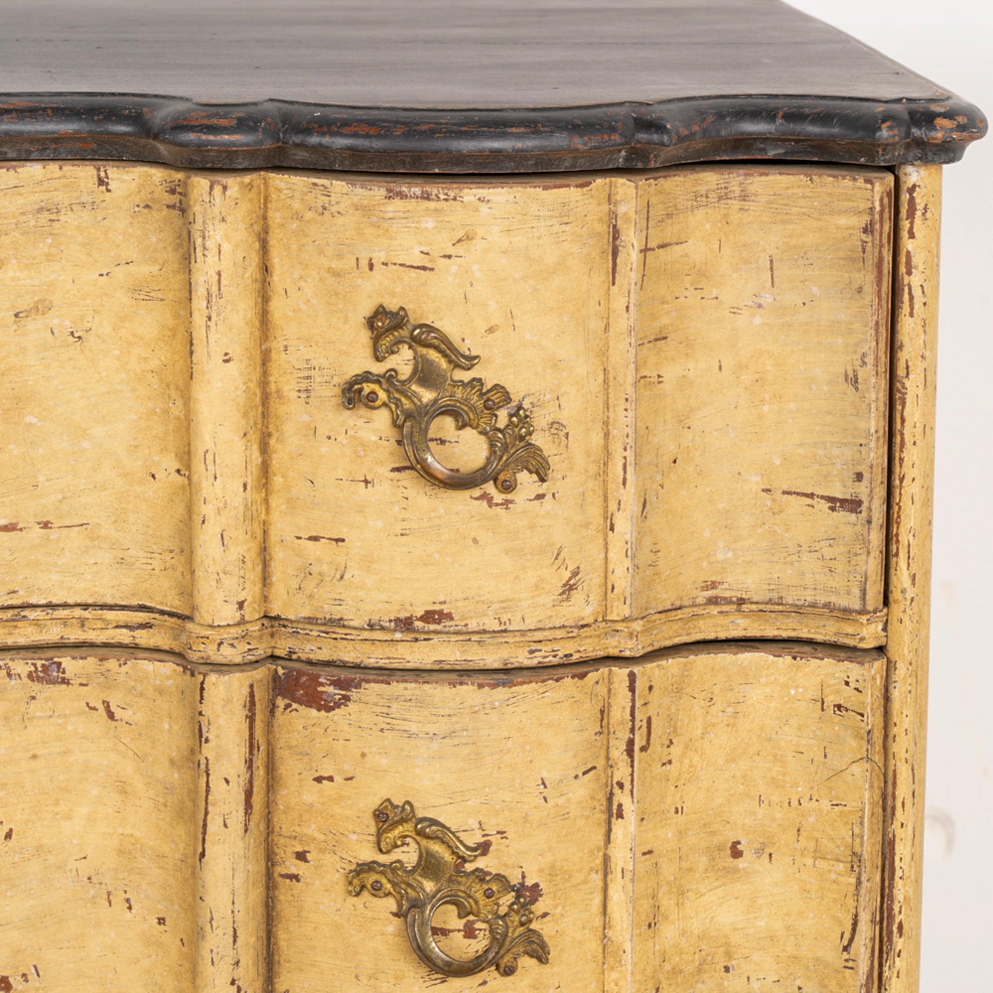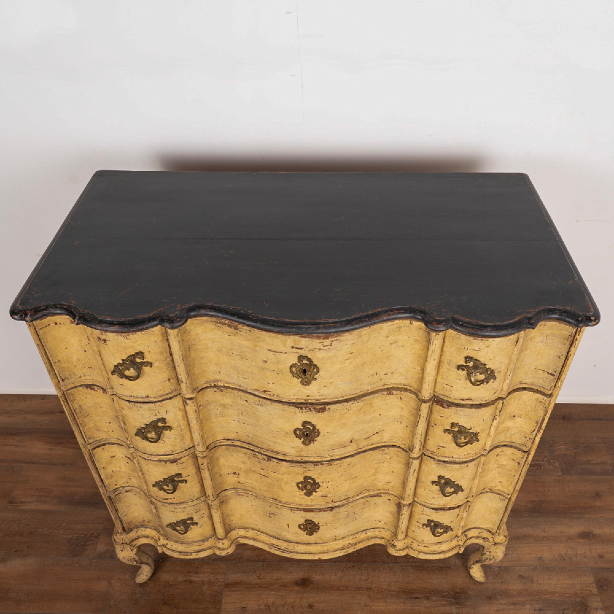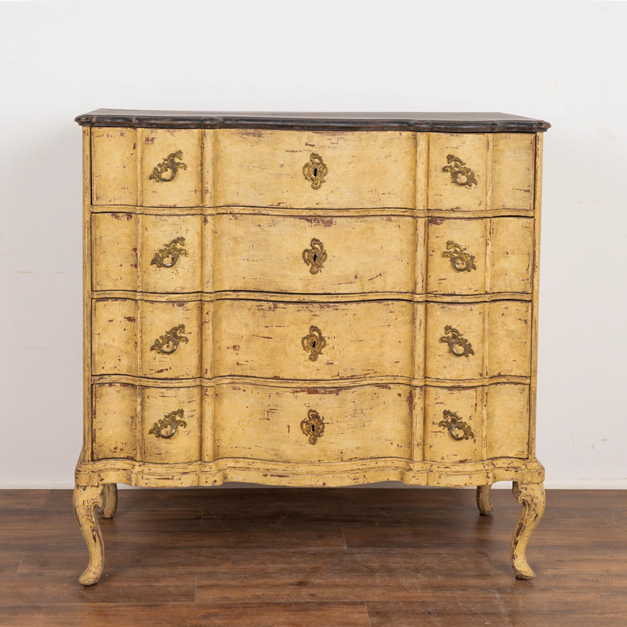 Newer professionally applied layered paint of burnished yellow, with undertones of brown and gray that create an overall muted tone. Top painted in a contrasting black, entire chest lightly distressed to fit the age and character of the chest.