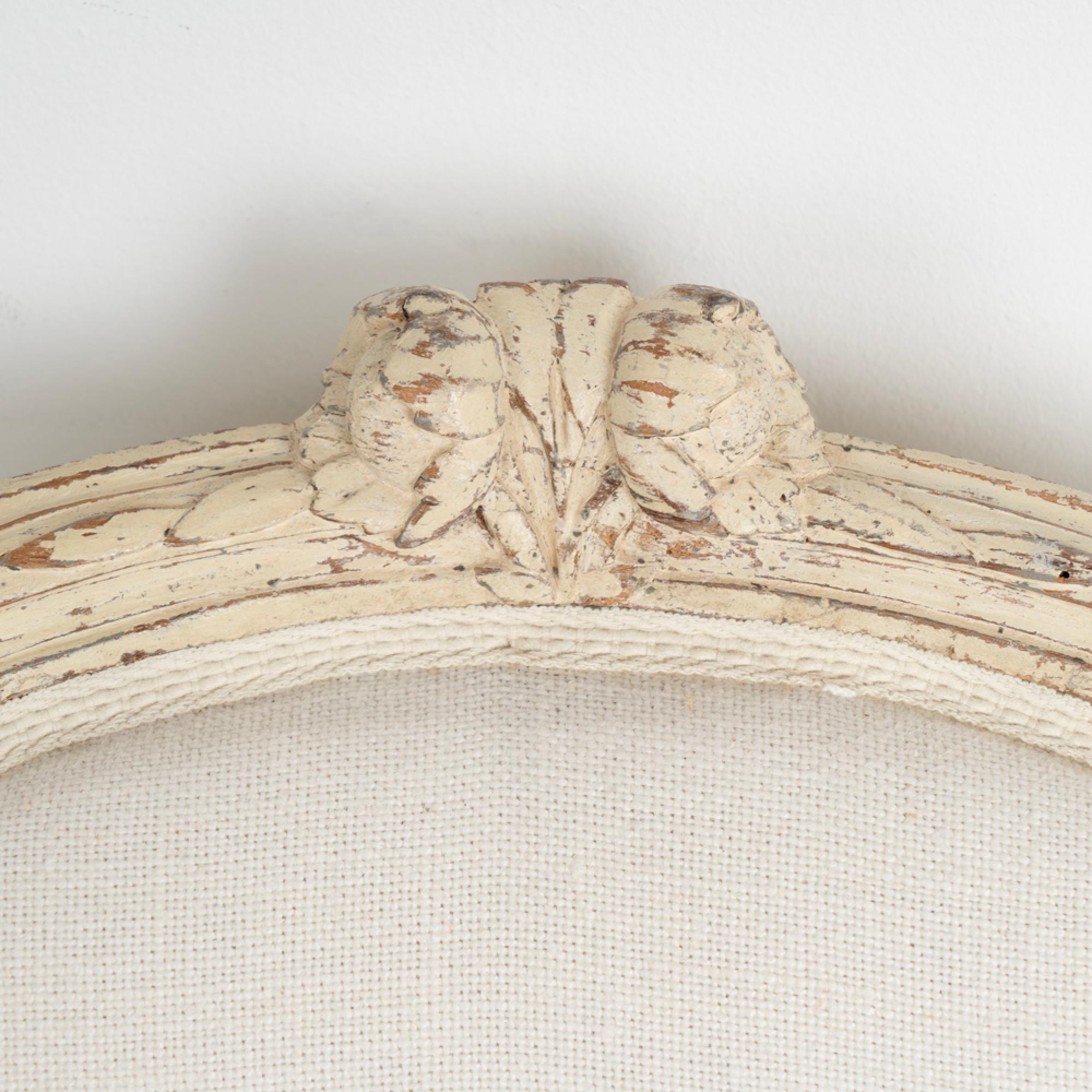 White painted finish distressed fitting the age and grace of these lovely arm chairs.