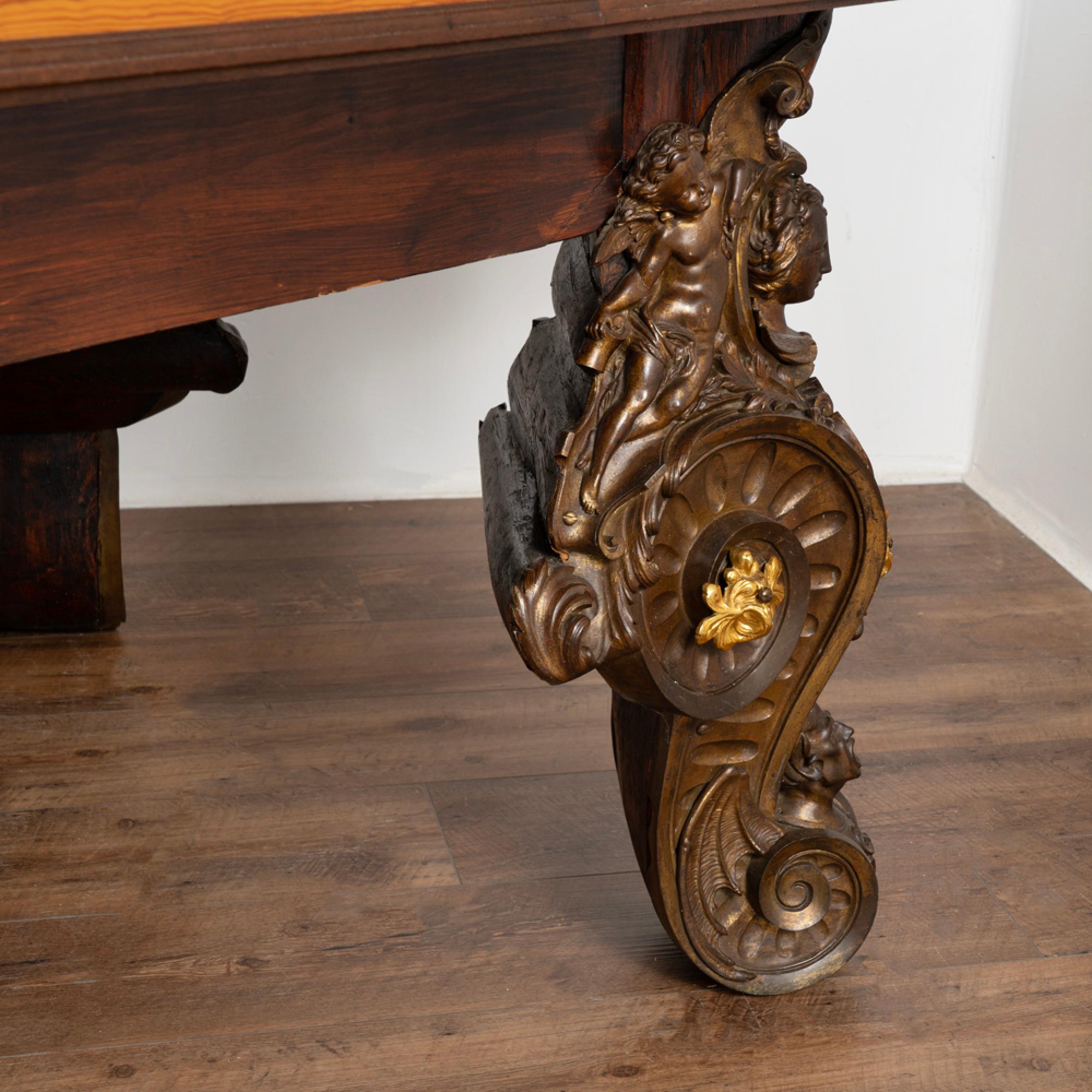 Large decorative entryway table with oak wood, rosewood and mahogany top and elaborate bronze legs with patina. Sold in used vintage condition. Table top (which is removeable) shows typical signs of wear for age including minor scratches, nicks, staining, etc.