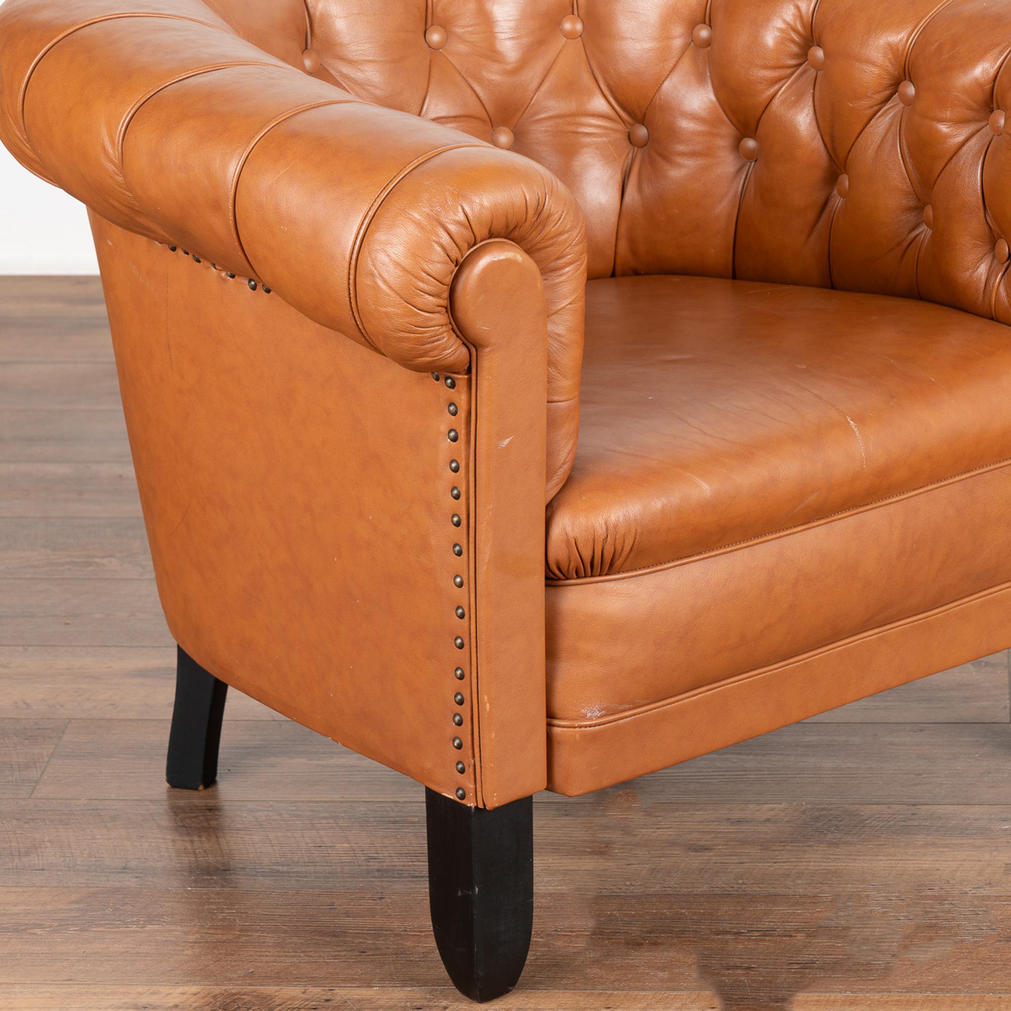 Upholstered club chairs in button-tufted cognac leather, rolled arms and nailhead trim along sides.
