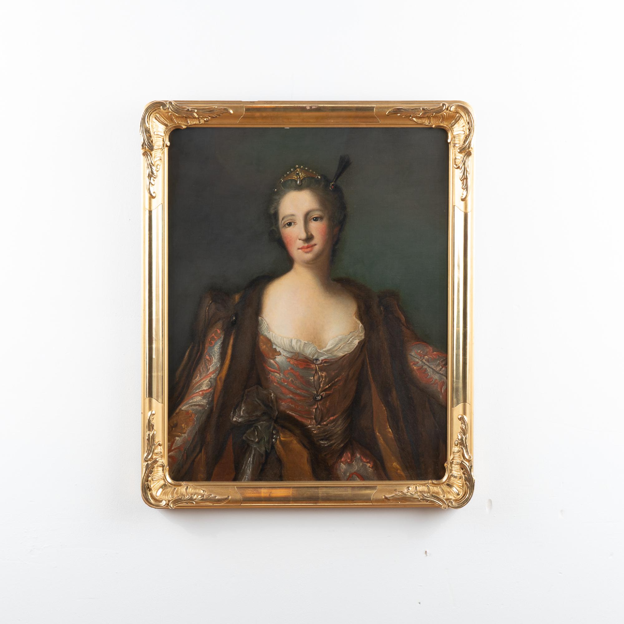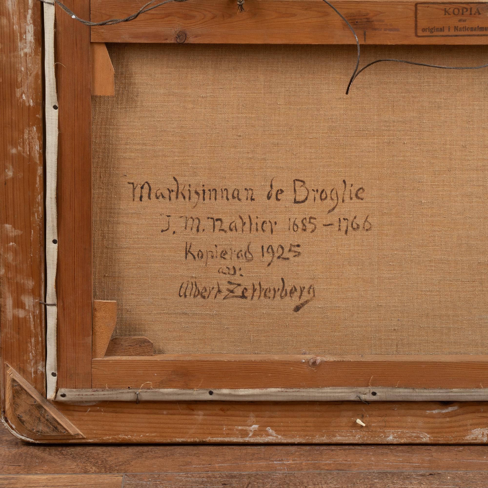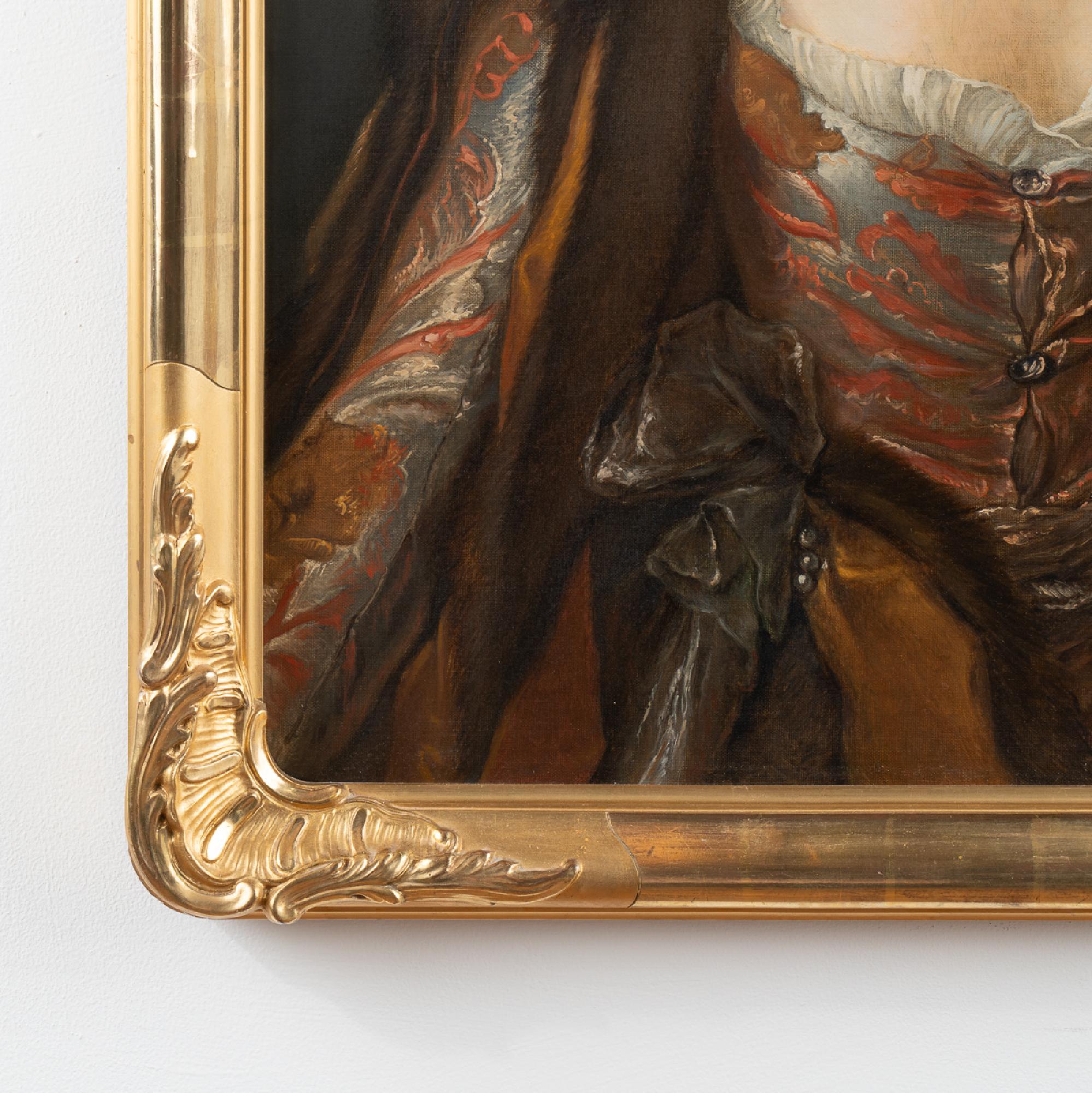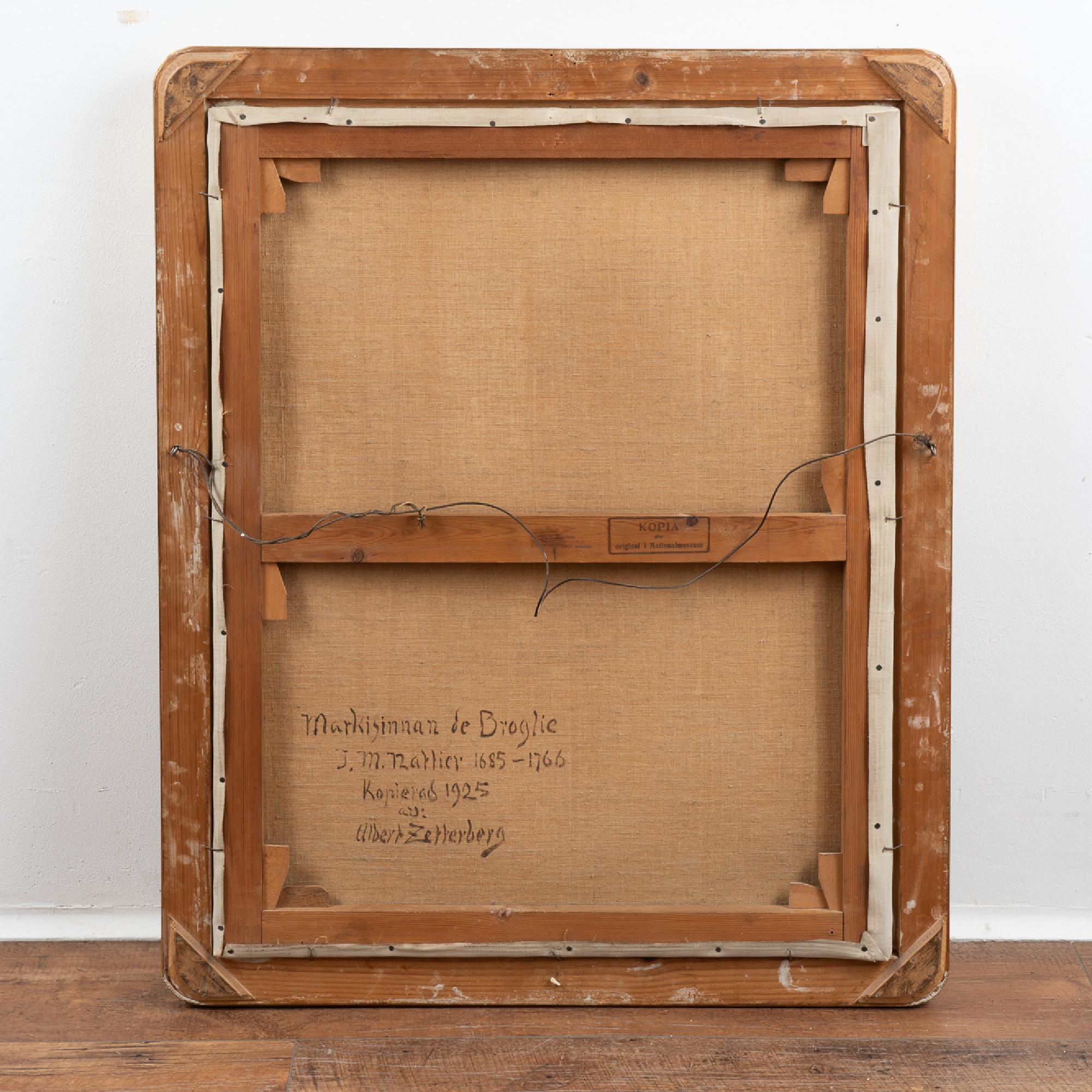 An original oil on canvas portrait of Marquise de Broglie (1718-1777). The original portrait by Jean Marc Nattier (1685-1766) hangs in the National Museum in Stockholm, while this reproduction was painted by Albert Zetterberg, 1925.