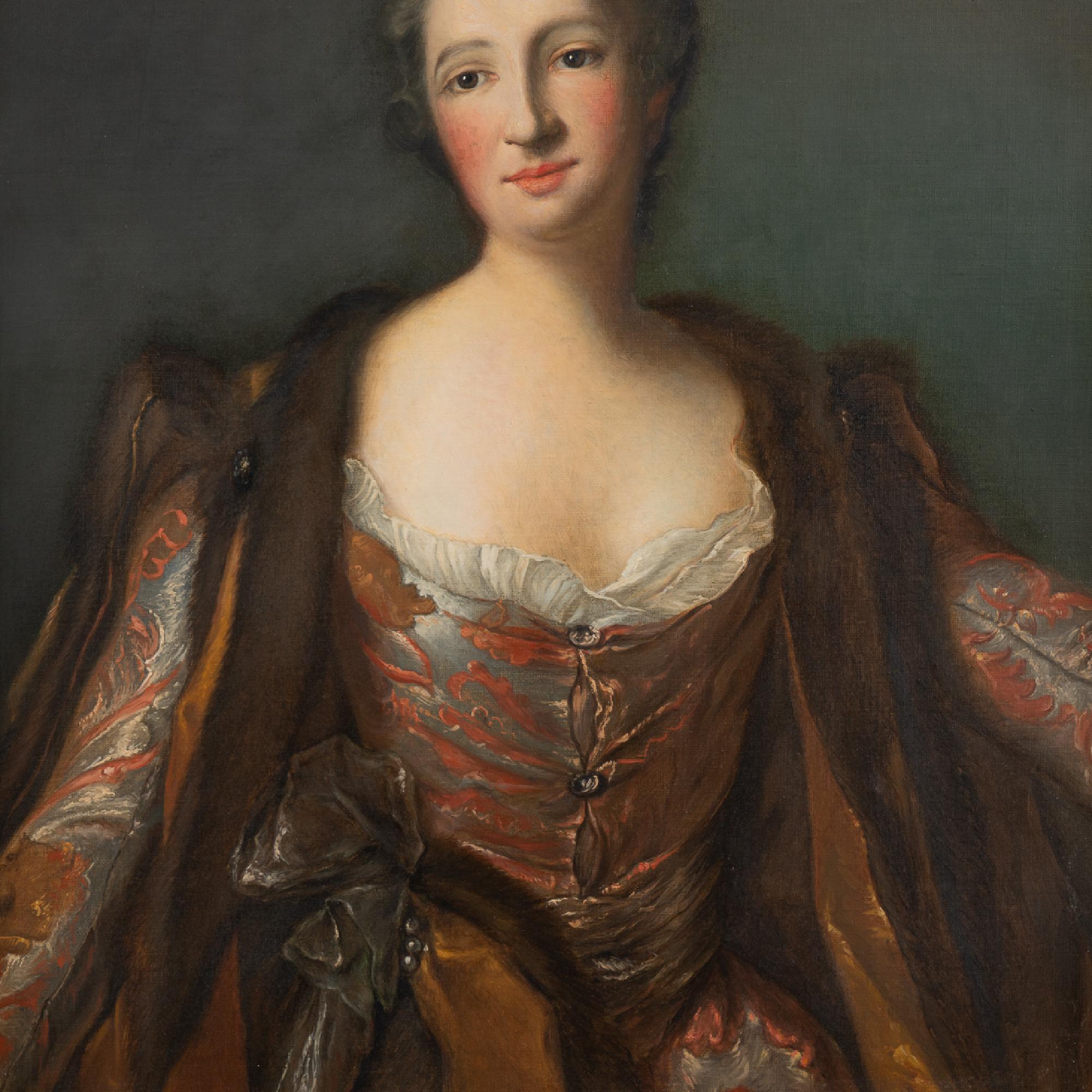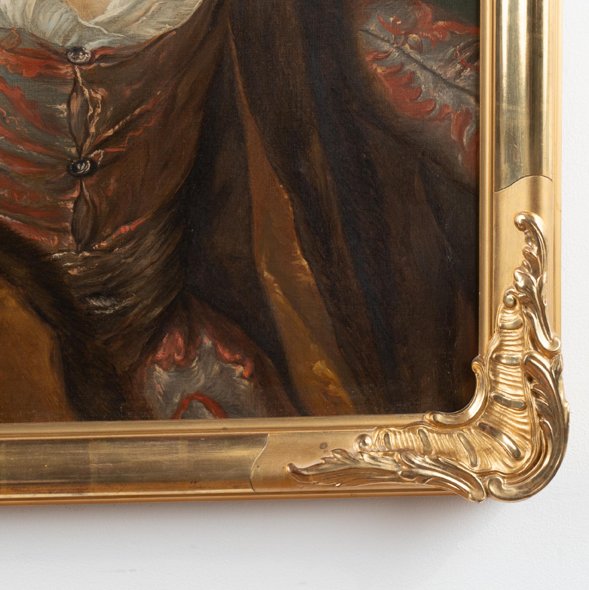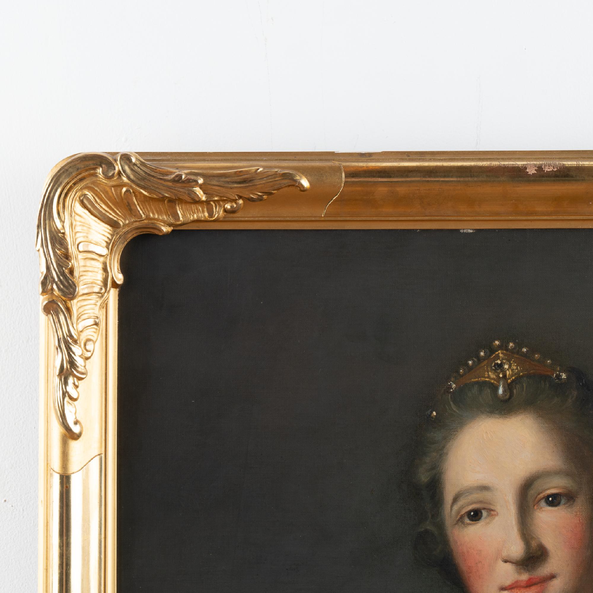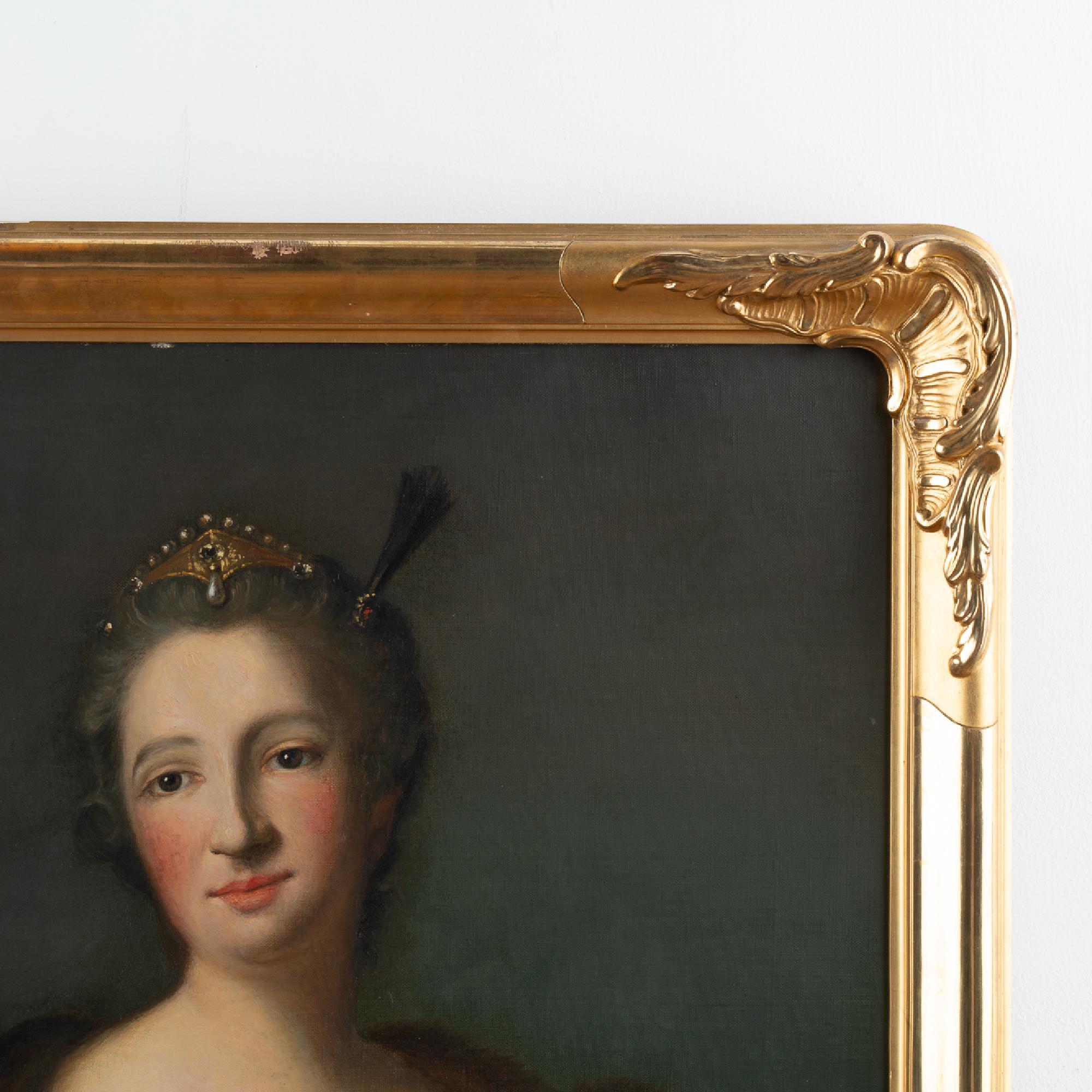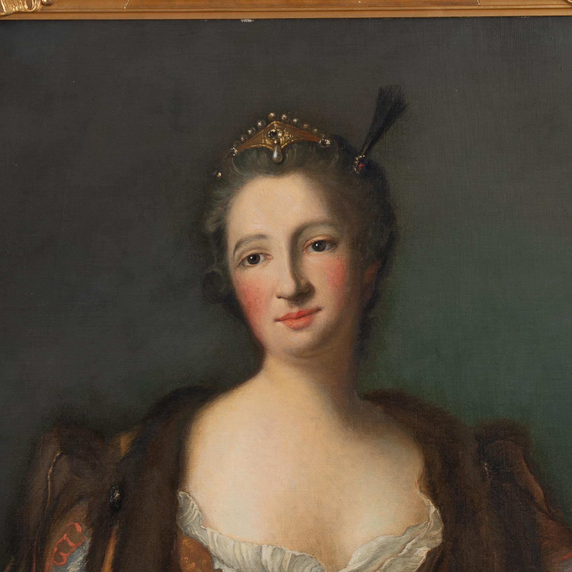 An original oil on canvas portrait of Marquise de Broglie (1718-1777). The original portrait by Jean Marc Nattier (1685-1766) hangs in the National Museum in Stockholm, while this reproduction was painted by Albert Zetterberg, 1925.
