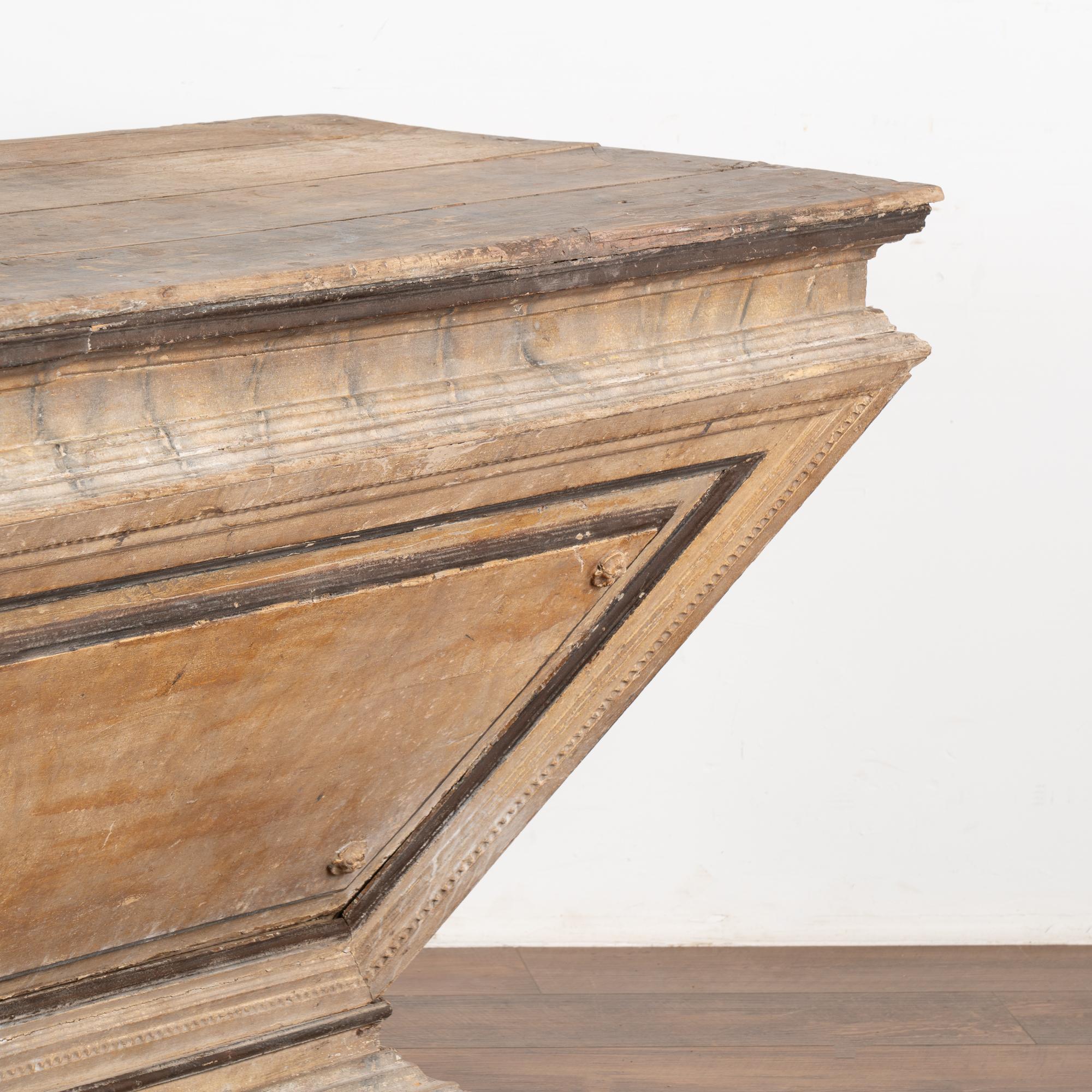 This impressive console will make a grand statement in any home. The uniquely shaped wood base was hand-painted; one can still see the faux marble design that was a traditional style element of the era. The original paint has faded and been distressed through generations of use. The overall gray finish shows undertones of brown and green, trimmed in a dark brown/black tone.