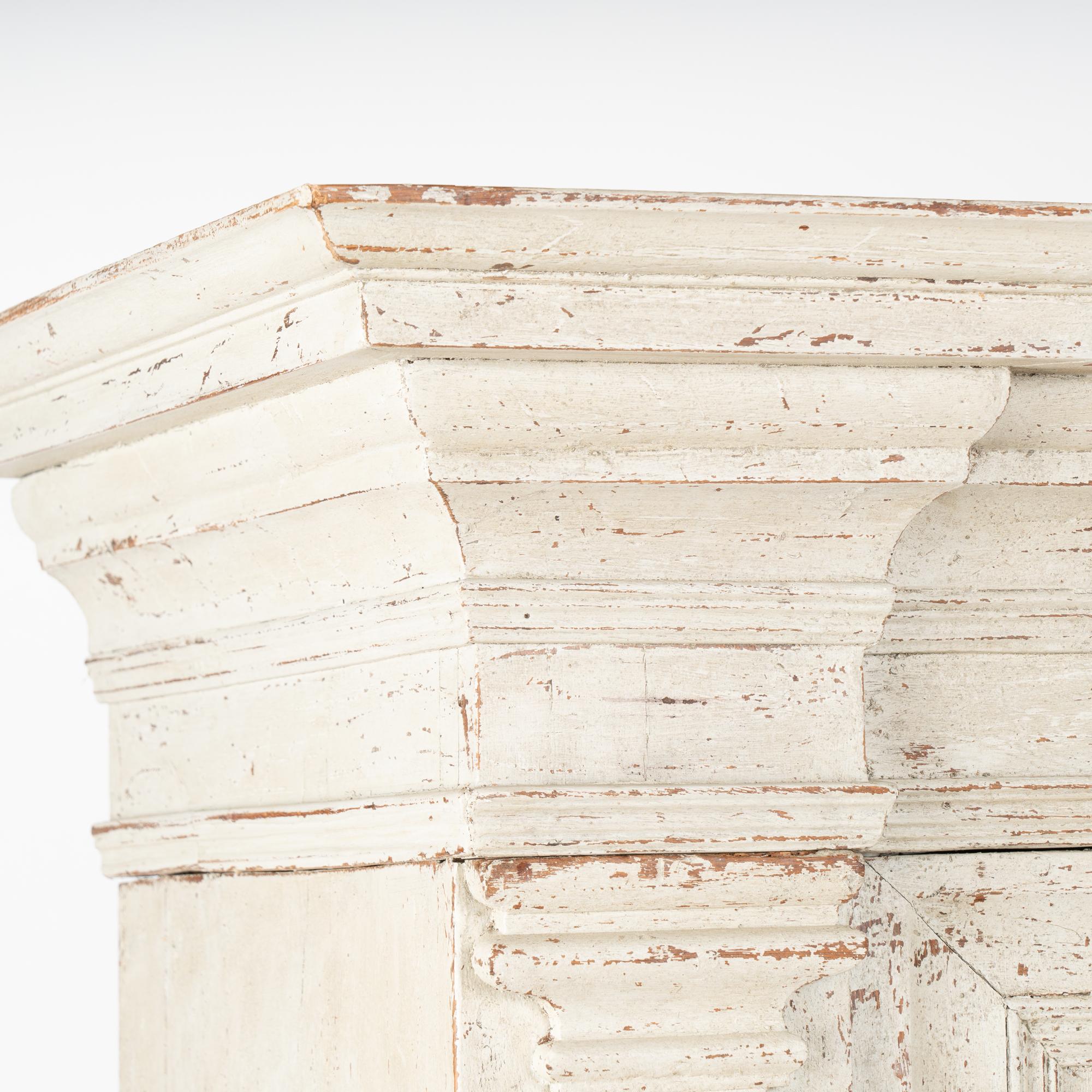 Restored, later professionally painted in layered shades of antique white and light gray; all lightly distressed to fit the age of this stately armoire.